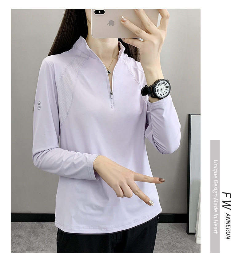 야외 스포츠 빠른 건조 티셔츠 봄과 가을 여름 빛 탄성 스포츠 통기성 여성 긴팔 선 스크린 수직 칼라가있는 빠른 건조 탑