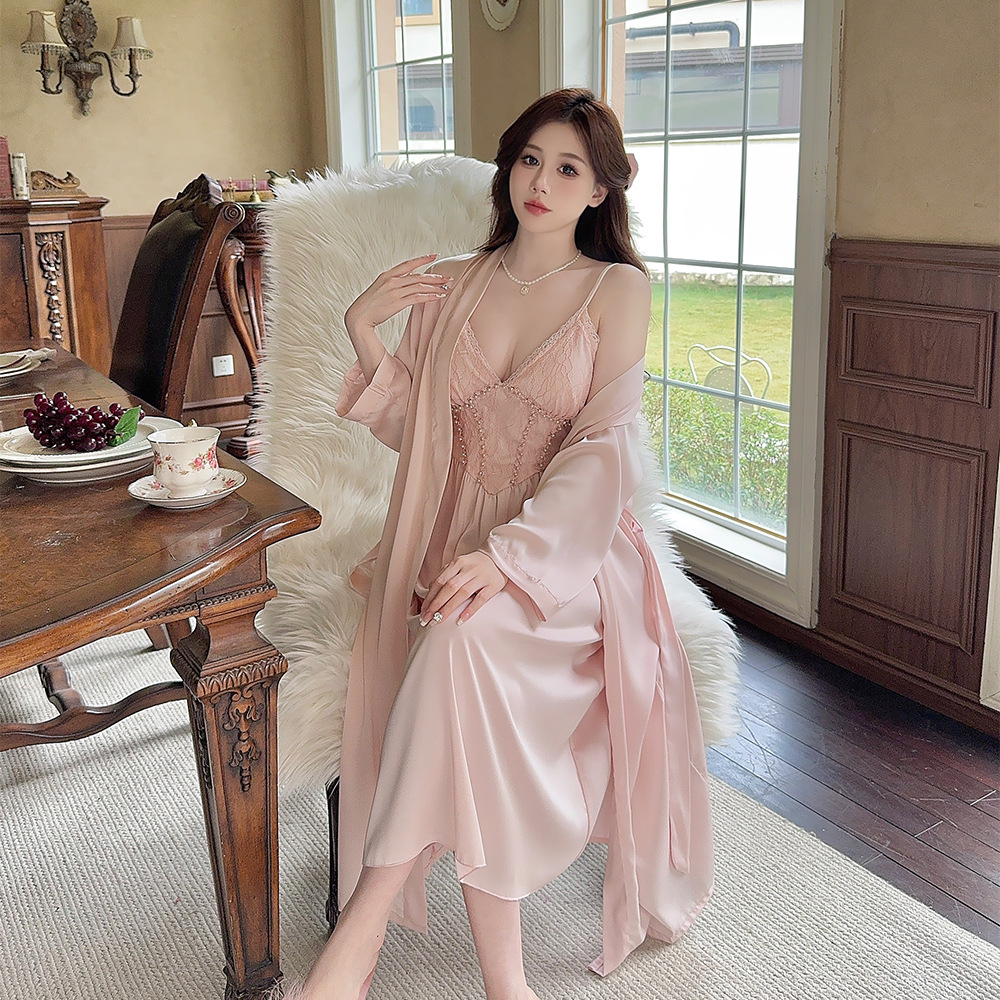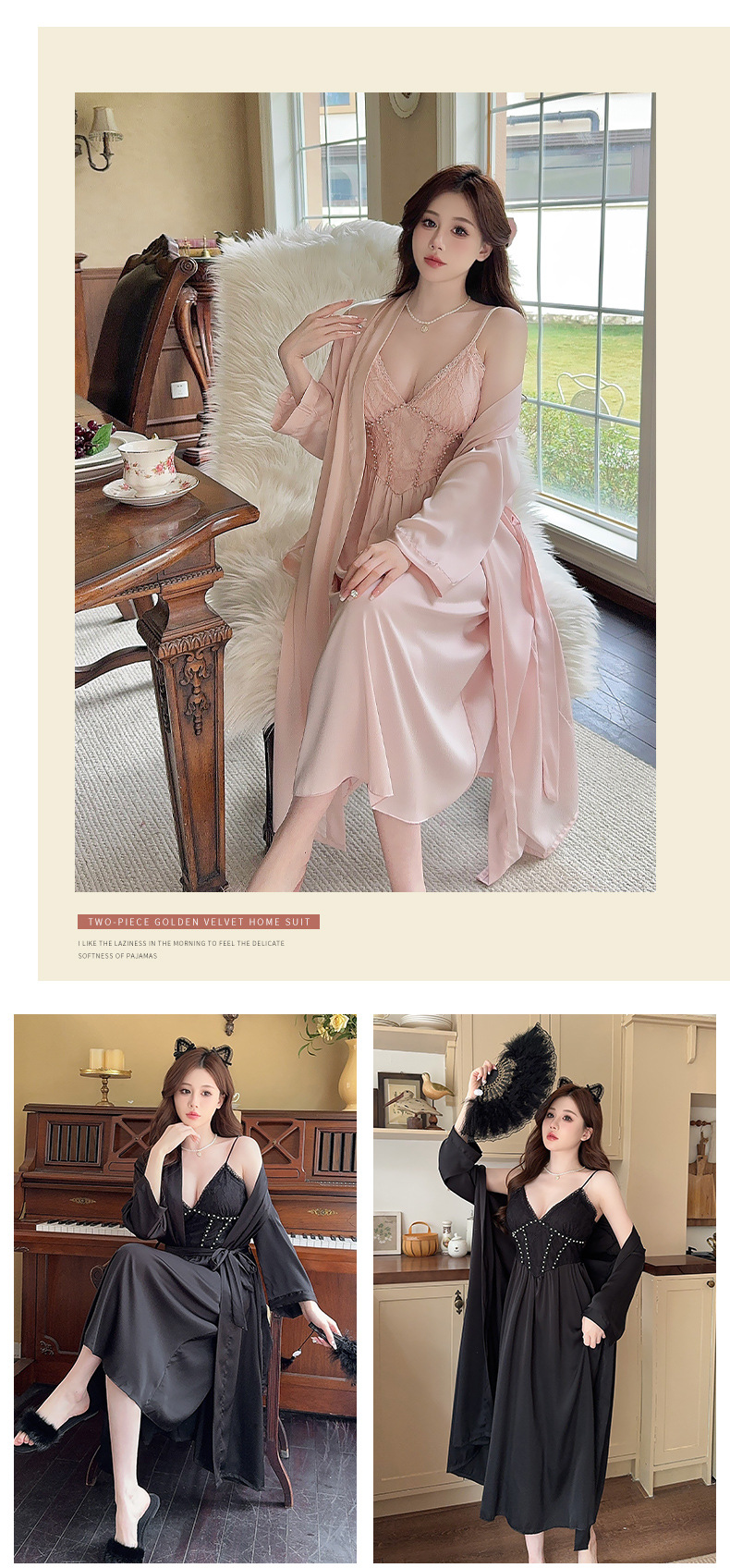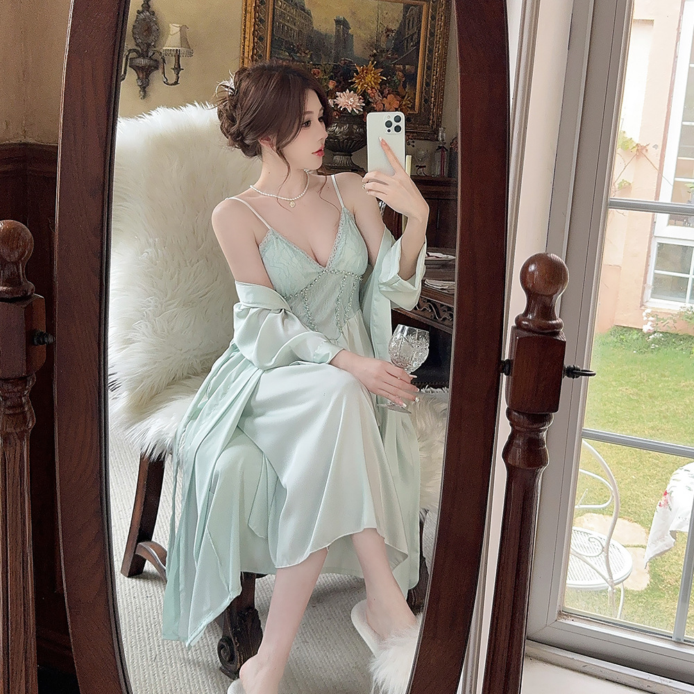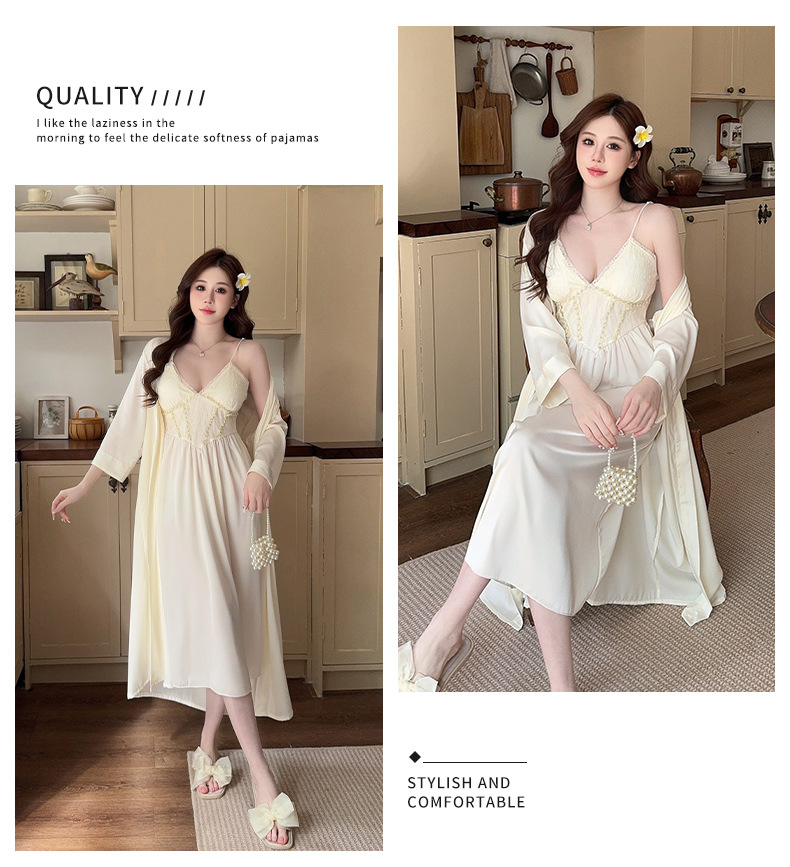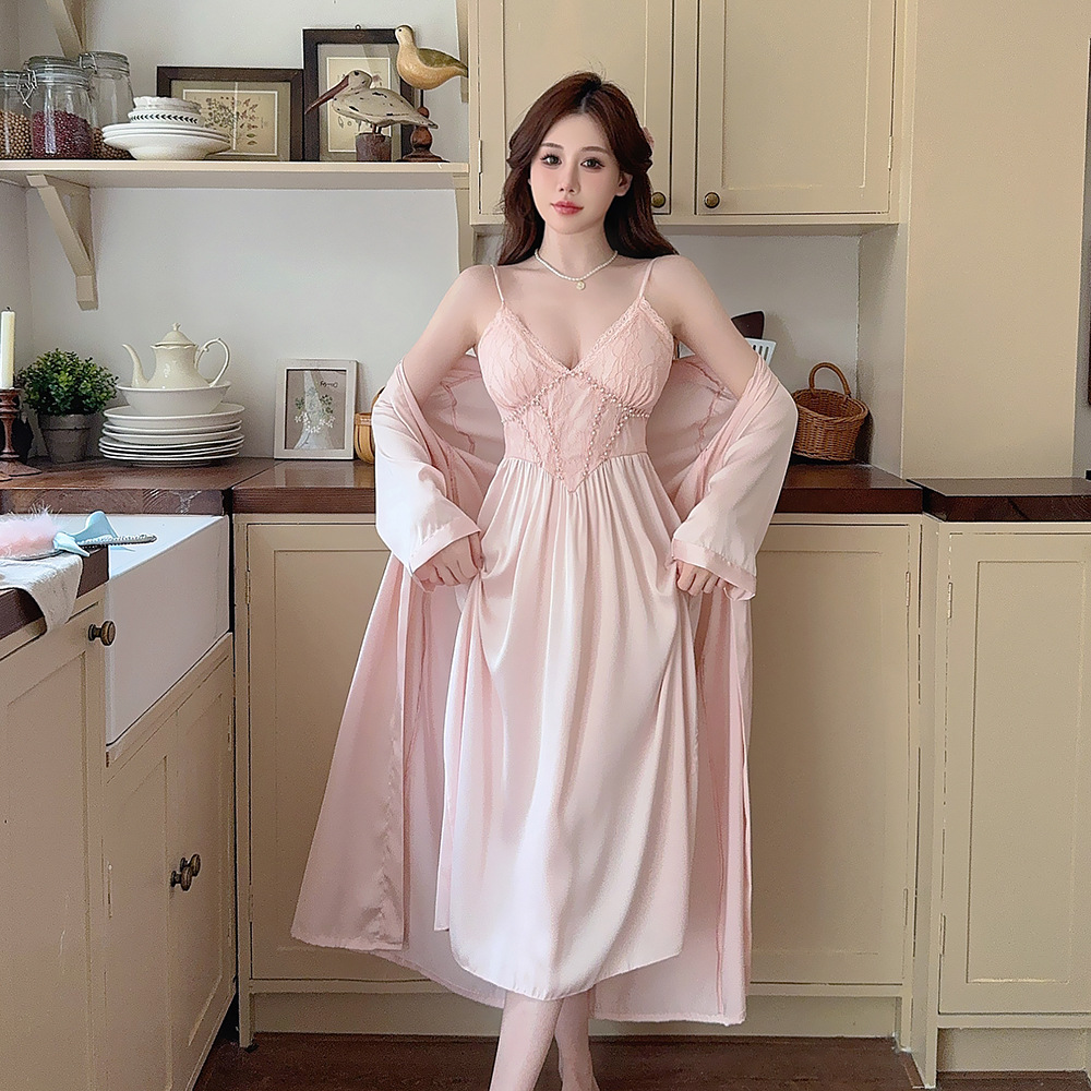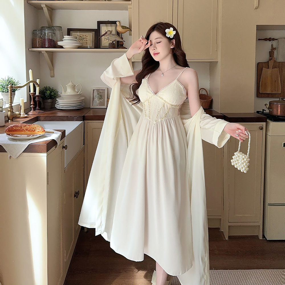 새로운 도착 잠옷 여성의 봄과 여름 아이스 실크 빛 럭셔리 여신 우아한 스트랩 아우터 2 피스 세트 진주 잠옷 홈 옷스토어 가기
