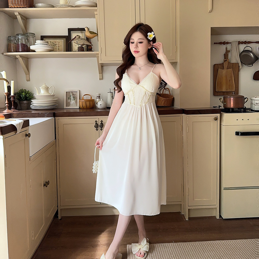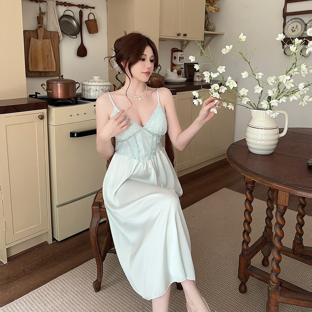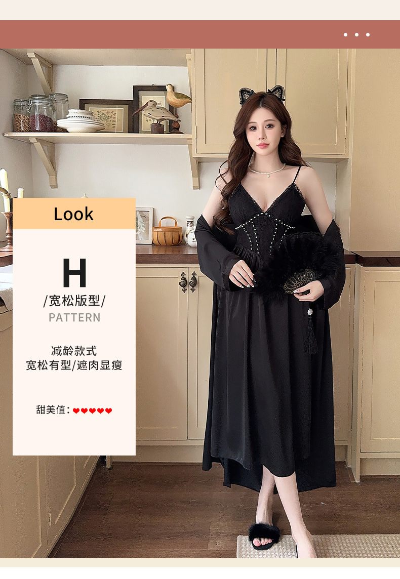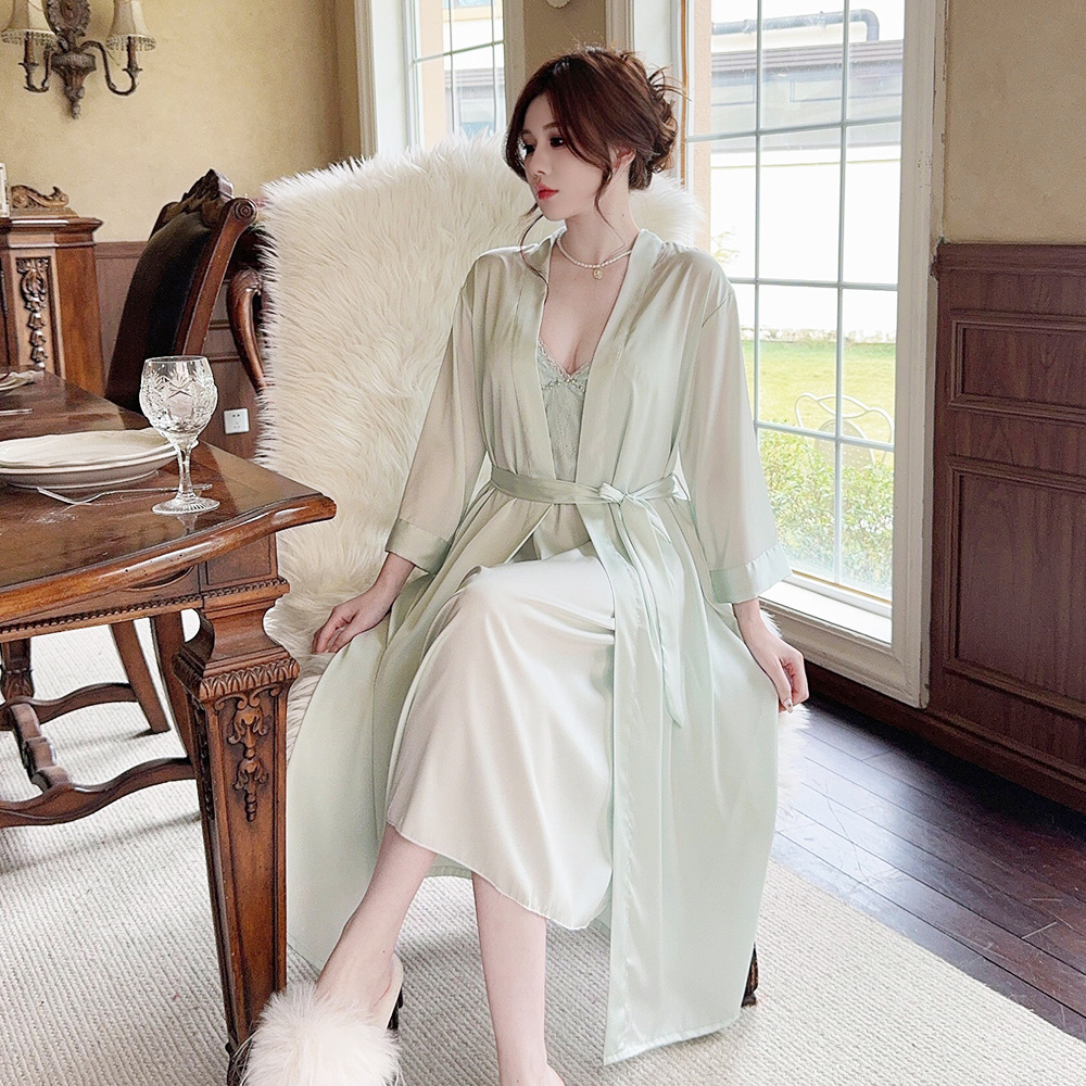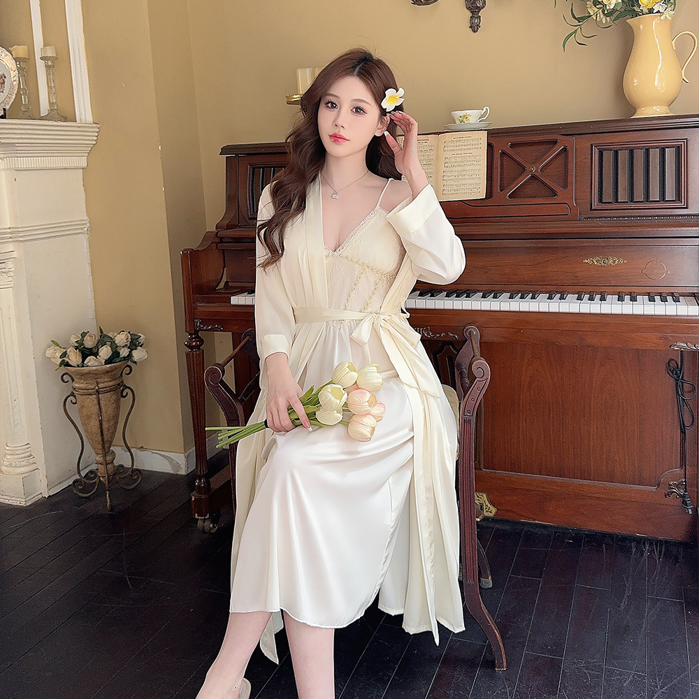 새로운 도착 잠옷 여성의 봄과 여름 아이스 실크 빛 럭셔리 여신 우아한 스트랩 아우터 2 피스 세트 진주 잠옷 홈 옷스토어 가기