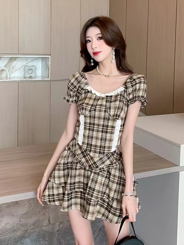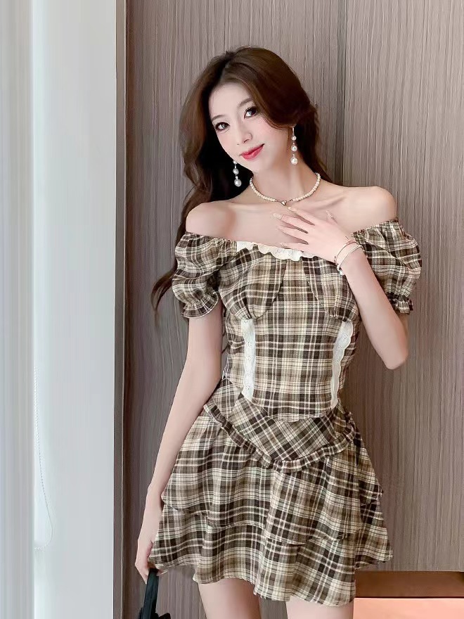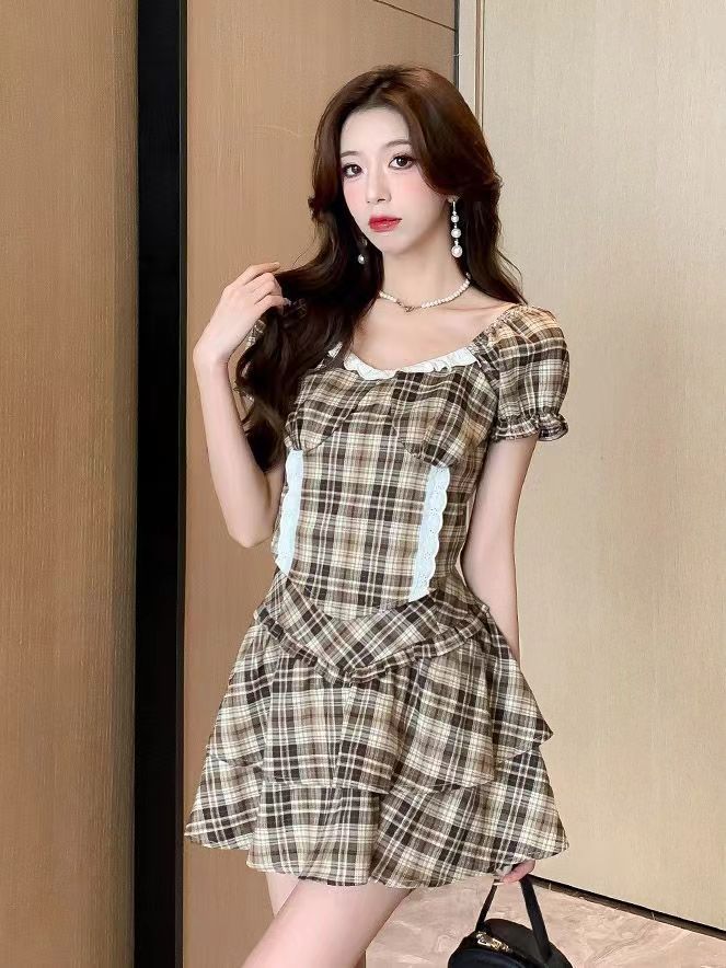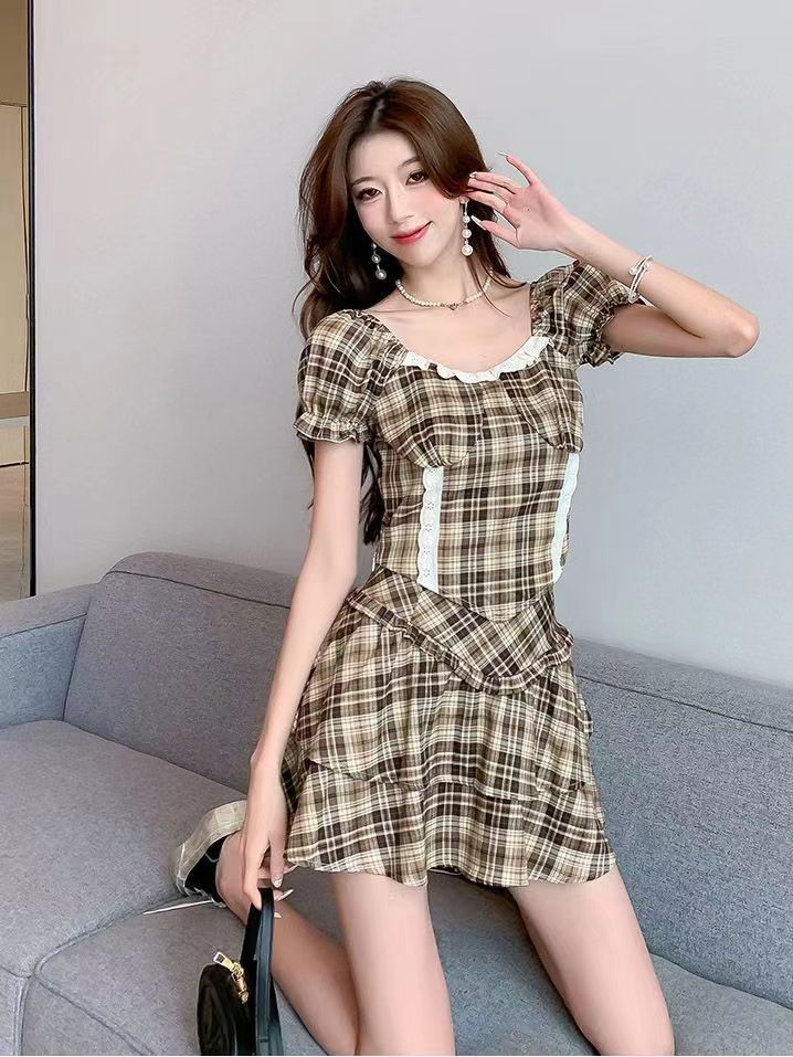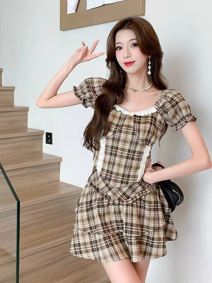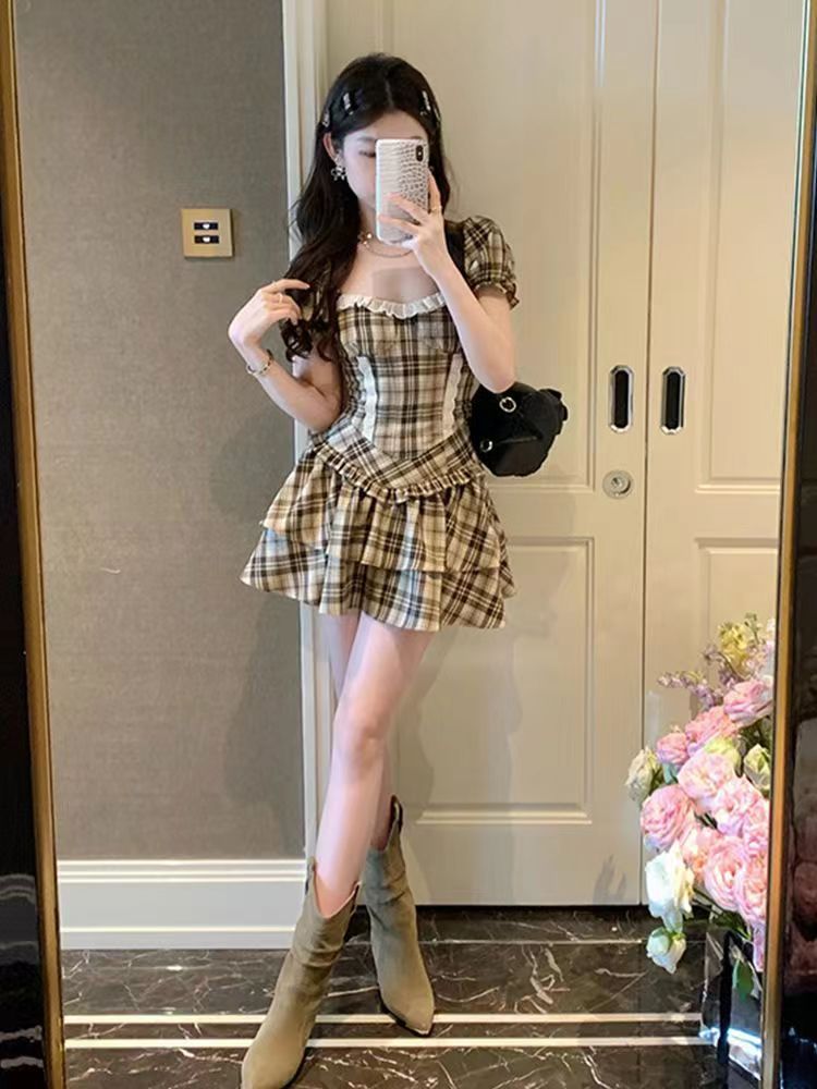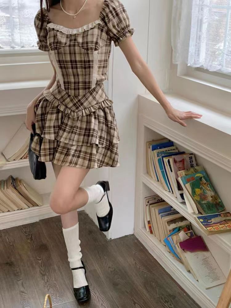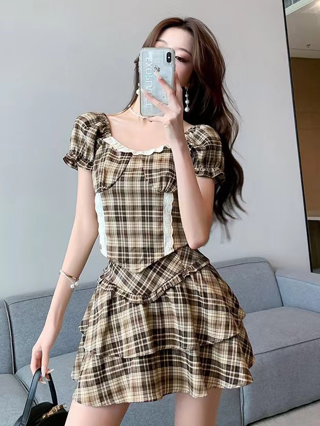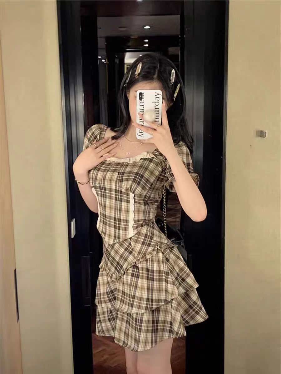 2025 여름 달콤하고 매운 레트로 격자 무늬 스퀘어 칼라 탑 여름 여성 중공업 순수한 욕망 짧은 치마 패션 세트