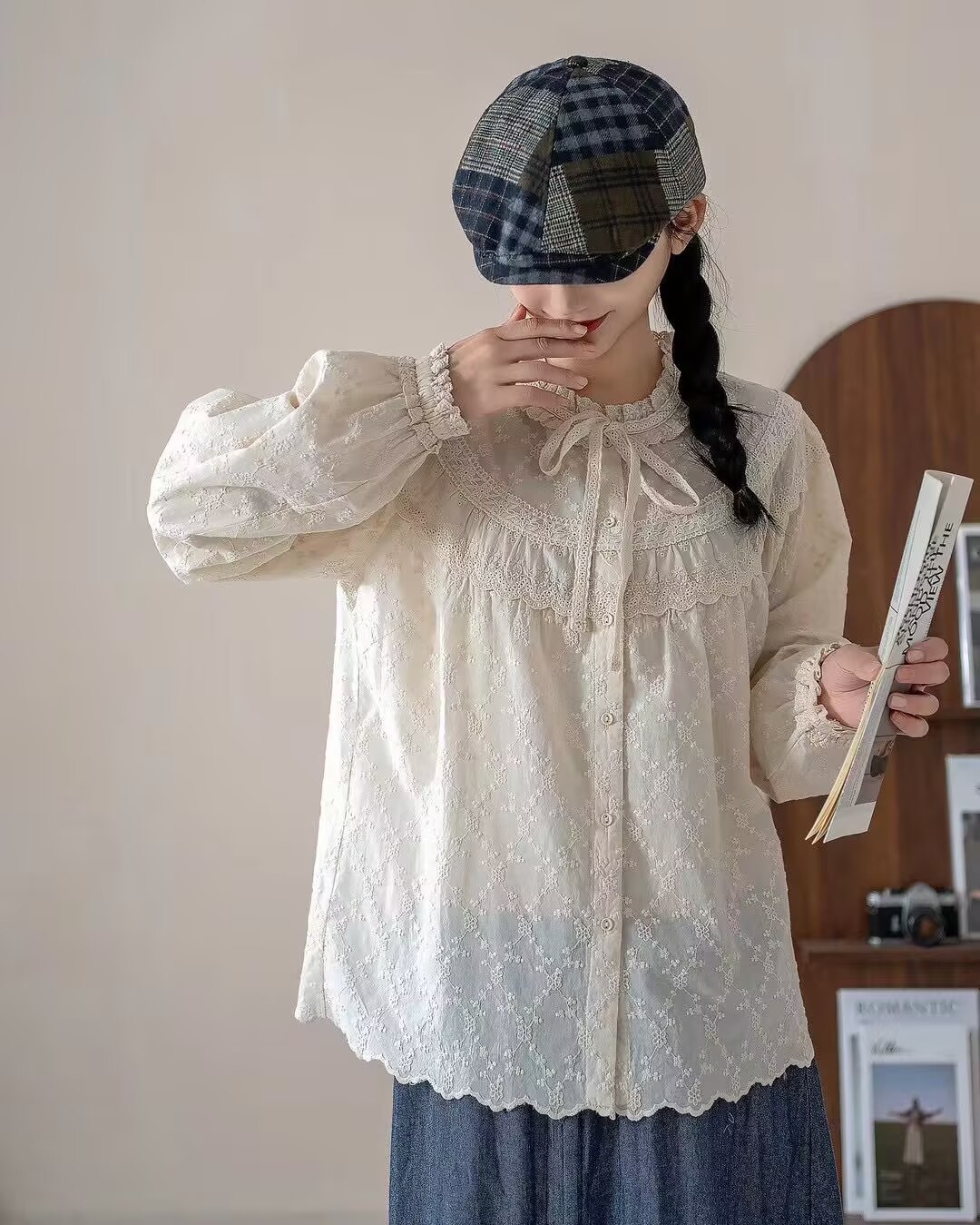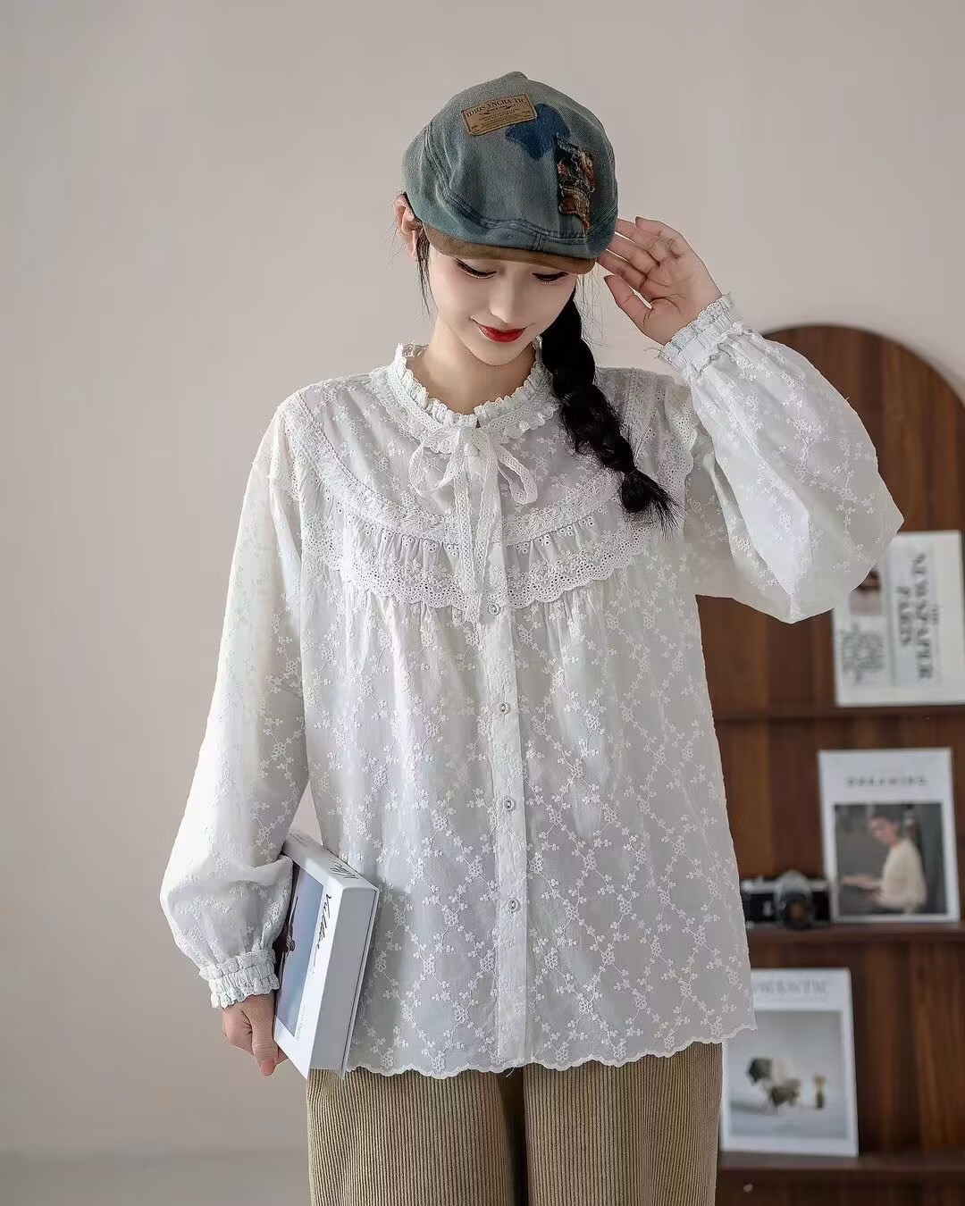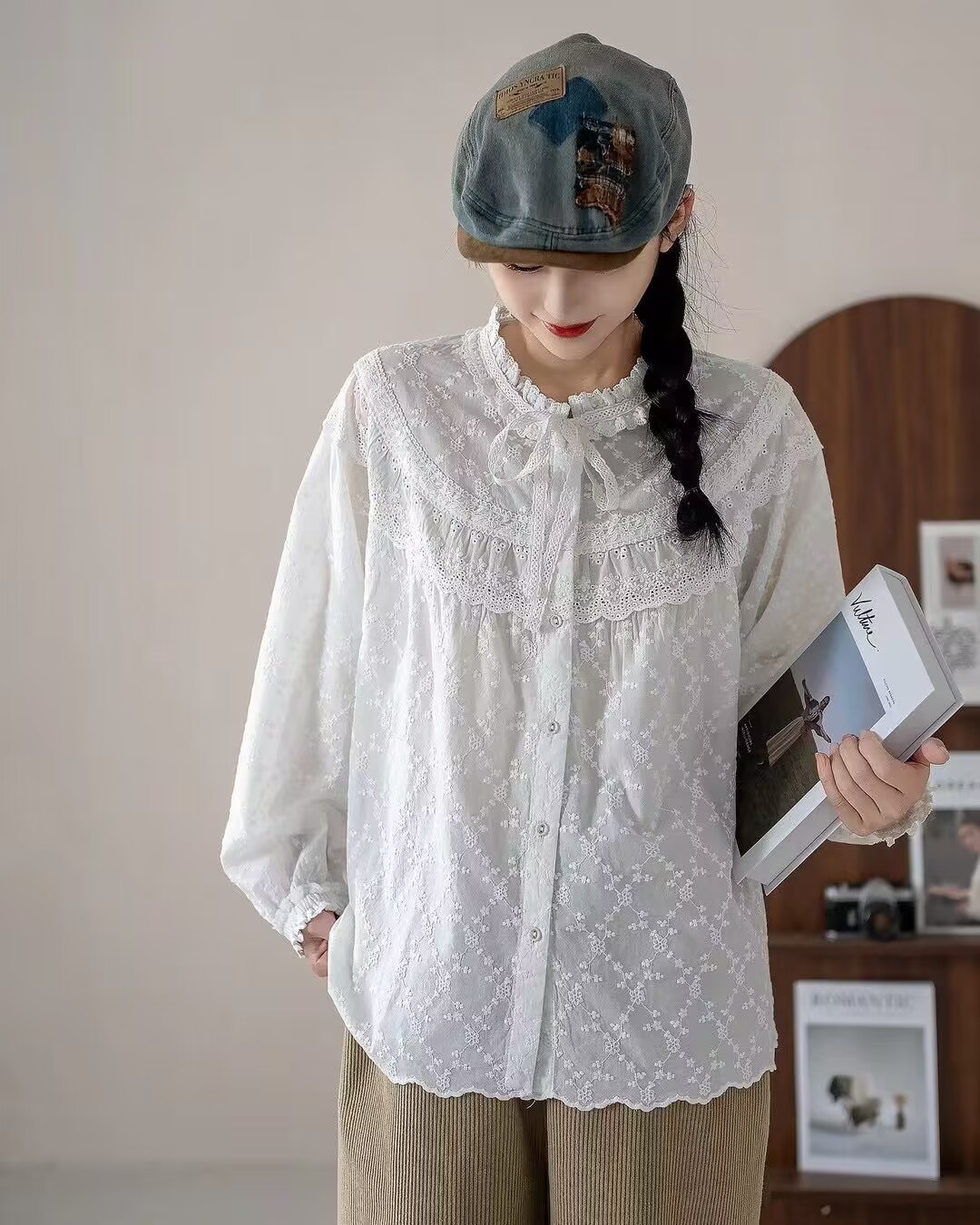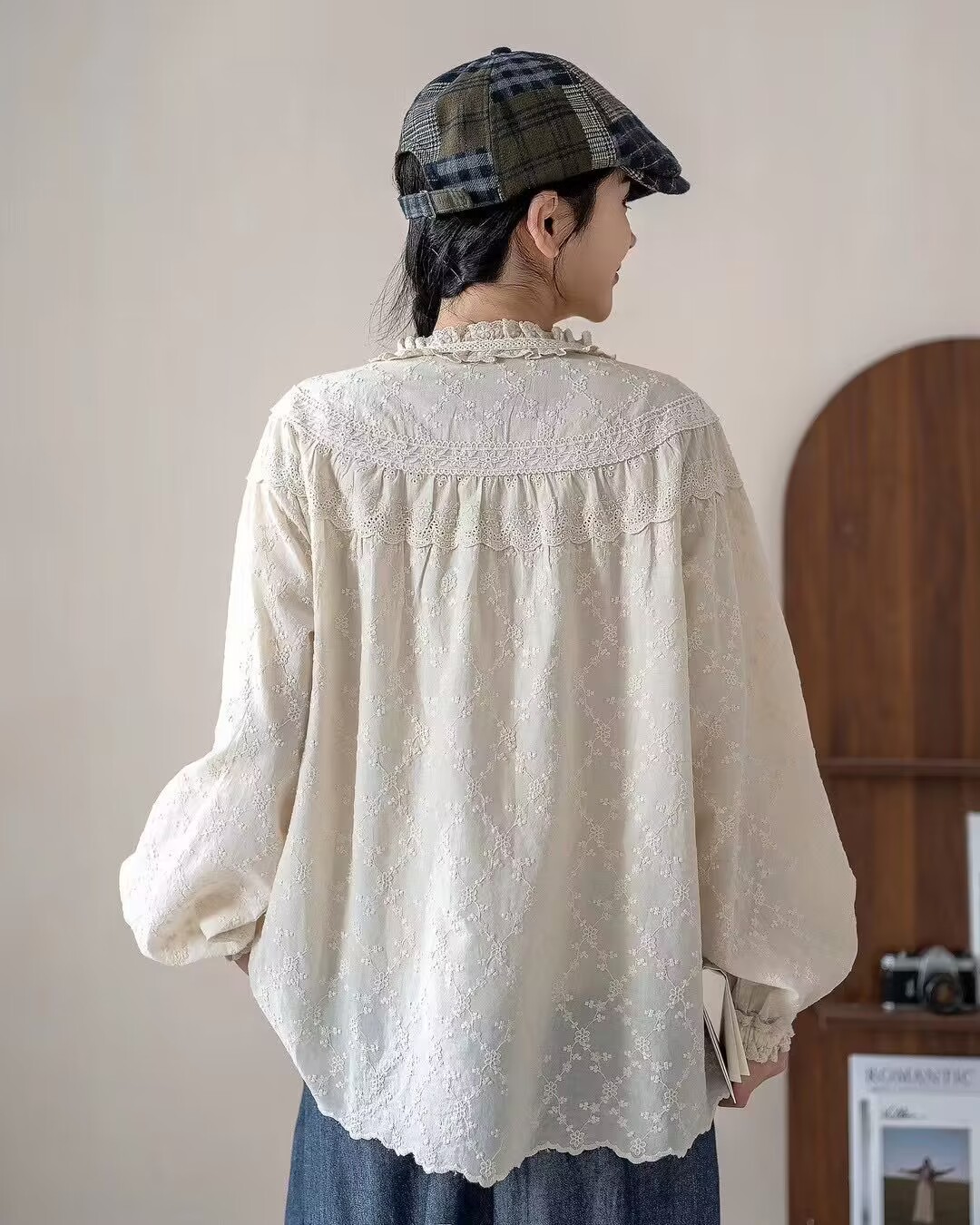 2025 년 봄 새로운 예술적 올매치 느슨한 캐주얼 자수 레이스 칼라 레이스 여성용 긴 소매 면 셔츠스토어 가기
