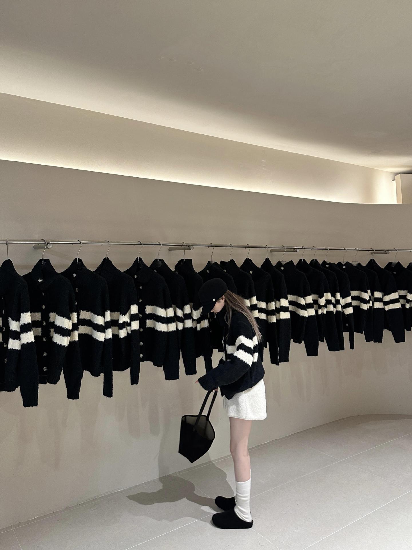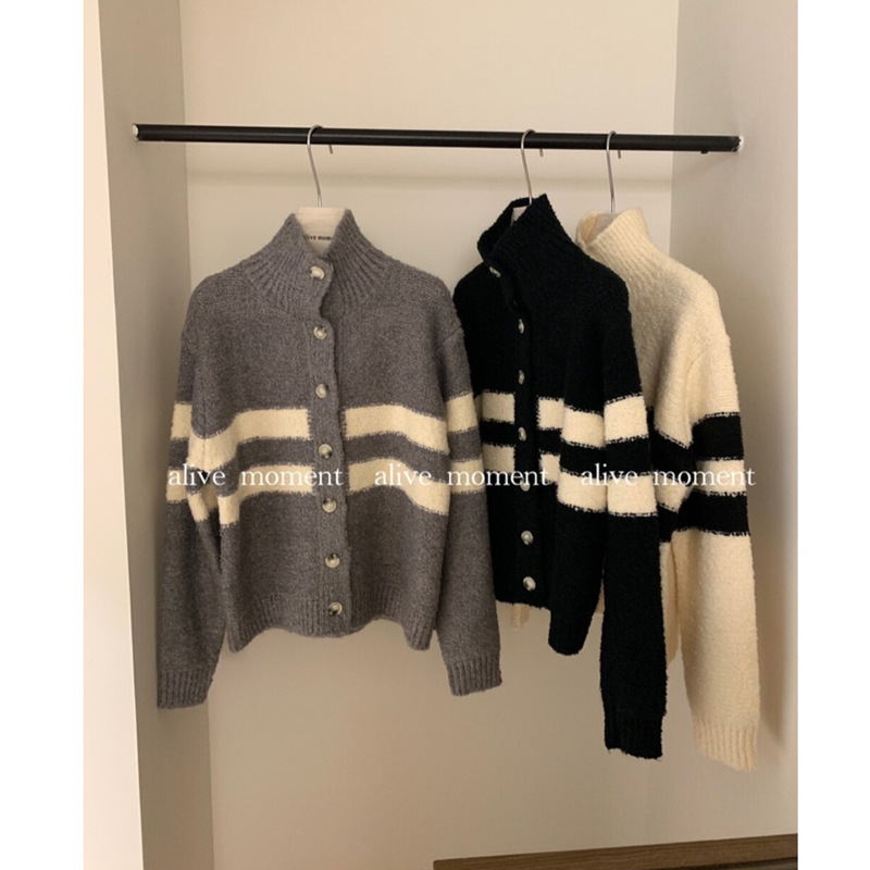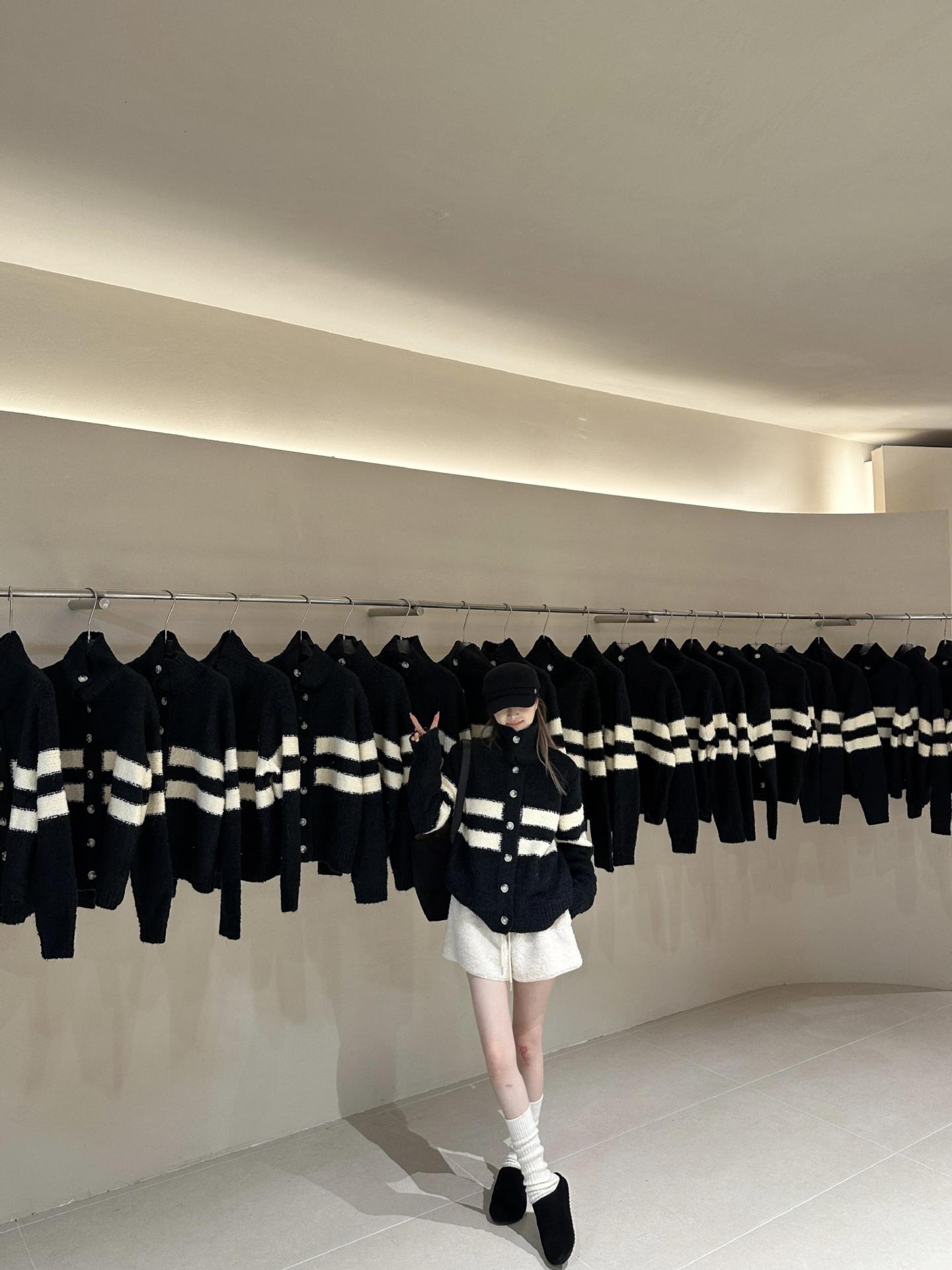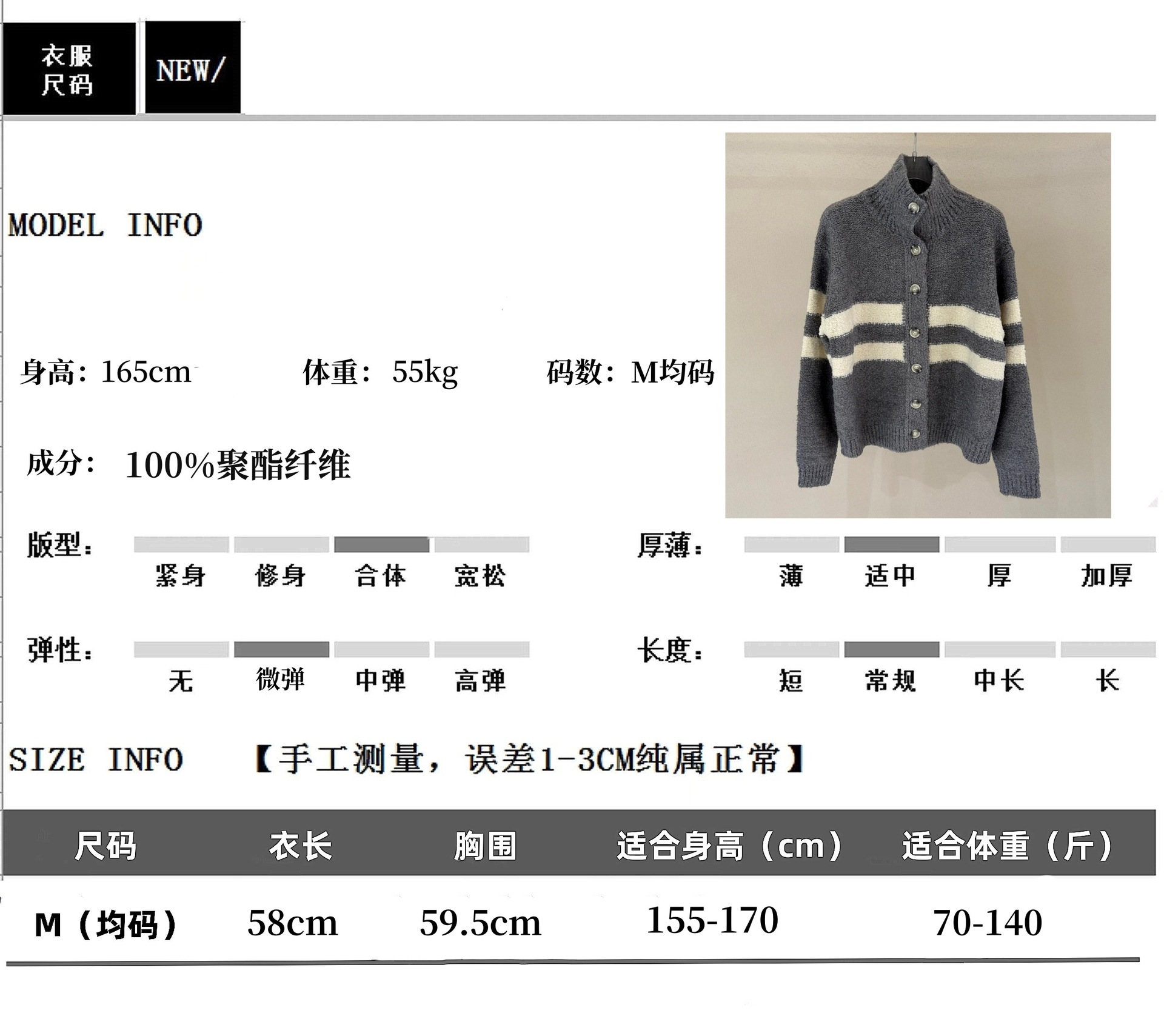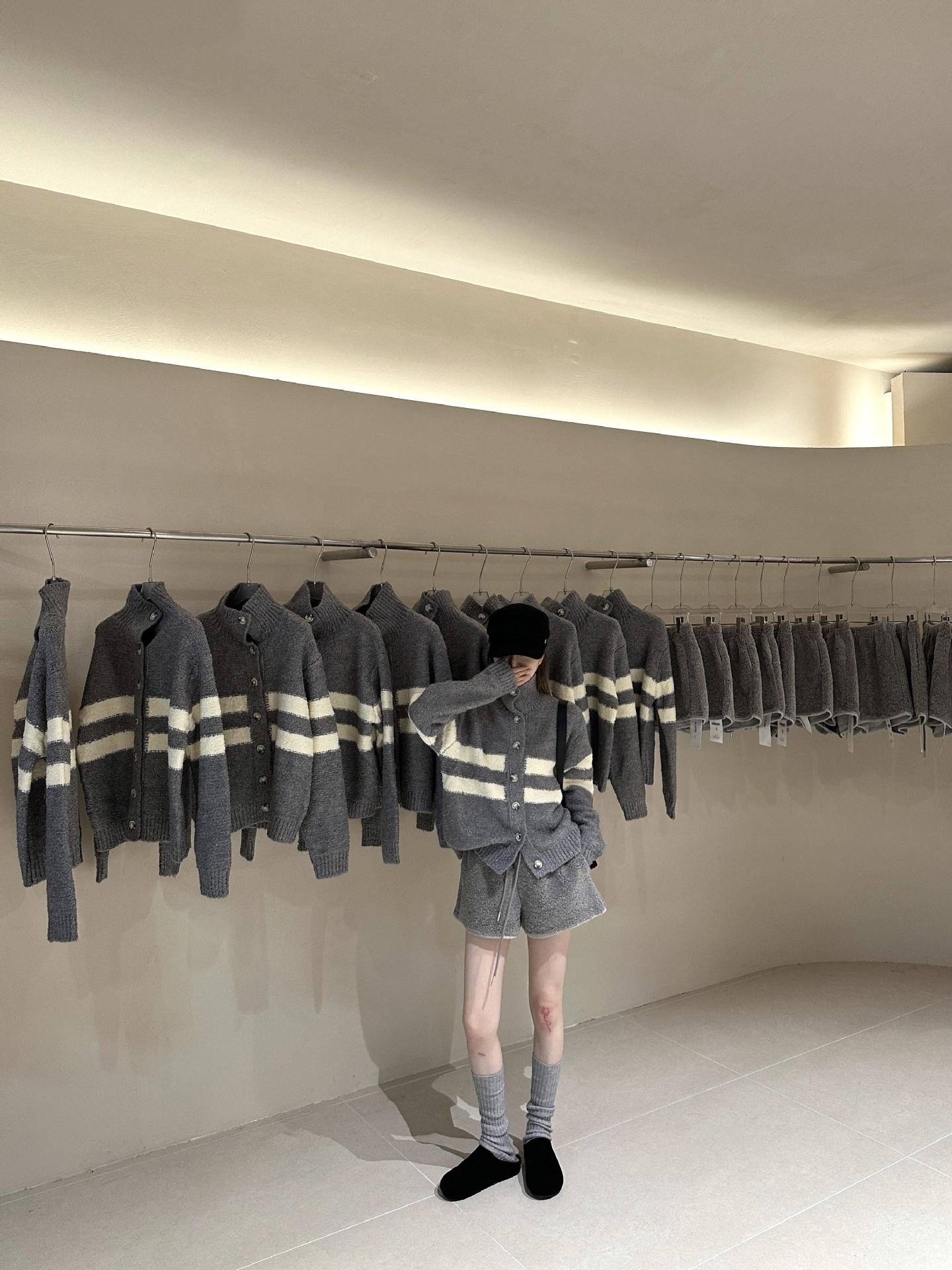 2025 봄과 가을 새로운 루프 원사 부드러운 왁스 색상 대조 줄무늬 니트 스웨터 카디건 여자 느슨한 두꺼운 올 매치 스웨터스토어 가기