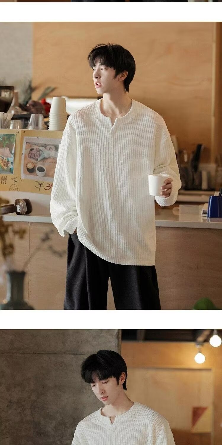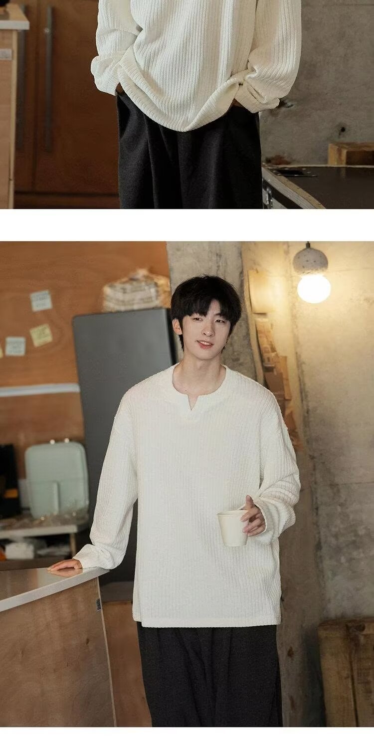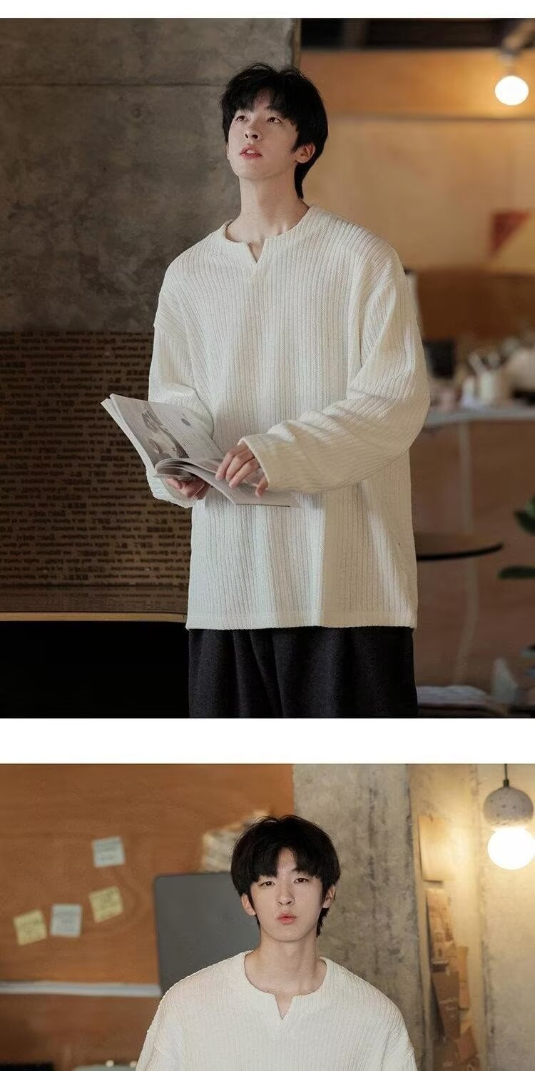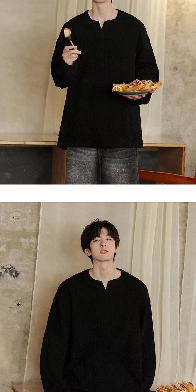 게으른 스타일 질감 감각 작은 V 넥 긴팔 티셔츠 남성 봄과 가을 내베이스 셔츠 웨이 옷 미국 스타일 유행 브랜드 루즈