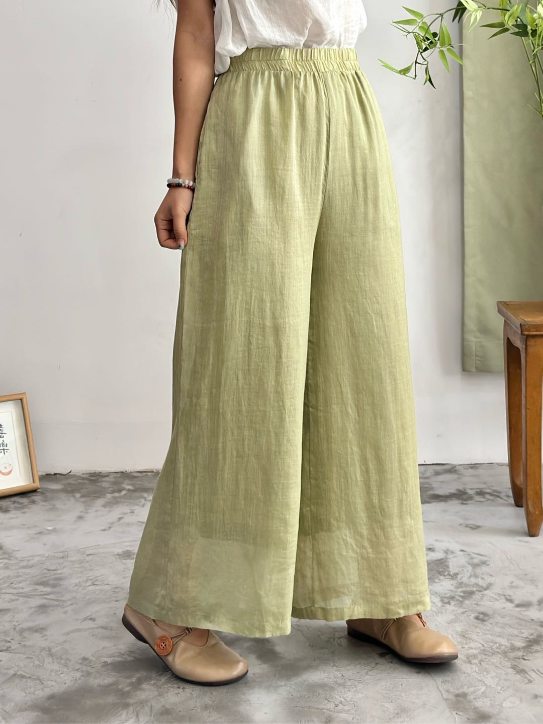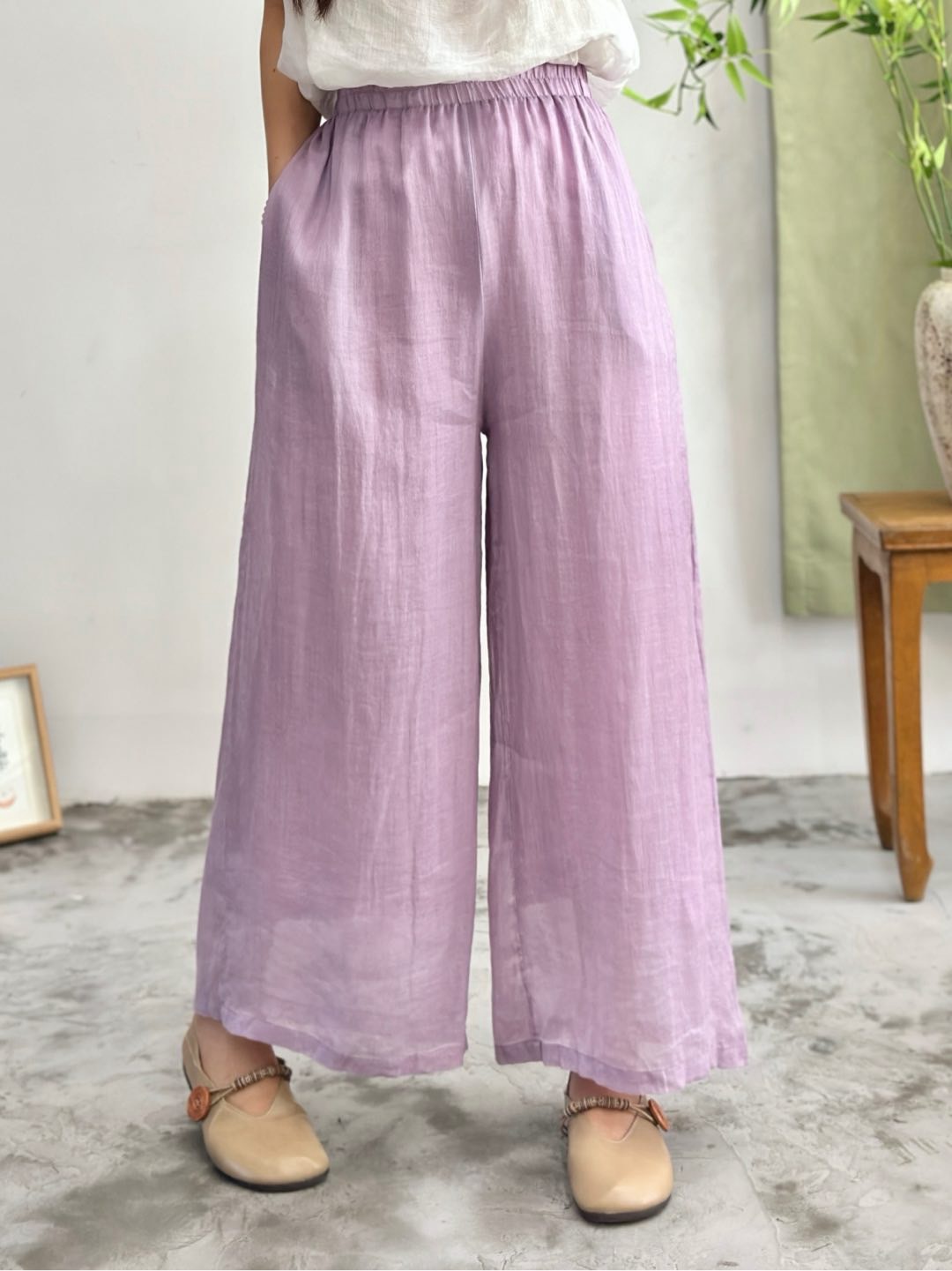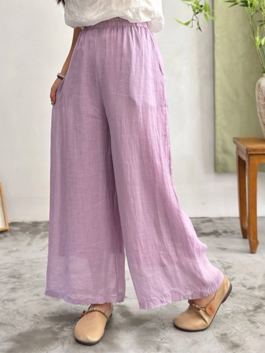 2025 봄 새로운 100 순수 라미 더블 레이어 바지 탄성 허리 문학 복고풍 느슨한 스트레이트 바지스토어 가기