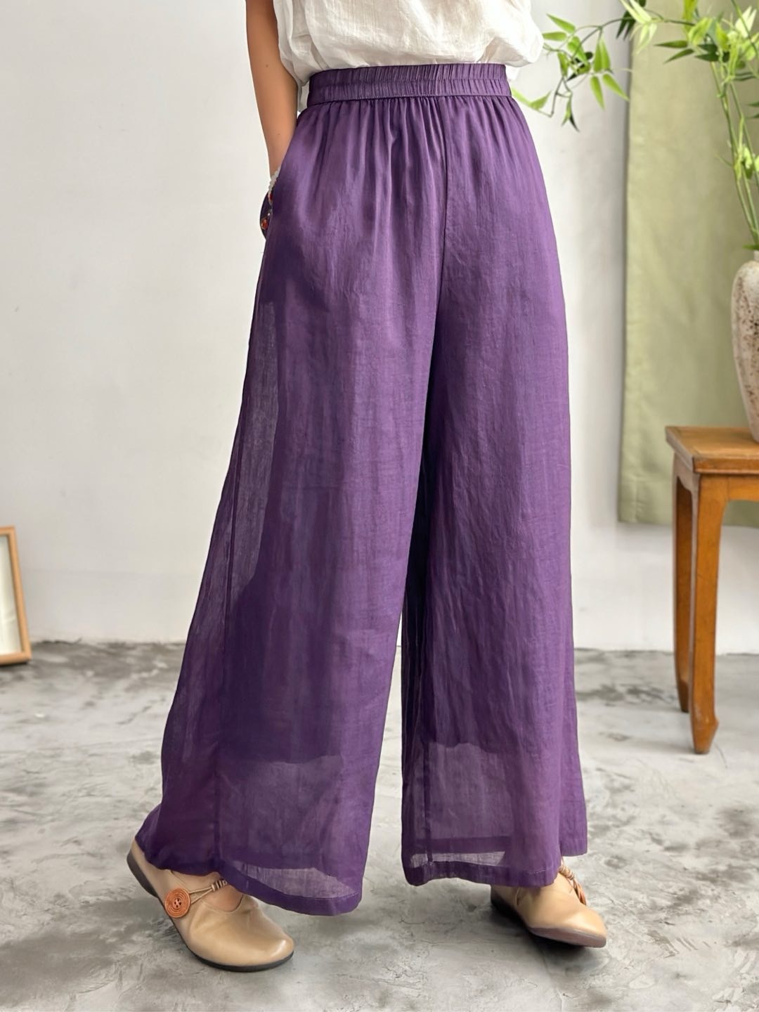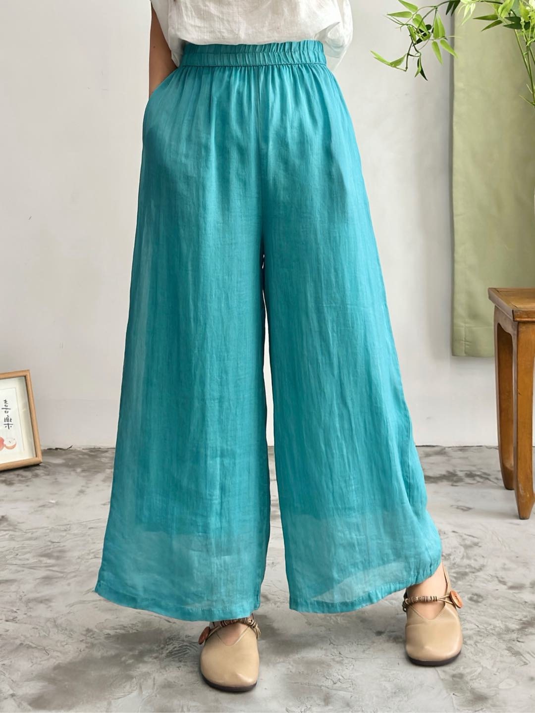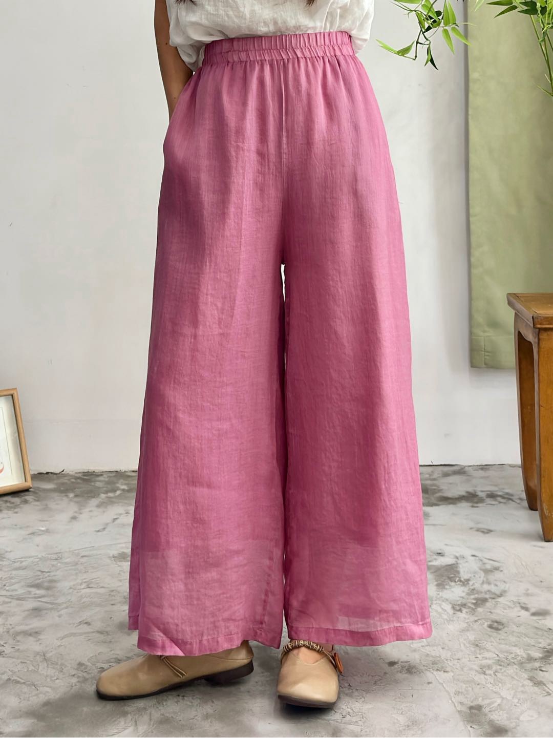 2025 봄 새로운 100 순수 라미 더블 레이어 바지 탄성 허리 문학 복고풍 느슨한 스트레이트 바지스토어 가기