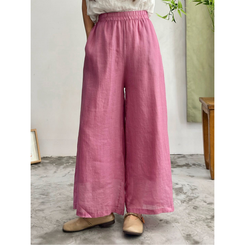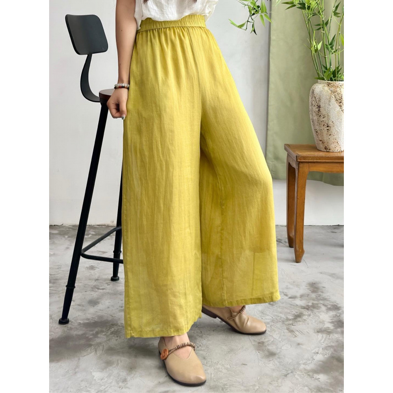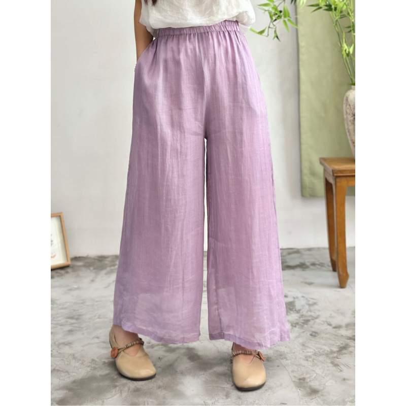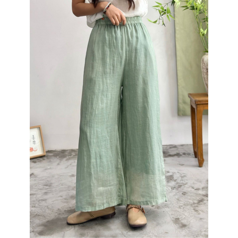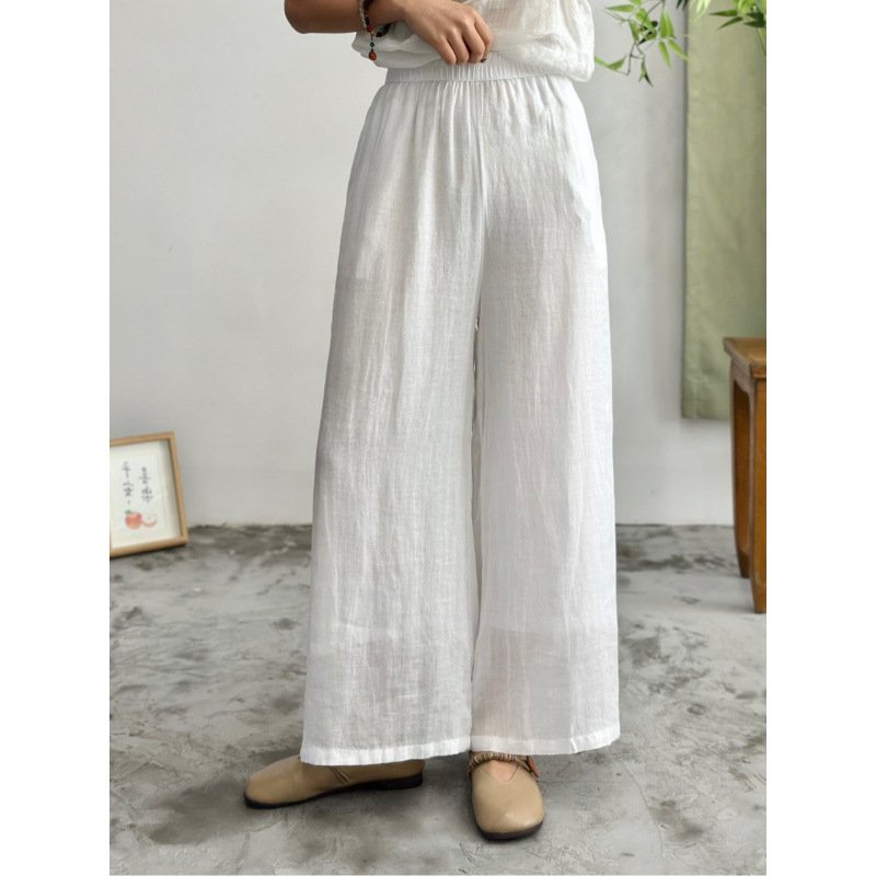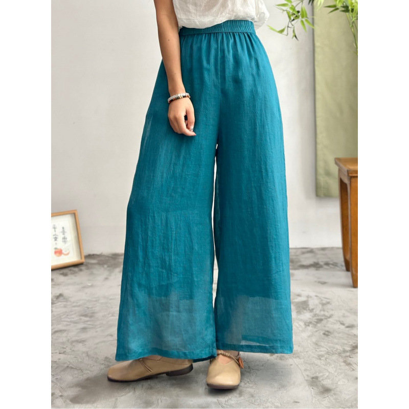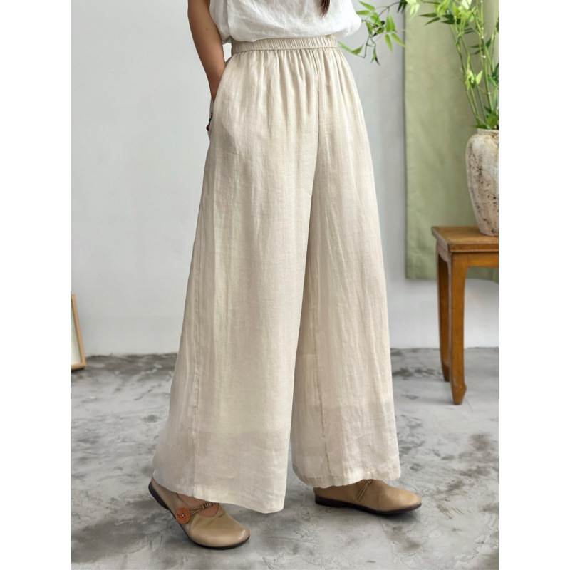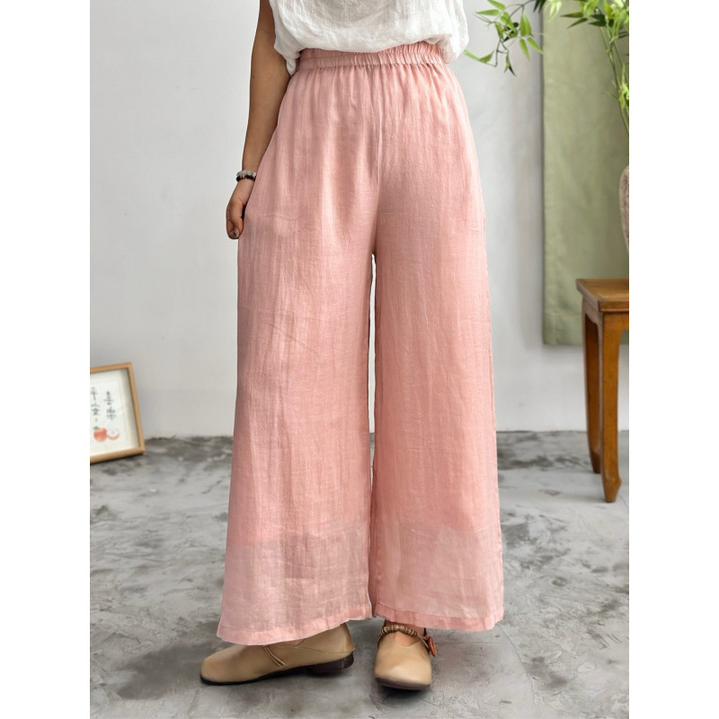 2025 봄 새로운 100 순수 라미 더블 레이어 바지 탄성 허리 문학 복고풍 느슨한 스트레이트 바지