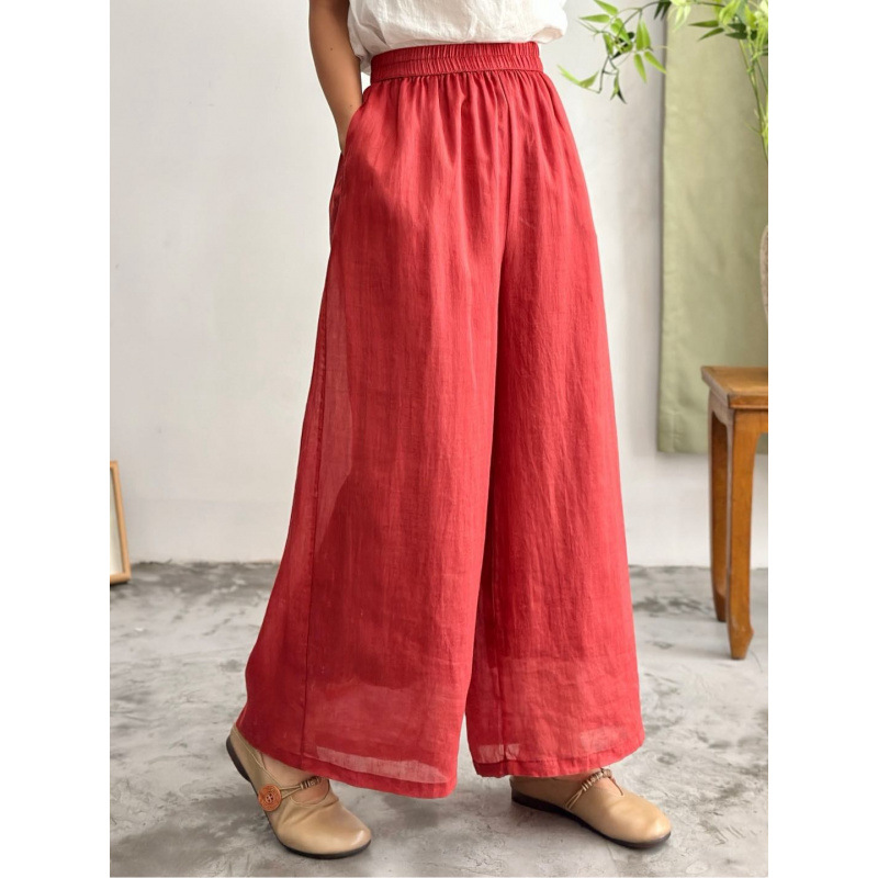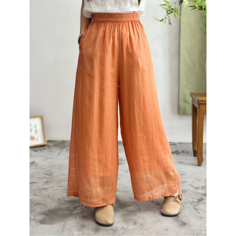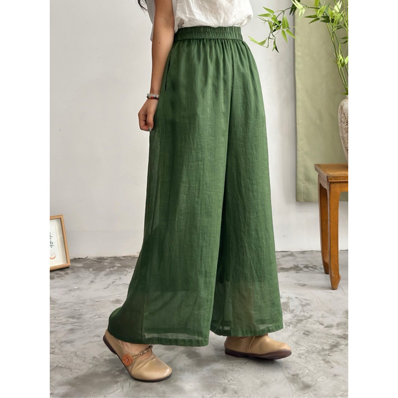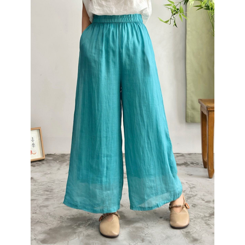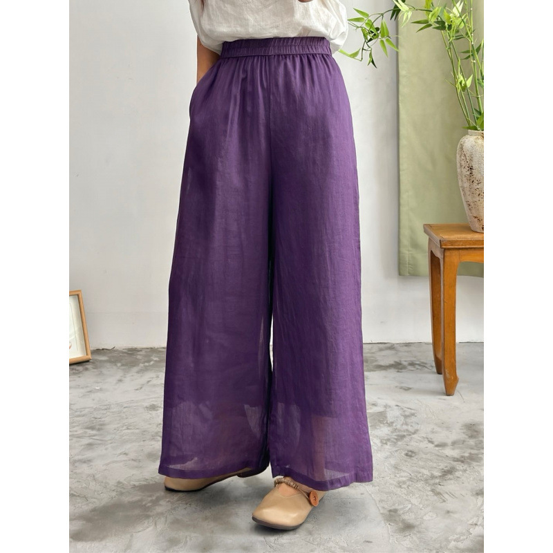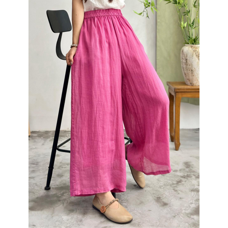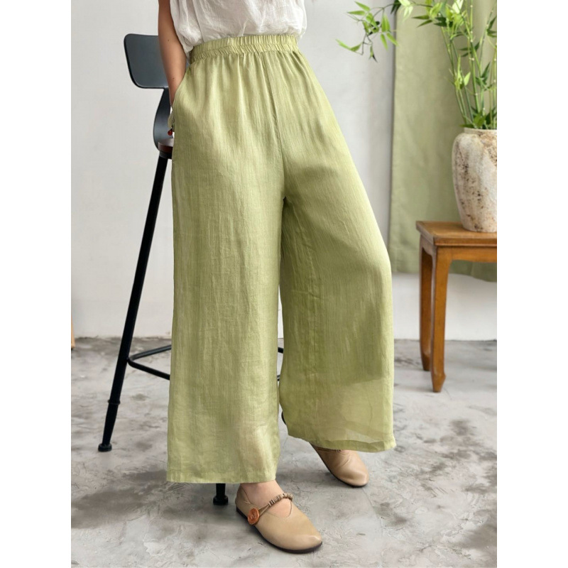 2025 봄 새로운 100 순수 라미 더블 레이어 바지 탄성 허리 문학 복고풍 느슨한 스트레이트 바지
