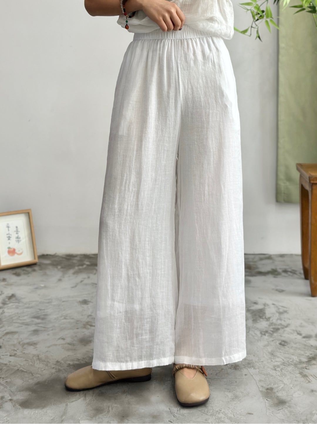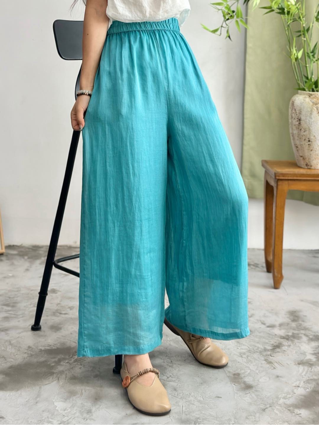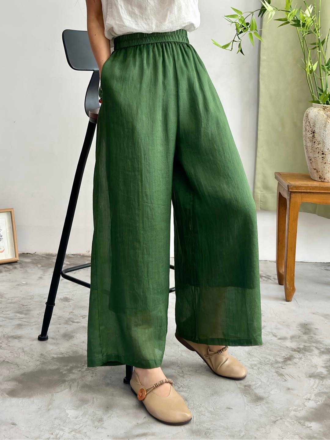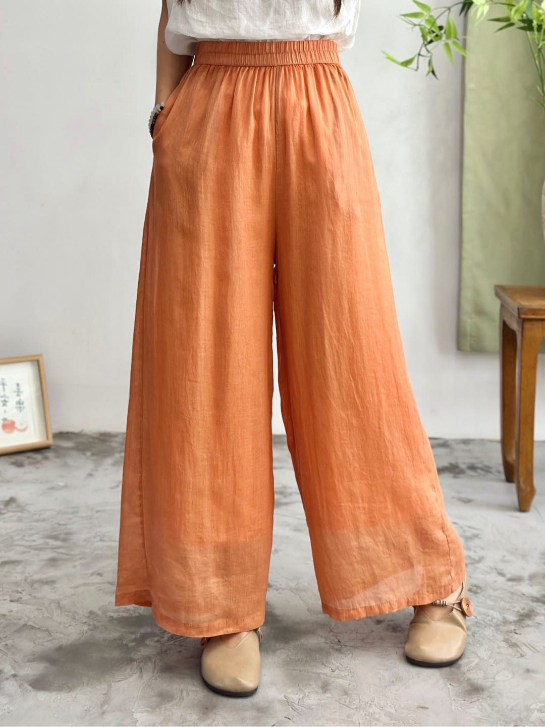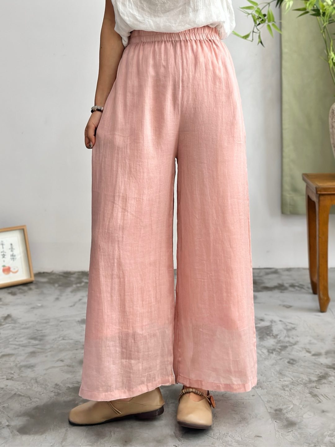 2025 봄 새로운 100 순수 라미 더블 레이어 바지 탄성 허리 문학 복고풍 느슨한 스트레이트 바지