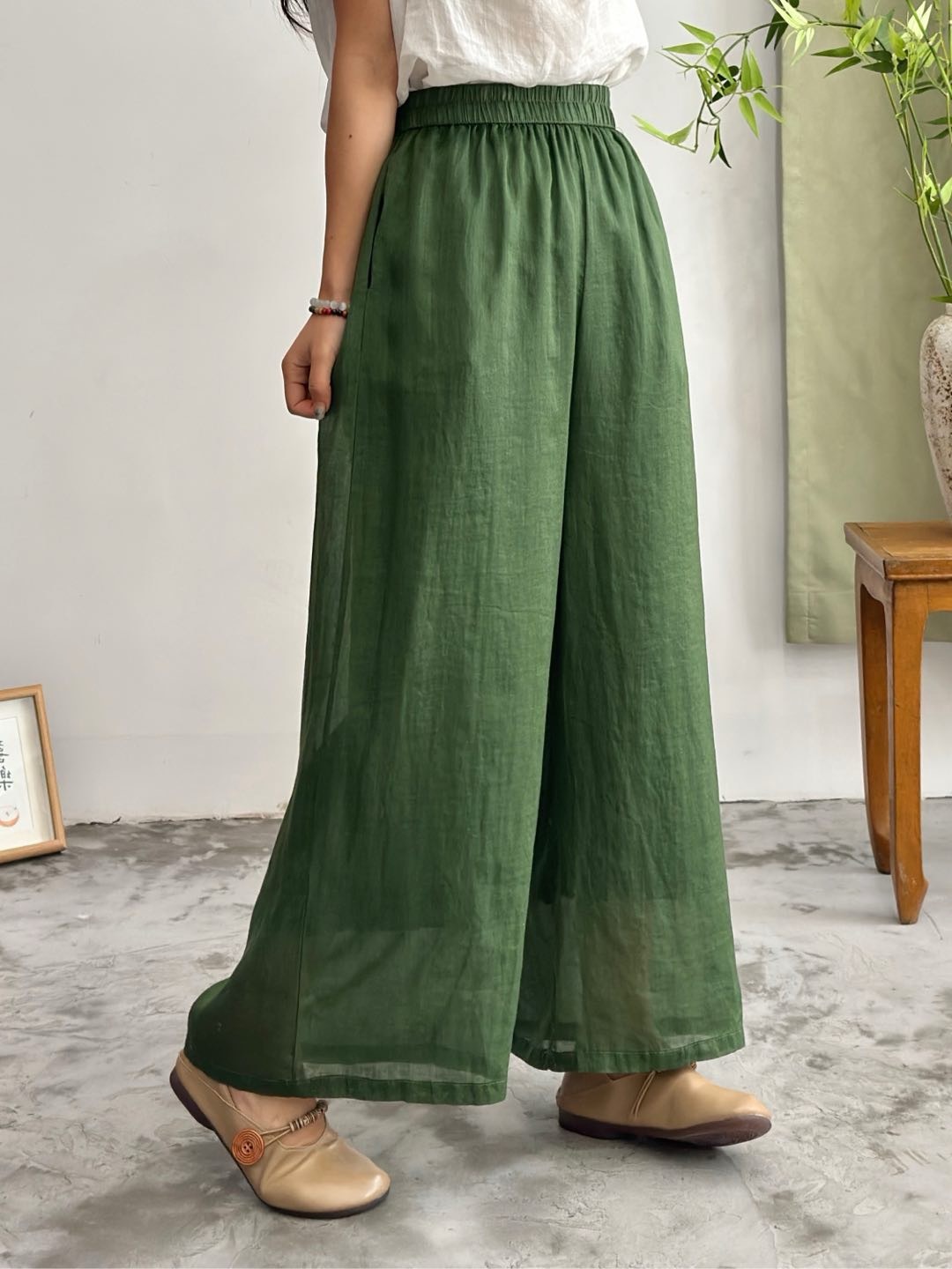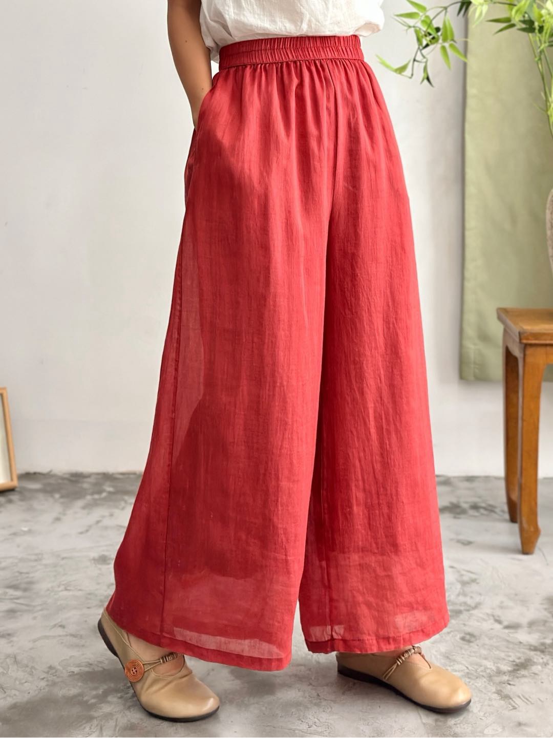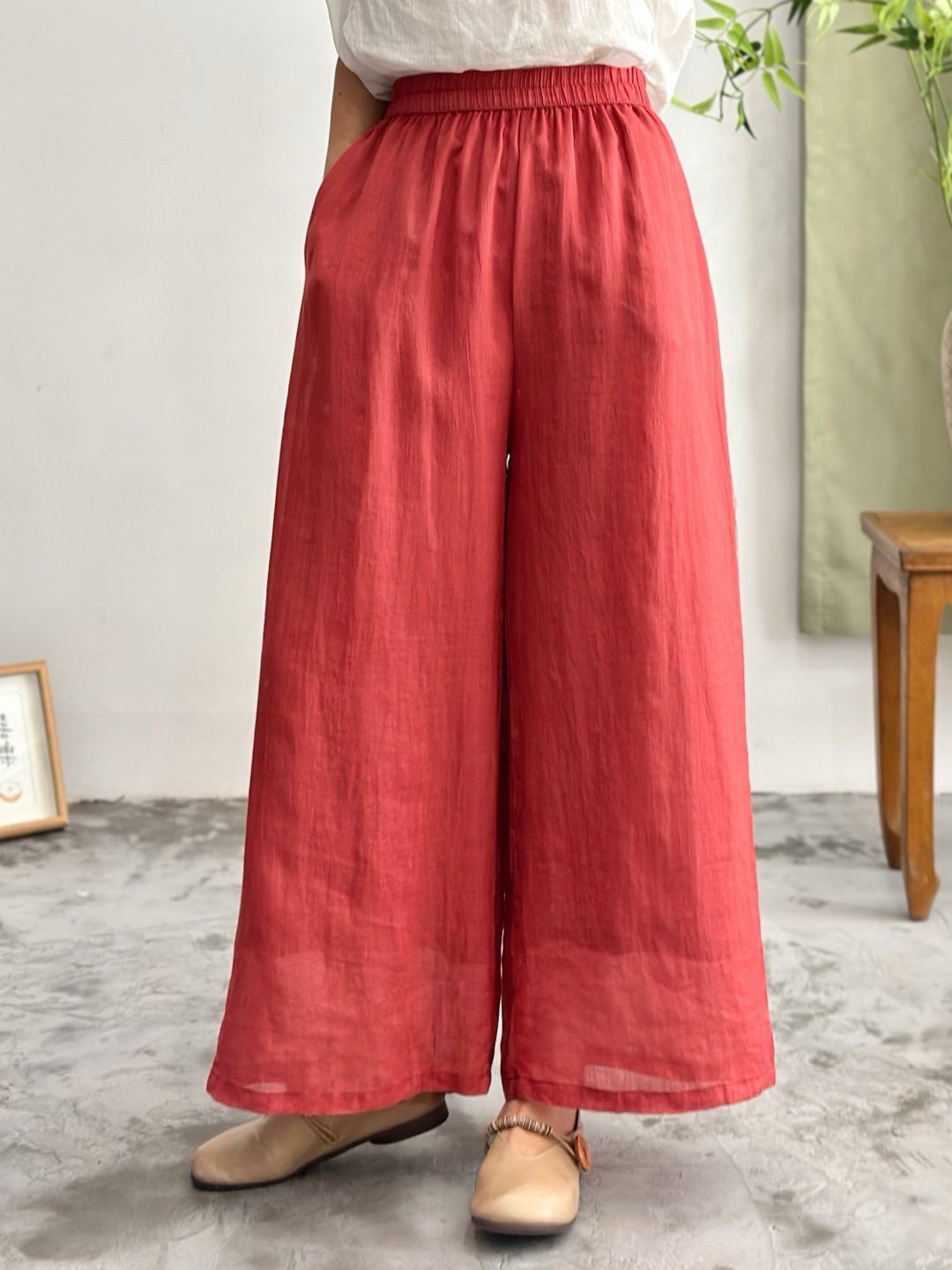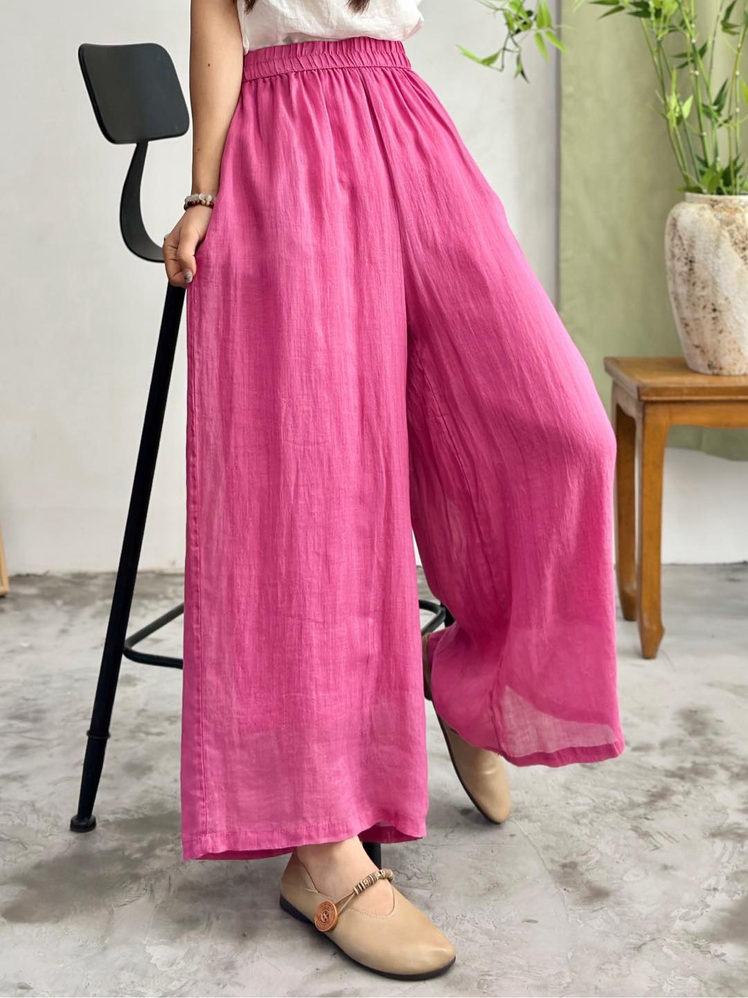 2025 봄 새로운 100 순수 라미 더블 레이어 바지 탄성 허리 문학 복고풍 느슨한 스트레이트 바지