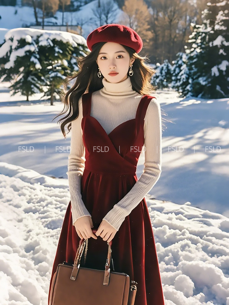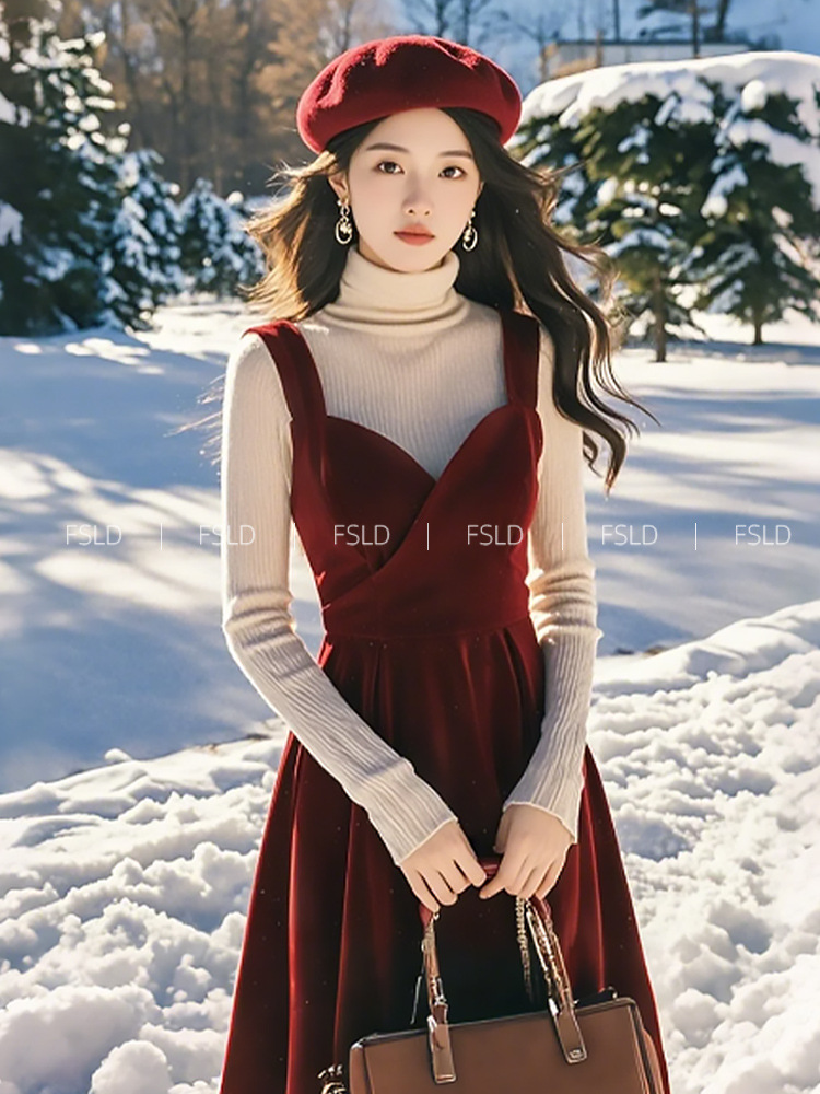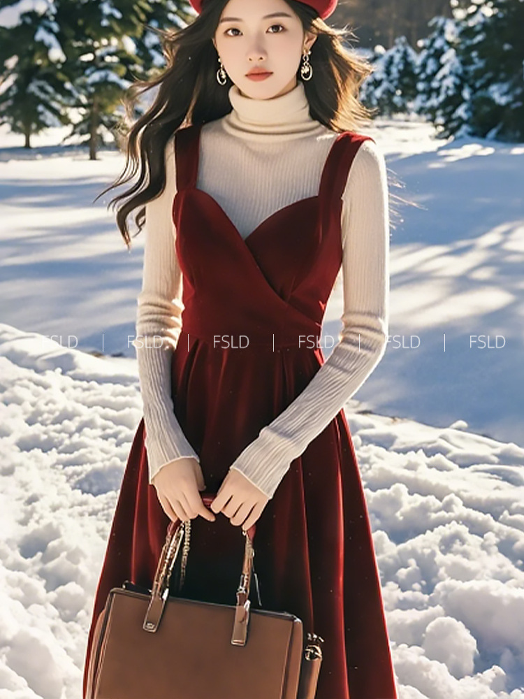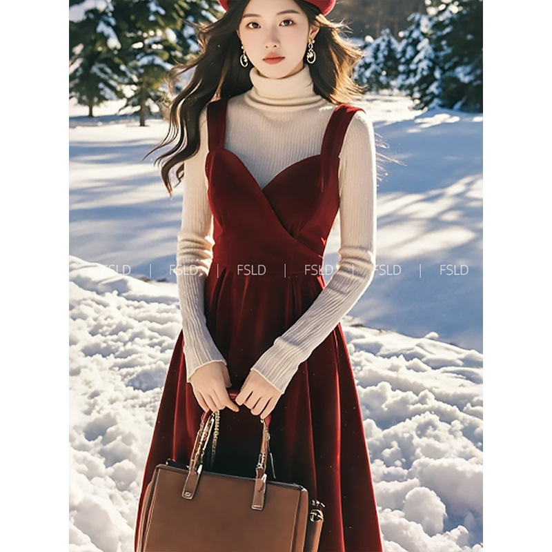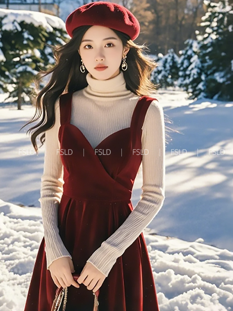 YT398917 착용 겨울 외투 스커트 레드 벨벳베이스 원피스 투피스 세트 여성의 가을