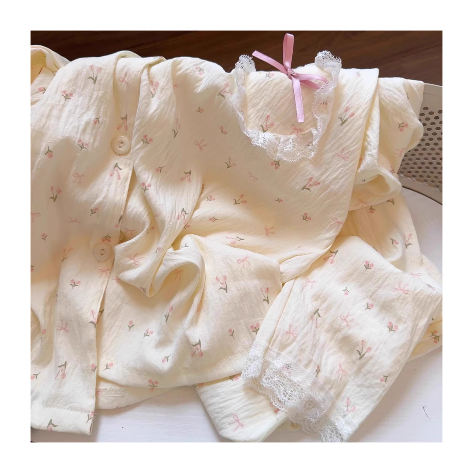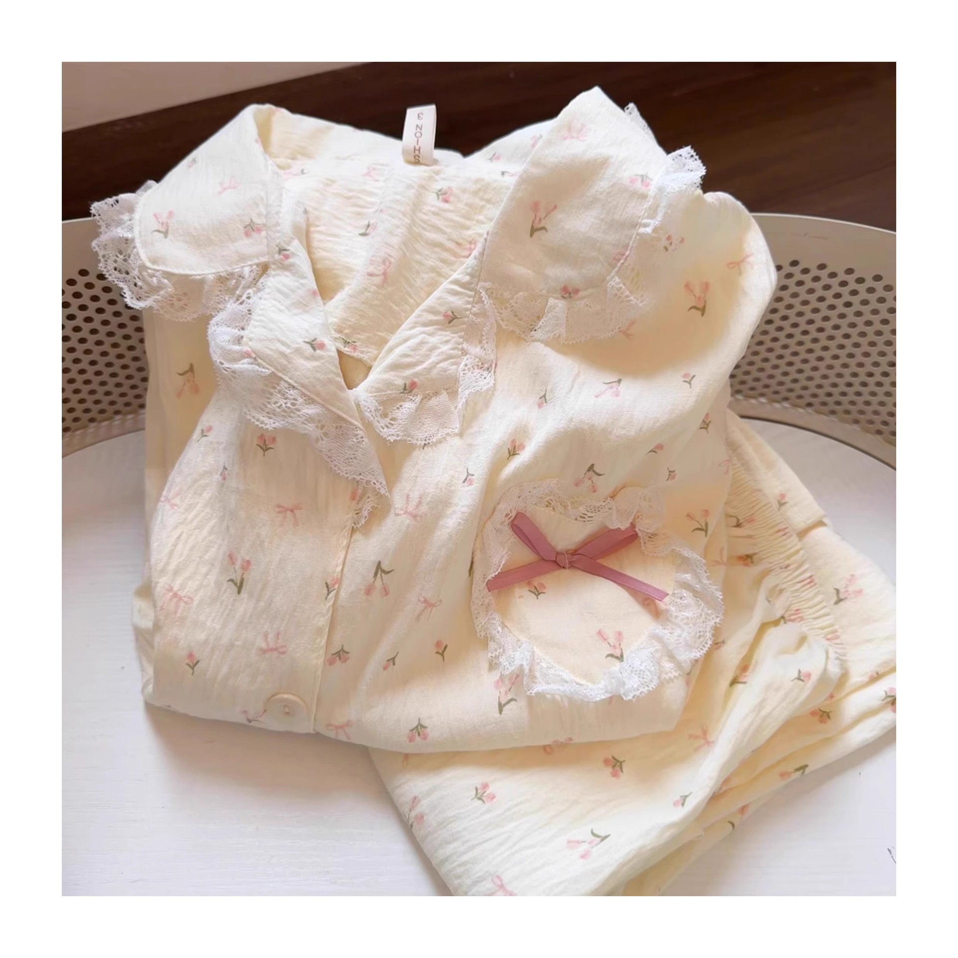 꽃 잠옷 여성의 봄과 가을 긴팔 세트 인 구름 코튼 거즈 국경 간 홈 옷 귀여운 달콤한 레이스스토어 가기