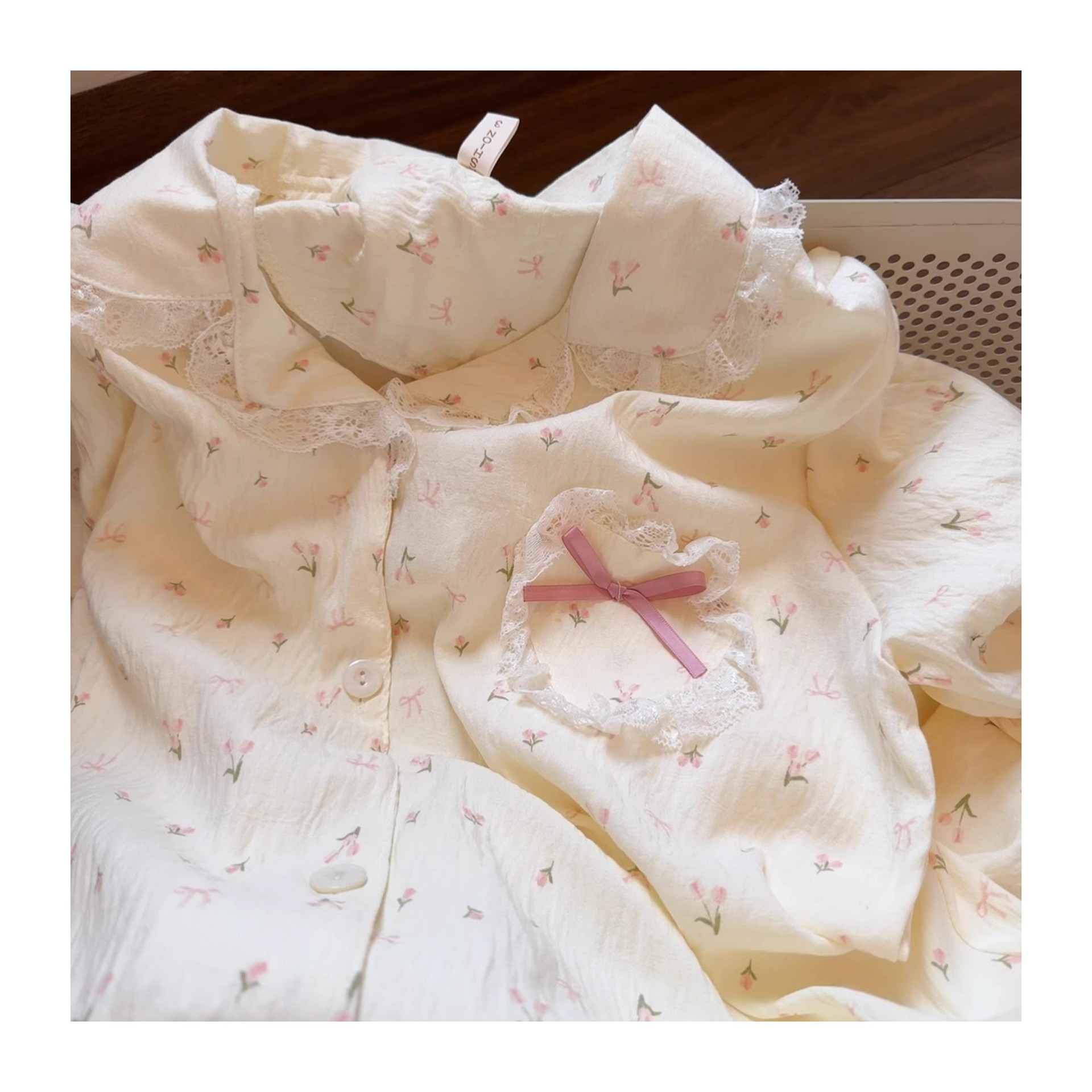 꽃 잠옷 여성의 봄과 가을 긴팔 세트 인 구름 코튼 거즈 국경 간 홈 옷 귀여운 달콤한 레이스