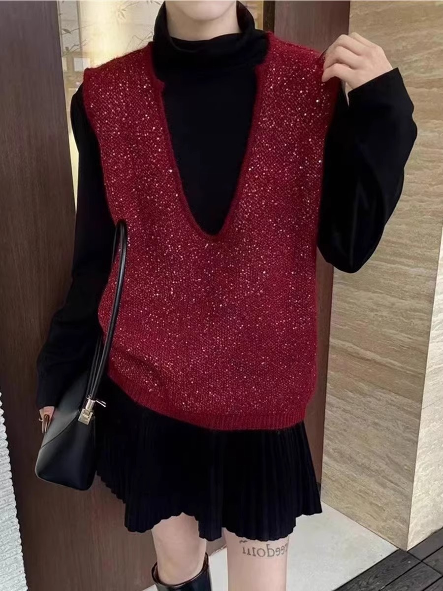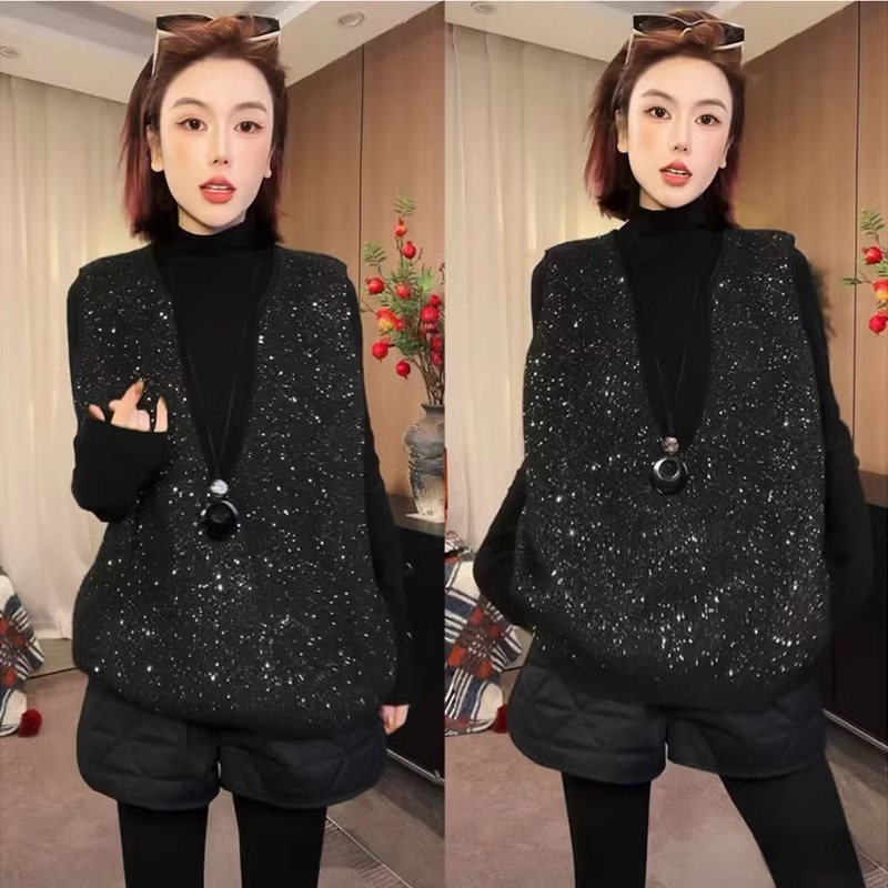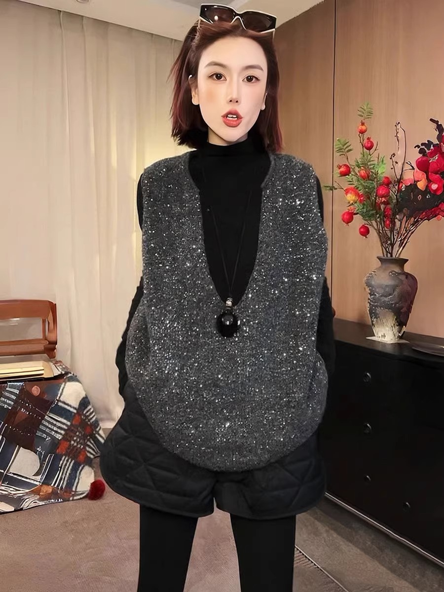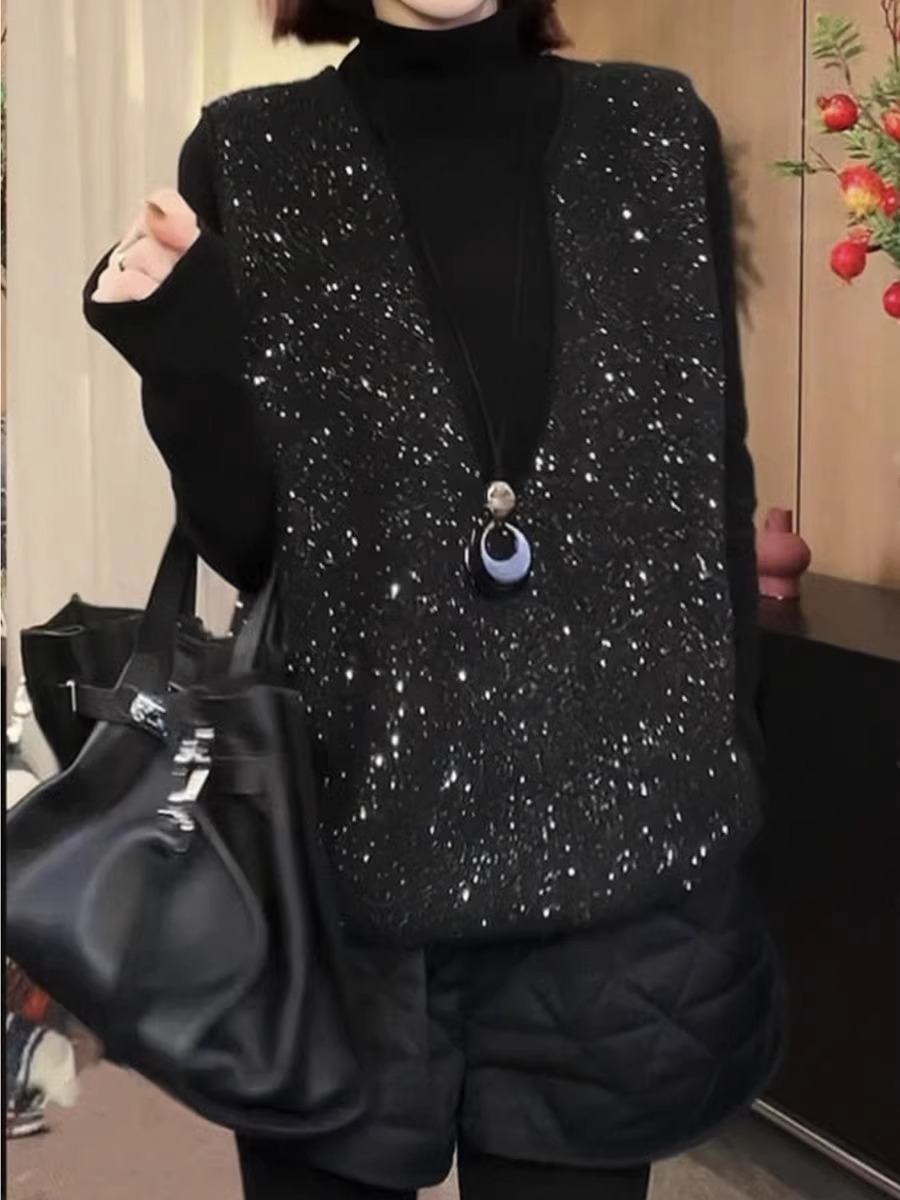 Advanced Wear V-Neck Sequins Soft Waxy Ware 니트 조끼 2025 새로운 느슨한 슬리밍 민소매 탑스토어 가기