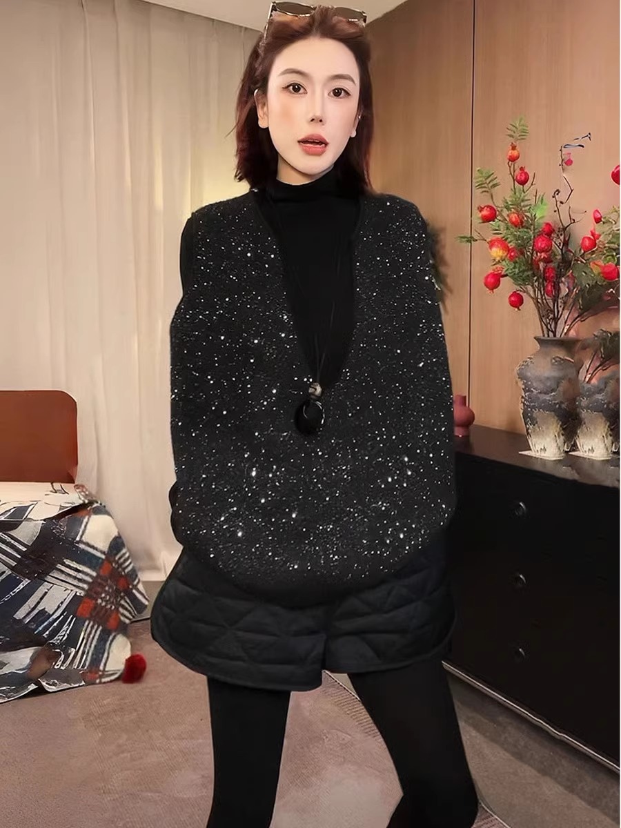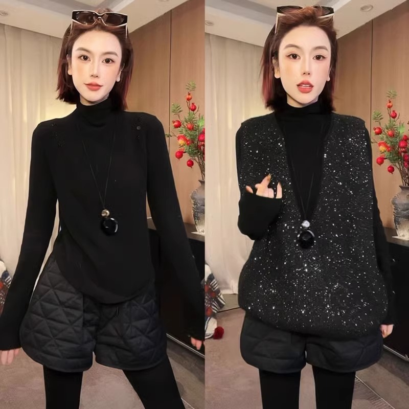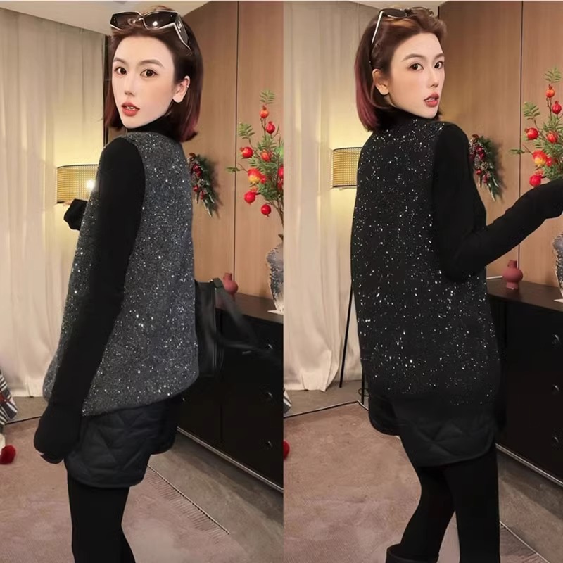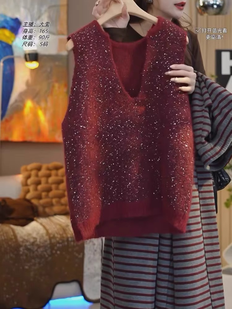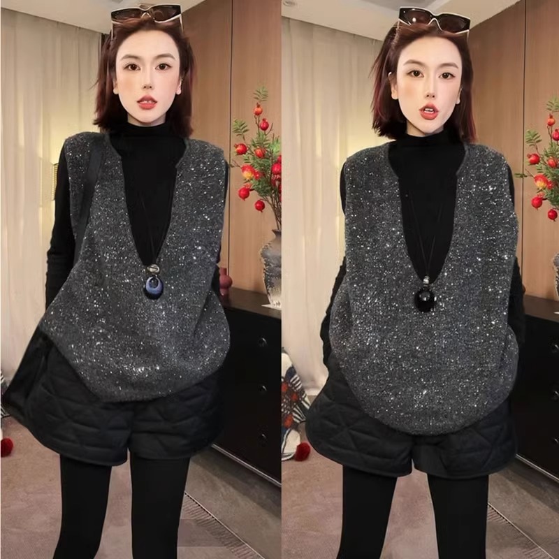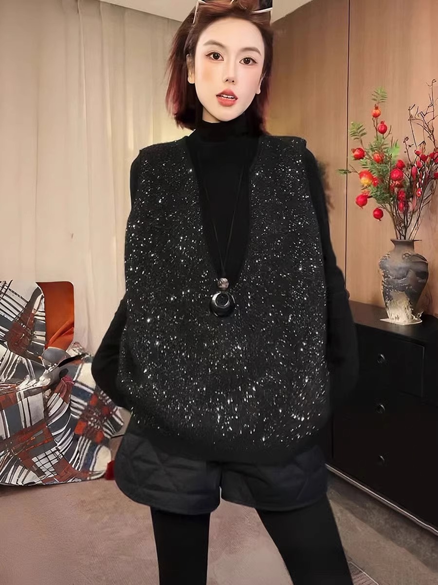 Advanced Wear V-Neck Sequins Soft Waxy Ware 니트 조끼 2025 새로운 느슨한 슬리밍 민소매 탑스토어 가기