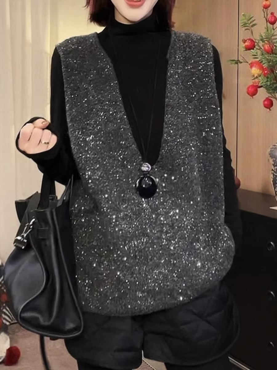 Advanced Wear V-Neck Sequins Soft Waxy Ware 니트 조끼 2025 새로운 느슨한 슬리밍 민소매 탑