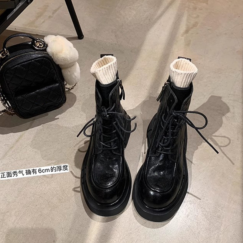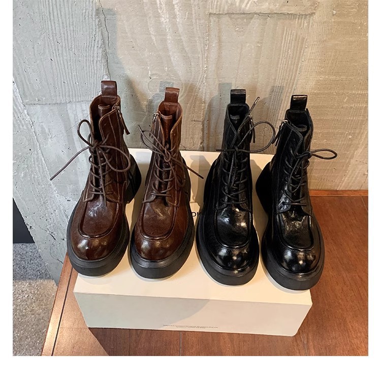Cowhide Edition ~ 포도 엄마의 가을과 겨울 새로운 라운드 헤드 정품 가죽 증가 두꺼운 하단 레이스 업 사이드 지퍼 마틴 부츠