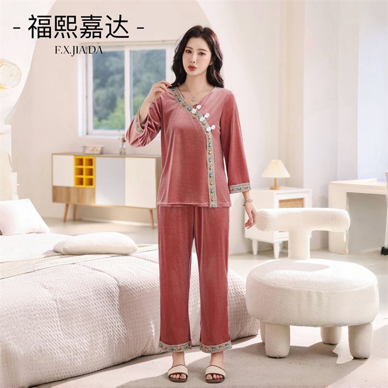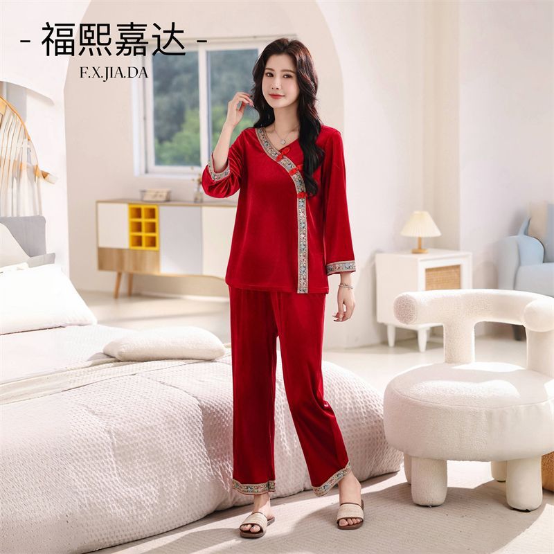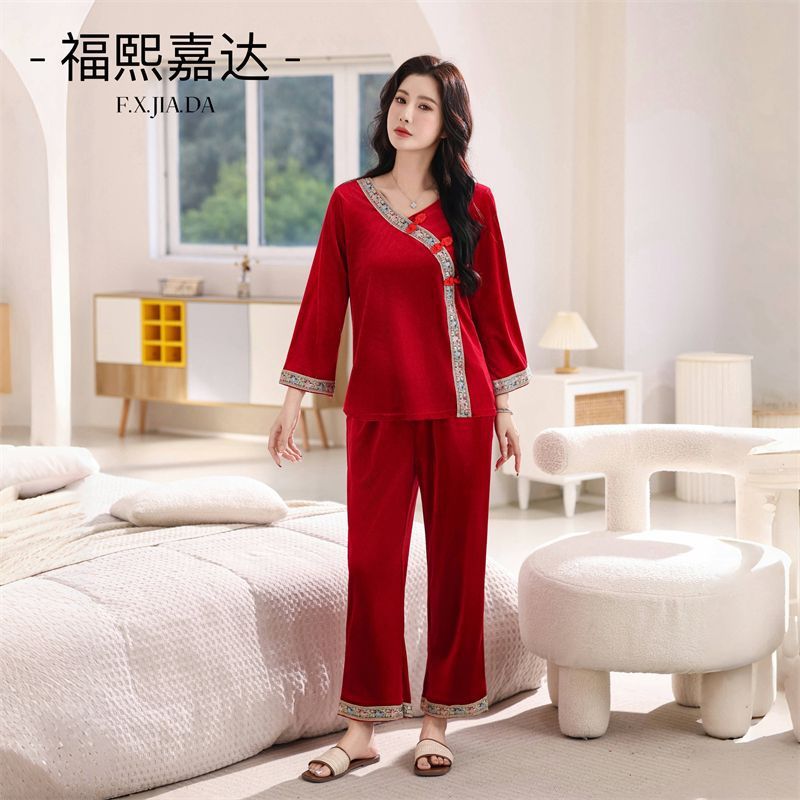 황후 세트 골드 벨벳 새로운 중국 스타일 국가 스타일 홈 의류 파자마 여성 플러스 사이즈 느슨한 외부 착용 홈 투피스 슬리밍 세트