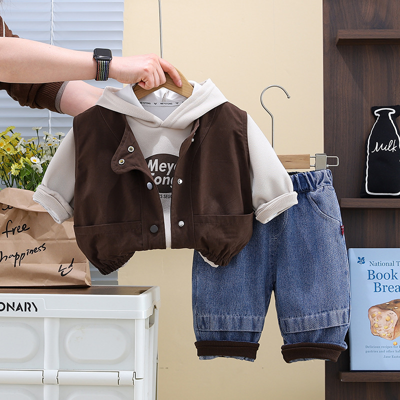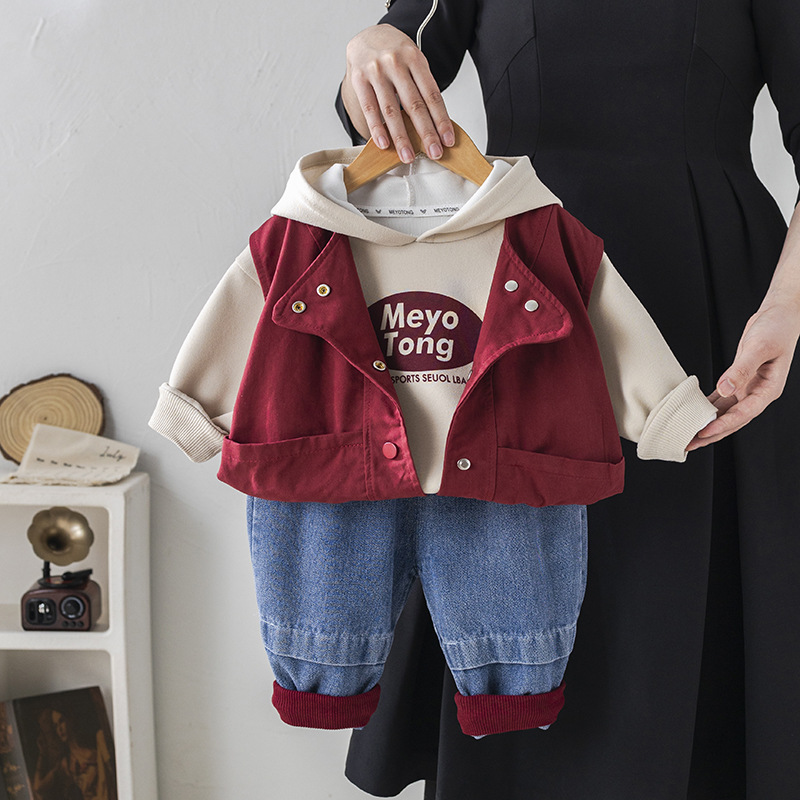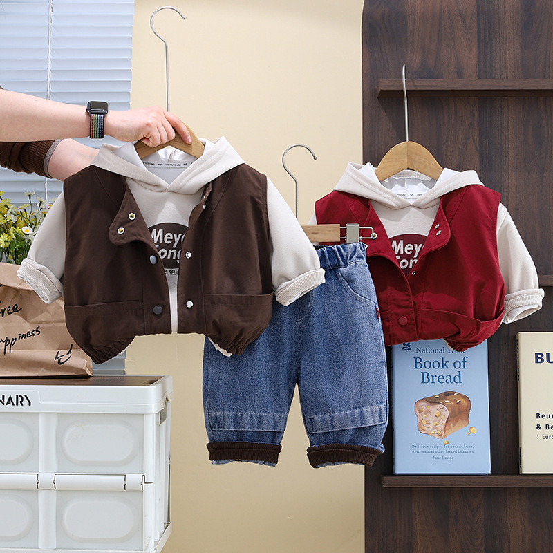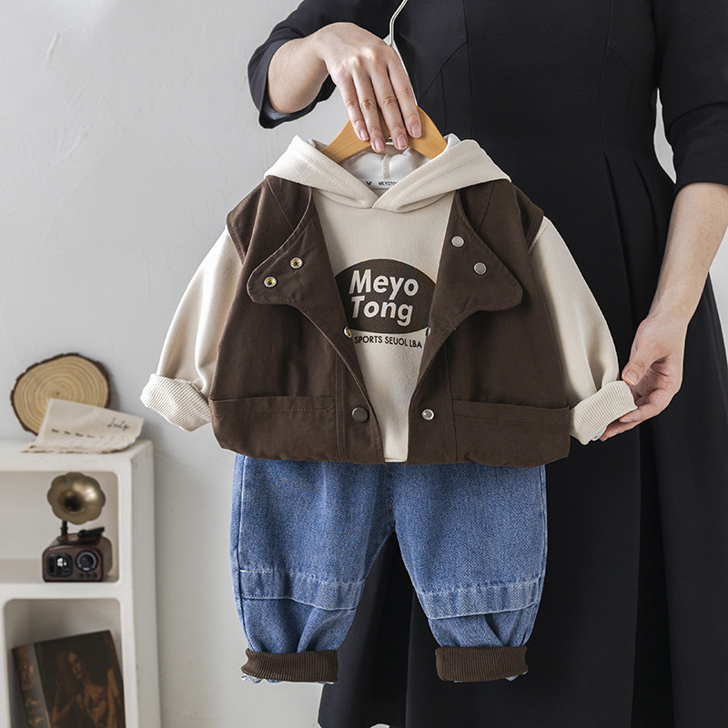 어린이 의류 소년 봄 의류 세트 단색 편지 후드 조끼 3 조각 세트 봄과 가을 아기 소년 옷 유행