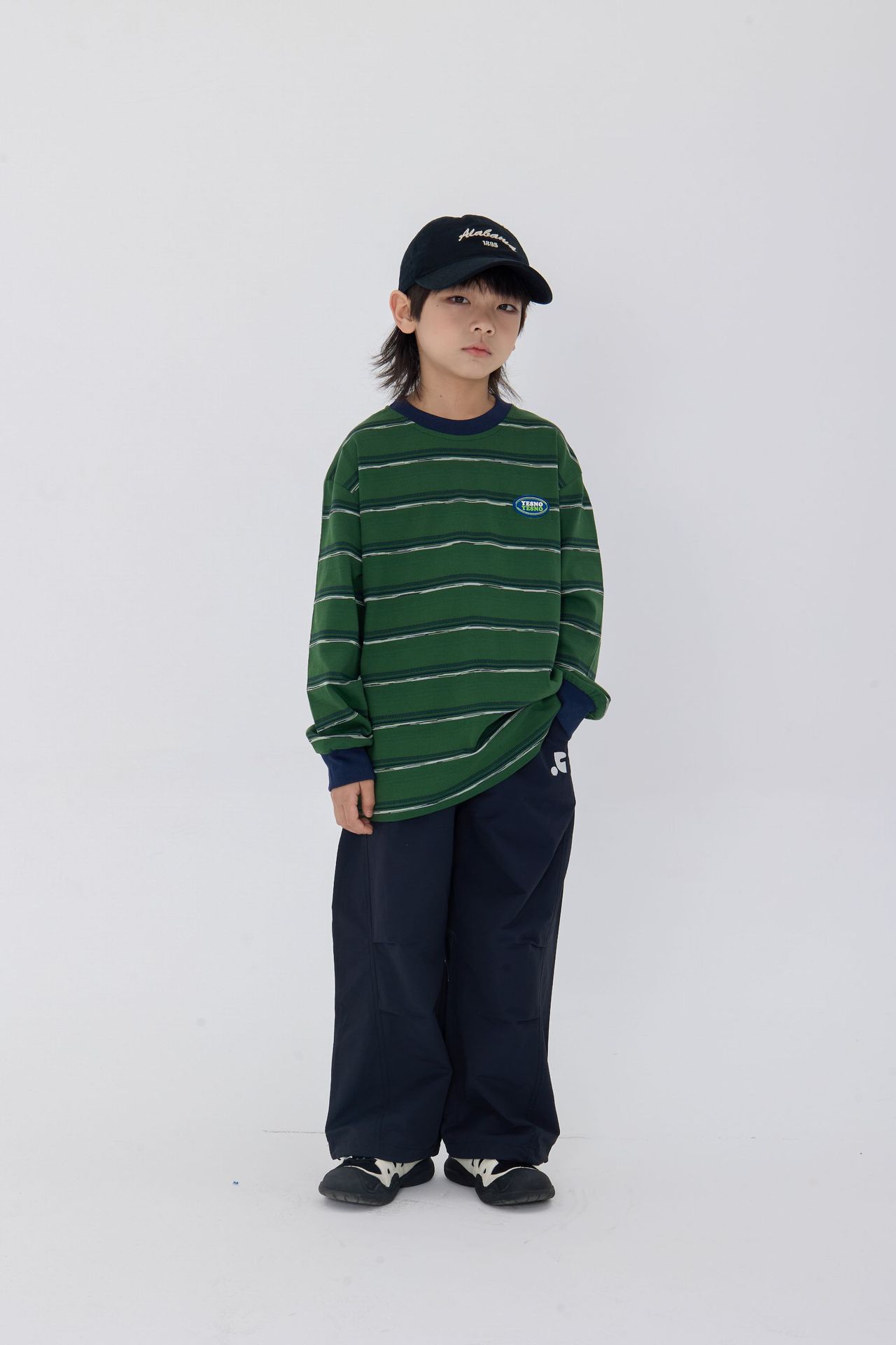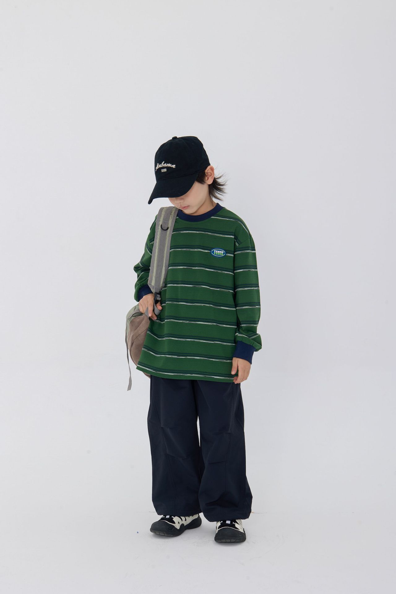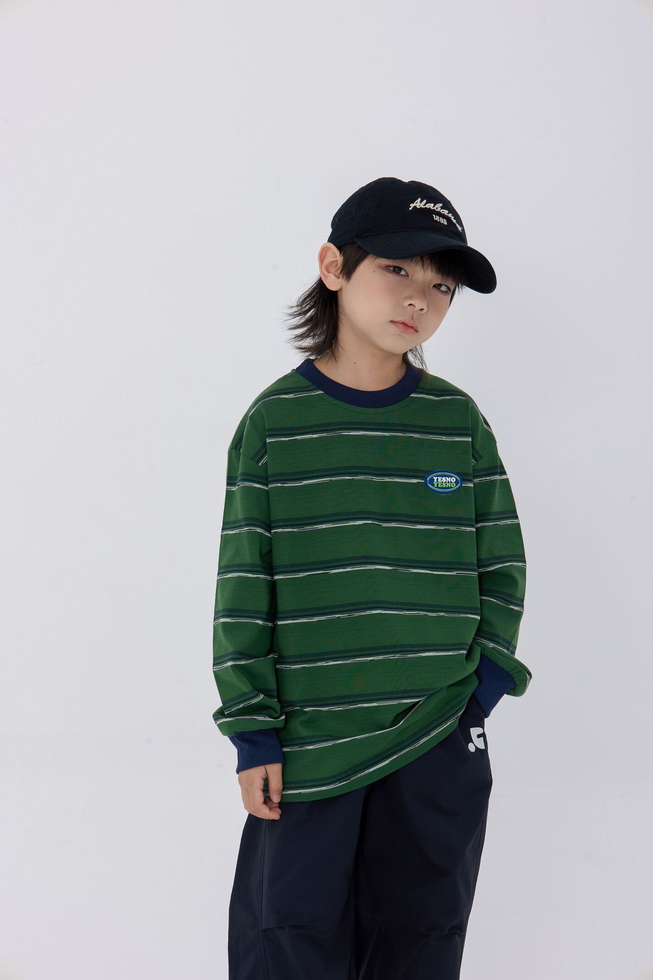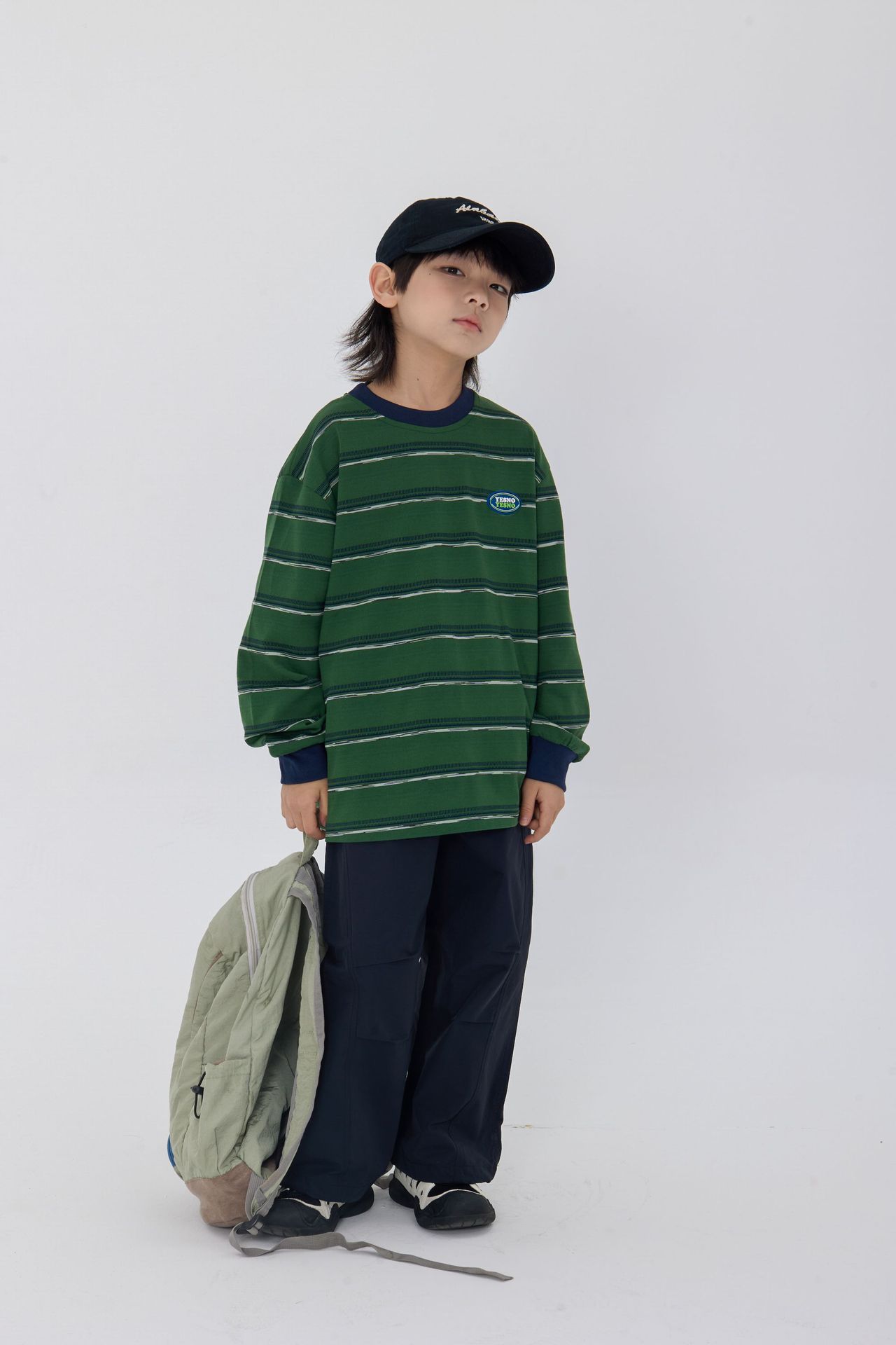 25 가을 새로운 드롭 어깨 어린이 긴 티셔츠 녹색 줄무늬 가죽 라벨 장식 어린이 모든 경기 티셔츠스토어 가기