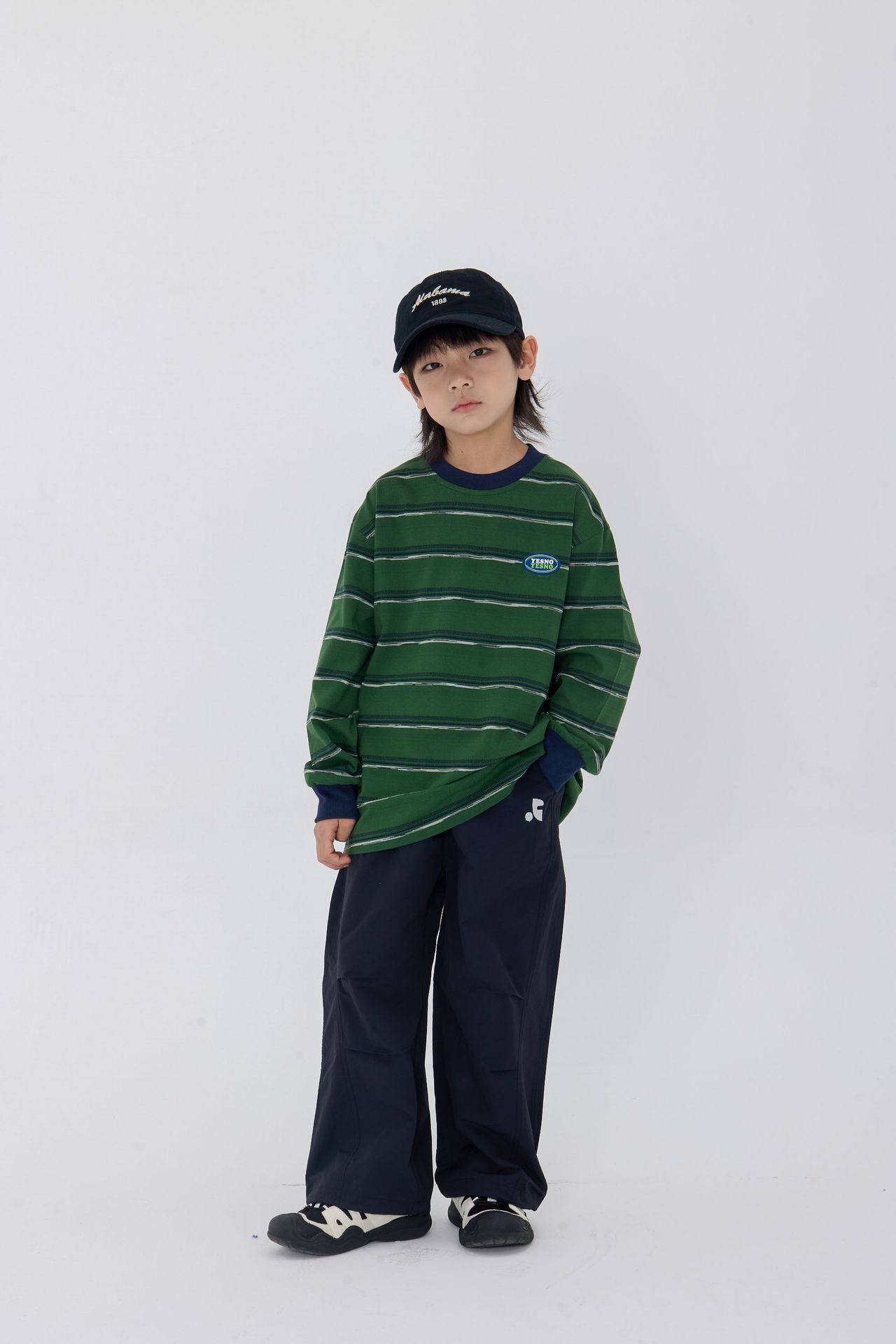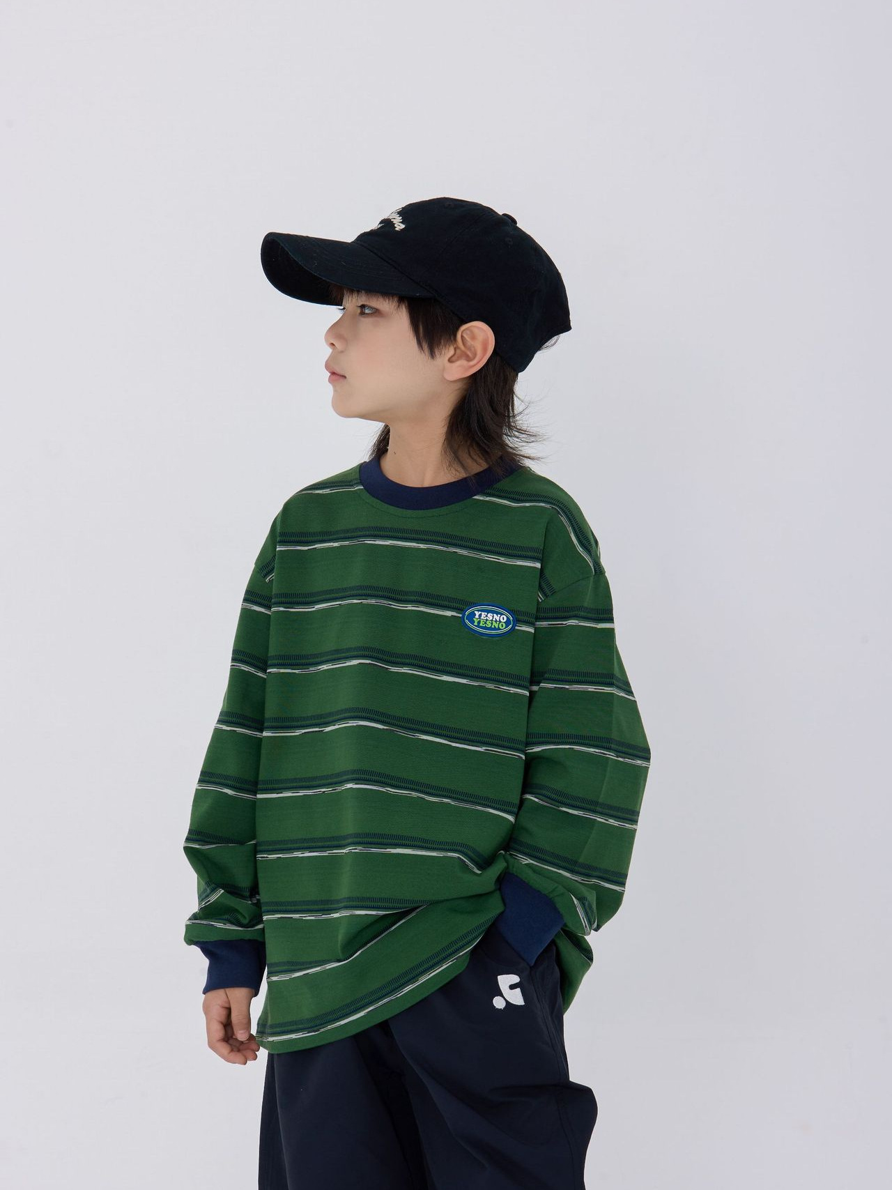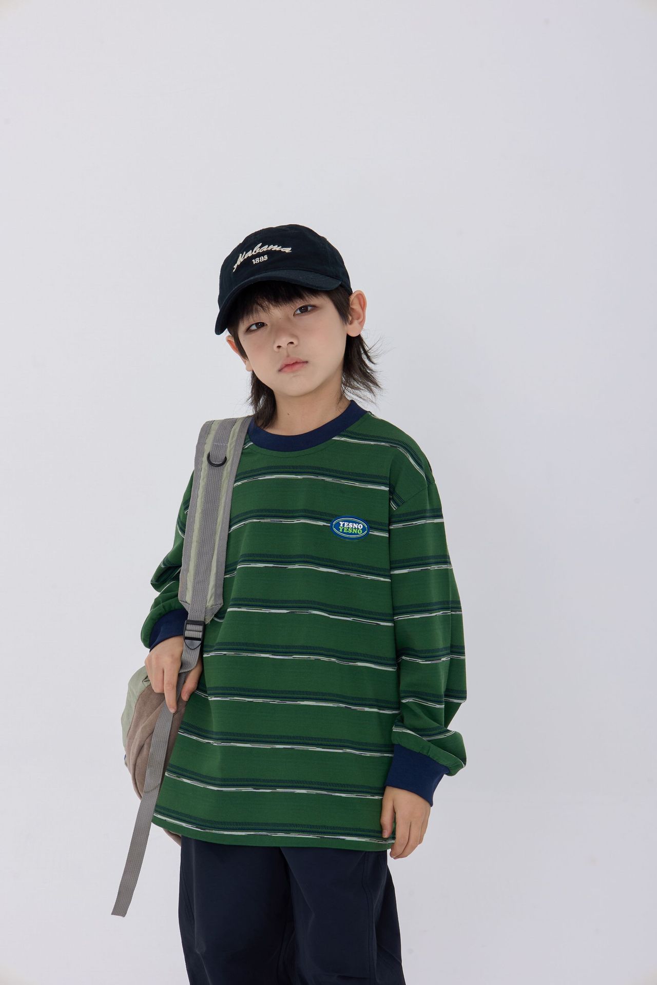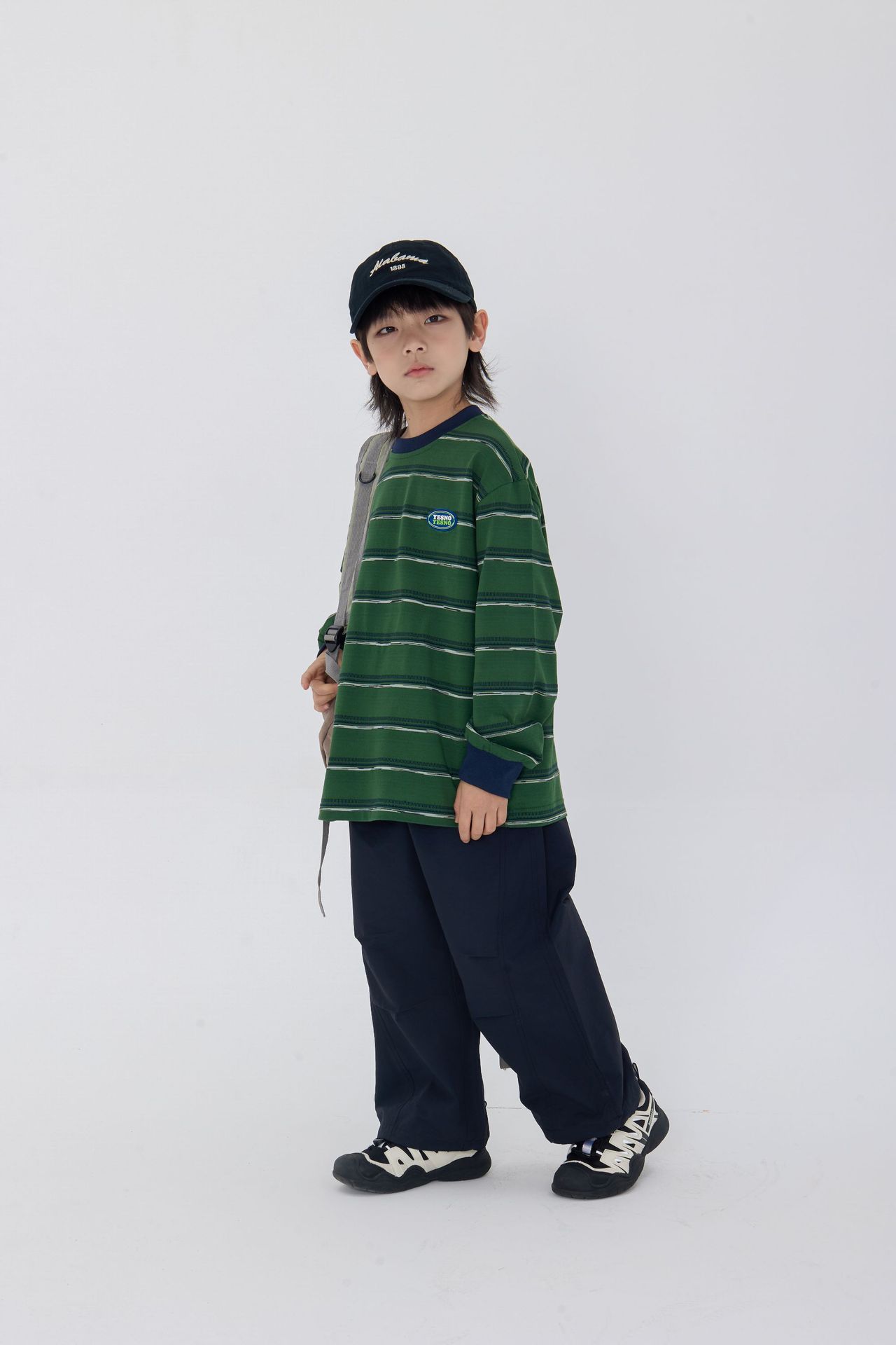 25 가을 새로운 드롭 어깨 어린이 긴 티셔츠 녹색 줄무늬 가죽 라벨 장식 어린이 모든 경기 티셔츠스토어 가기