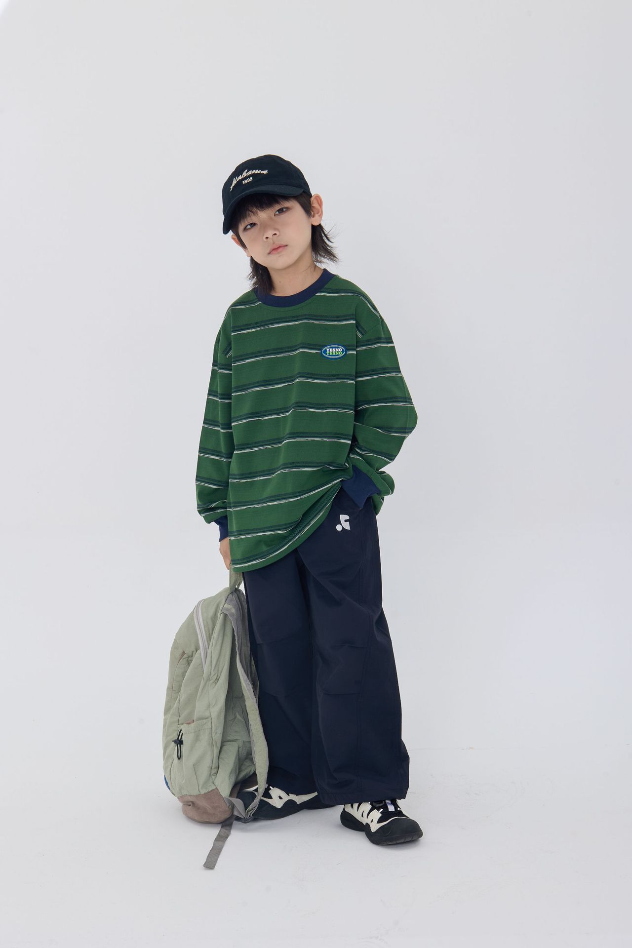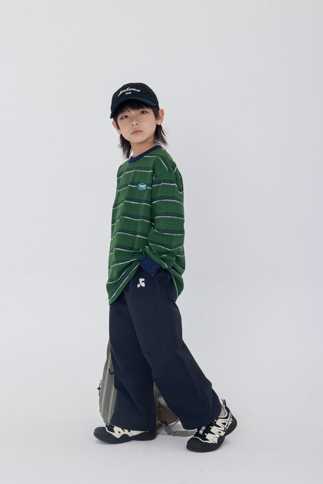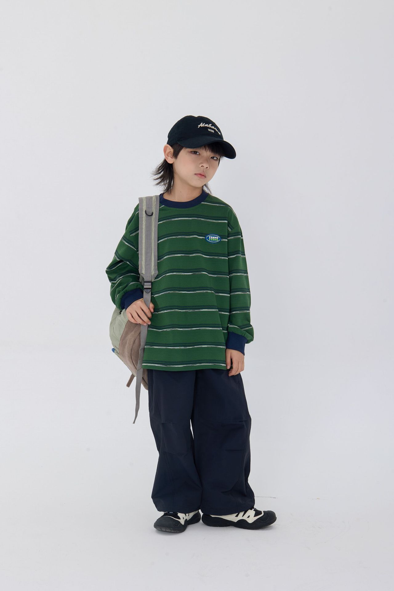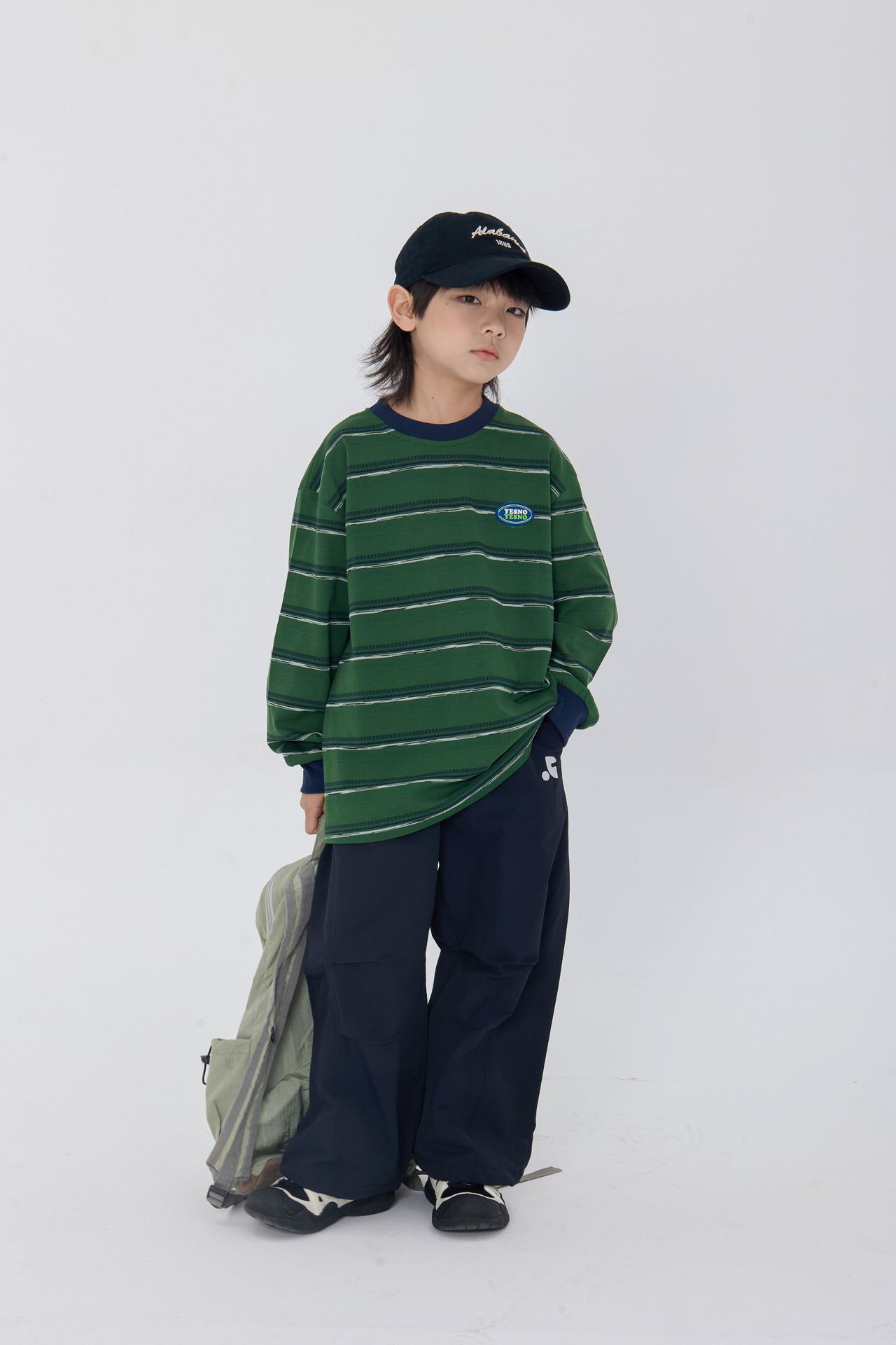 25 가을 새로운 드롭 어깨 어린이 긴 티셔츠 녹색 줄무늬 가죽 라벨 장식 어린이 모든 경기 티셔츠스토어 가기