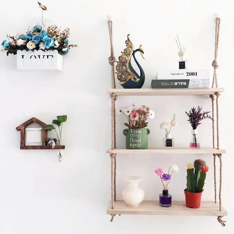 펀치없는 스토리지 랙 대마 로프 파티션 나무 책장 벽 장식 랙 라미네이트 거실 벽걸이 스토리지 랙