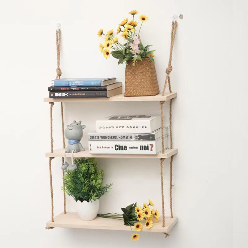 펀치없는 스토리지 랙 대마 로프 파티션 나무 책장 벽 장식 랙 라미네이트 거실 벽걸이 스토리지 랙스토어 가기
