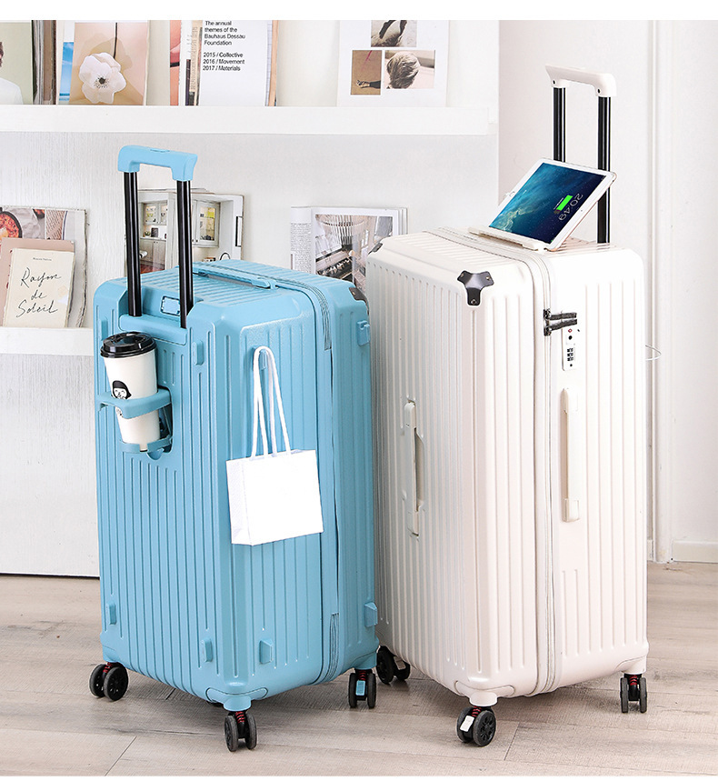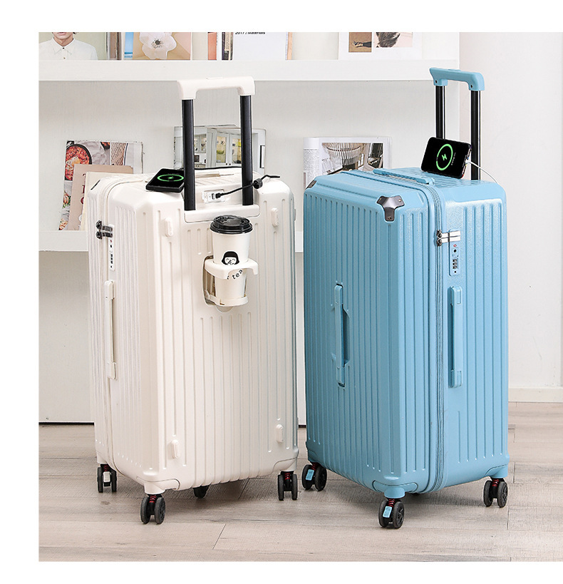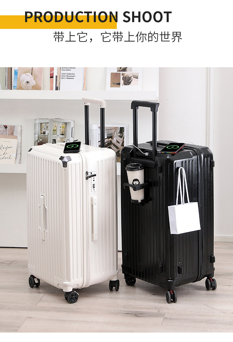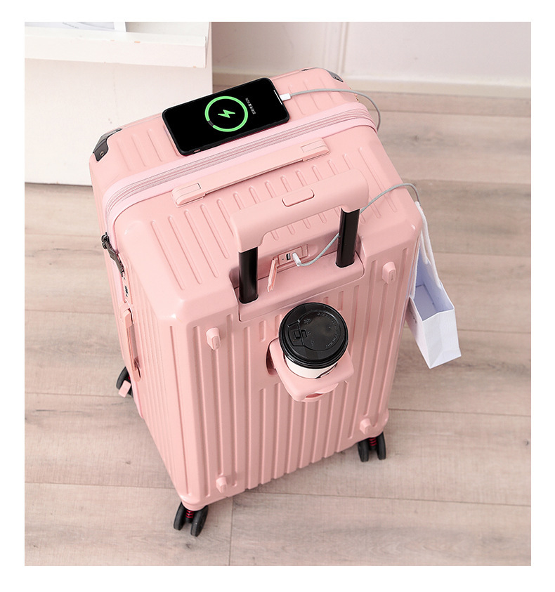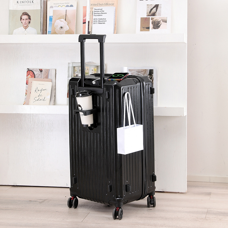 5 륜 고 가치 여성 유니버설 휠 브레이크 충격 흡수 남성용 여행 가방을 충전하는 컵 홀더가있는 대용량 지퍼 수하물
