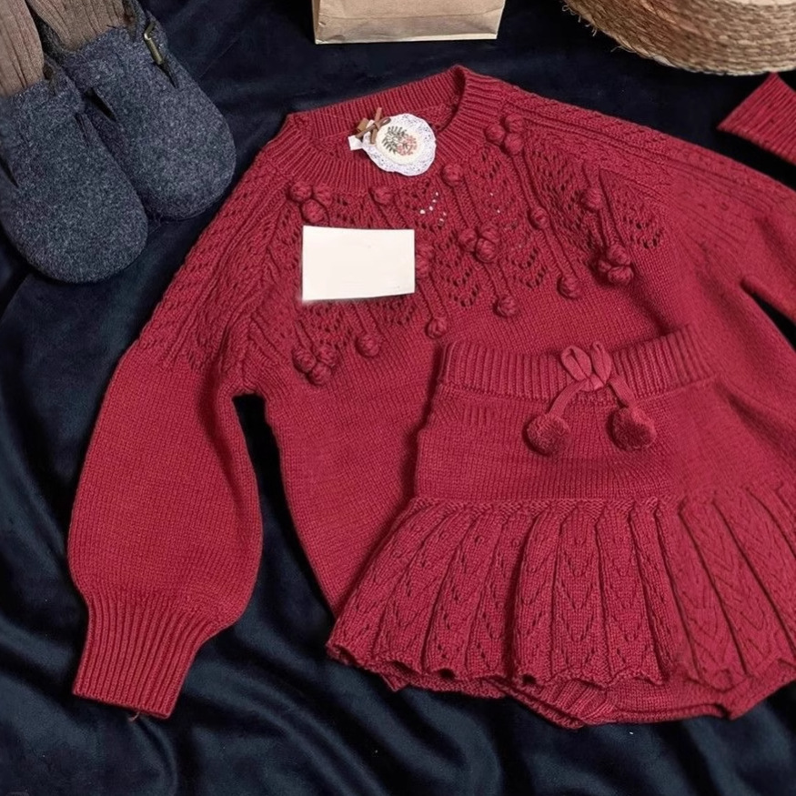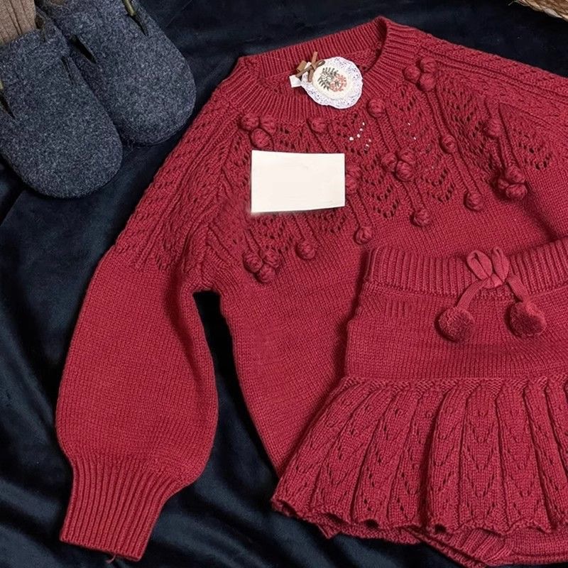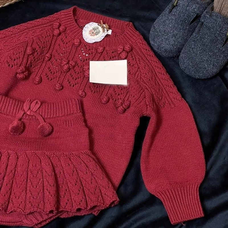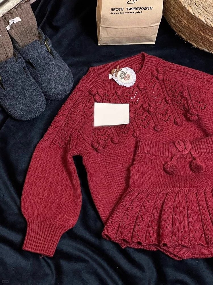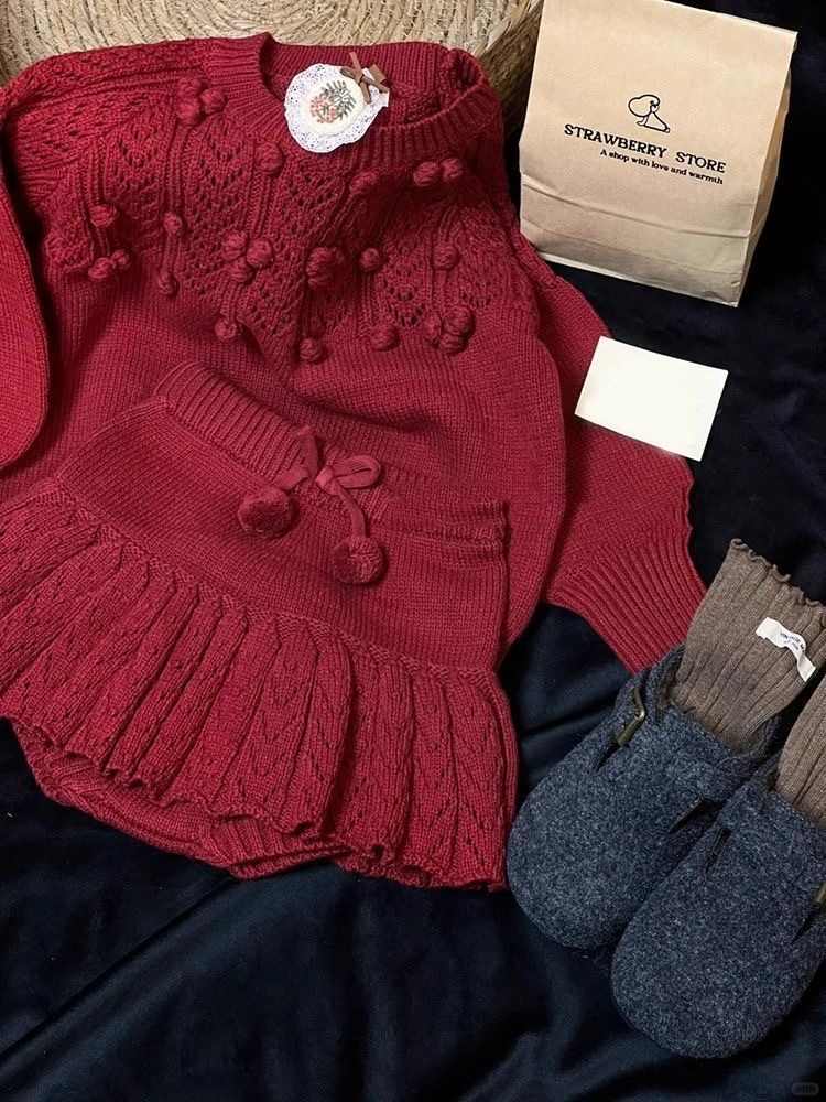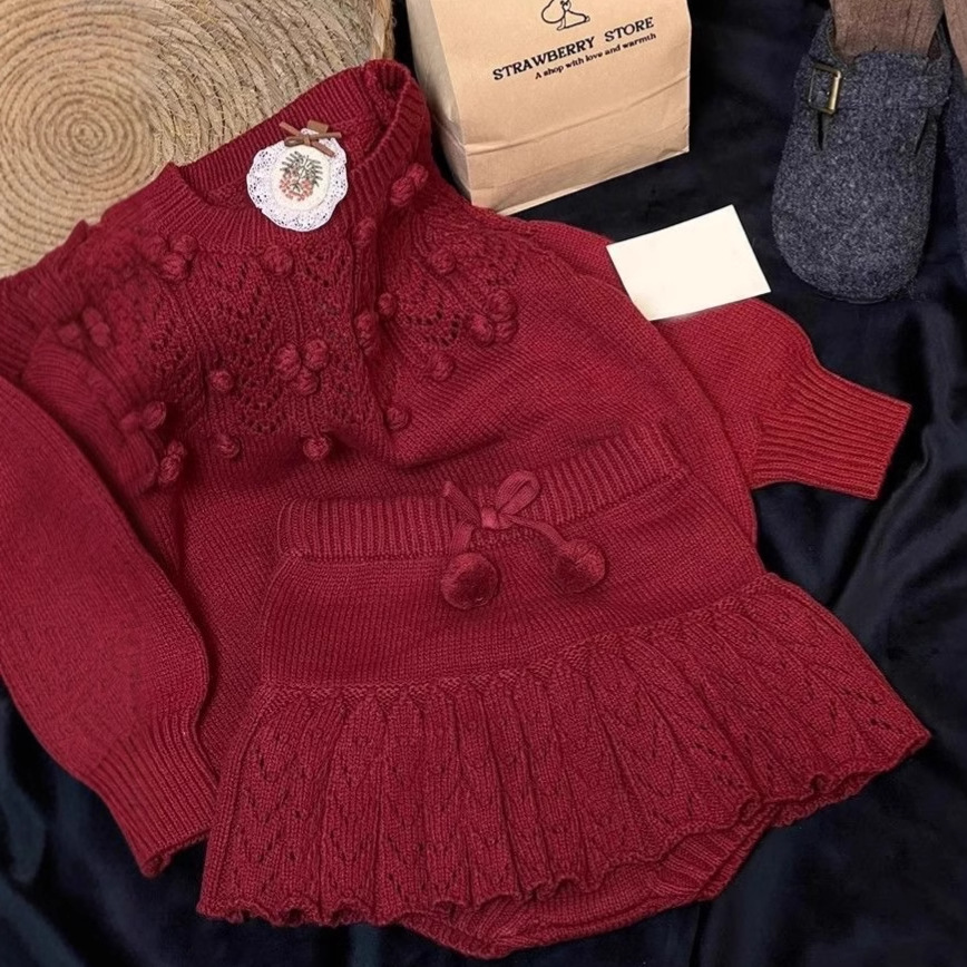 한국 소녀 2025 가을 겨울 신년 빨간 니트 세트 아기 소녀 스테레오 볼 풀오버 스웨터 스커트스토어 가기