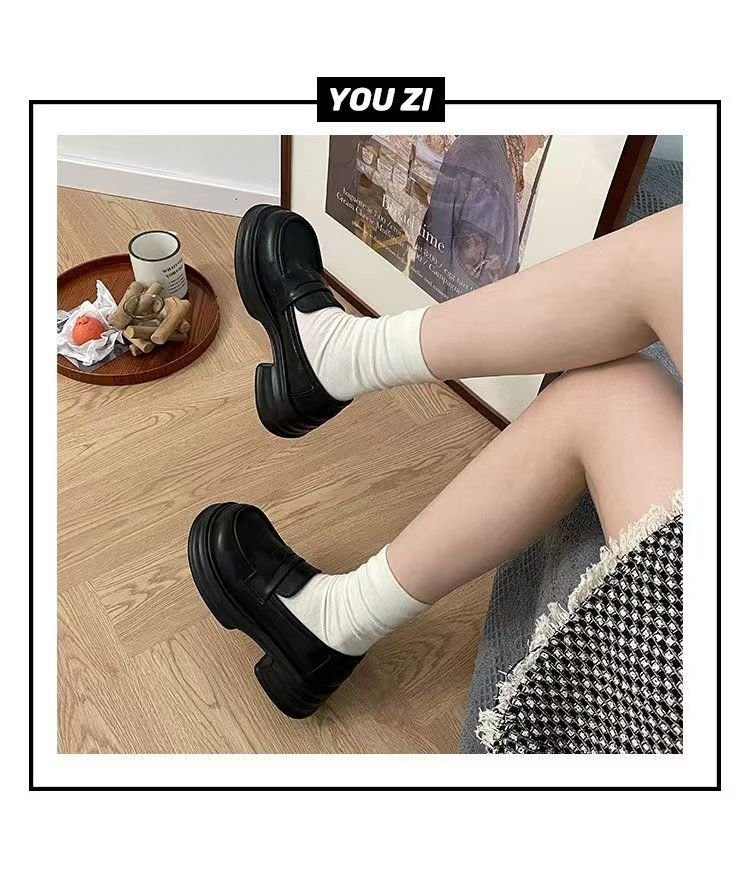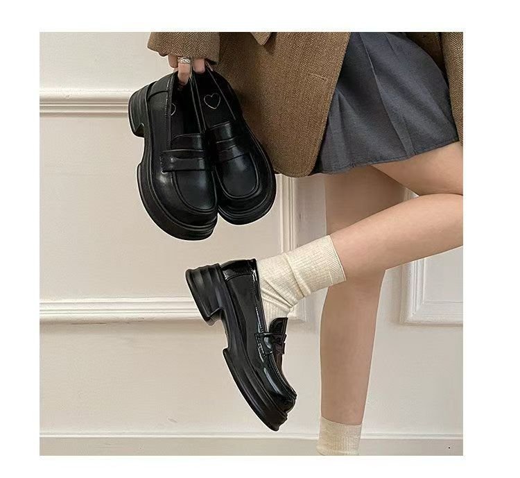 검은 굵은 가죽 신발 여성 영국 2025 새로운 봄 복고풍 Jk 균일 한 싱글 레이어 신발 두꺼운 밑바닥 로퍼 증가스토어 가기