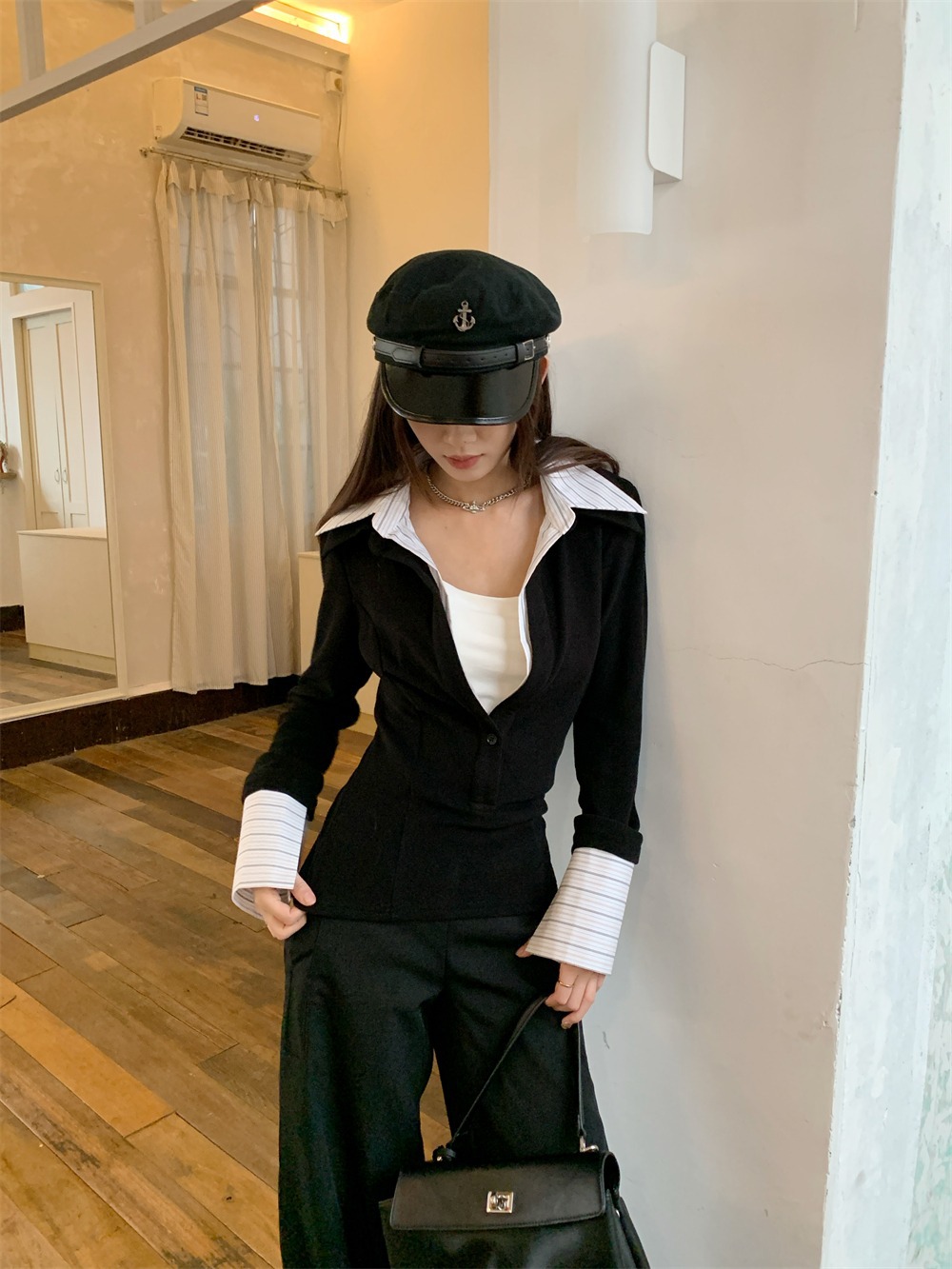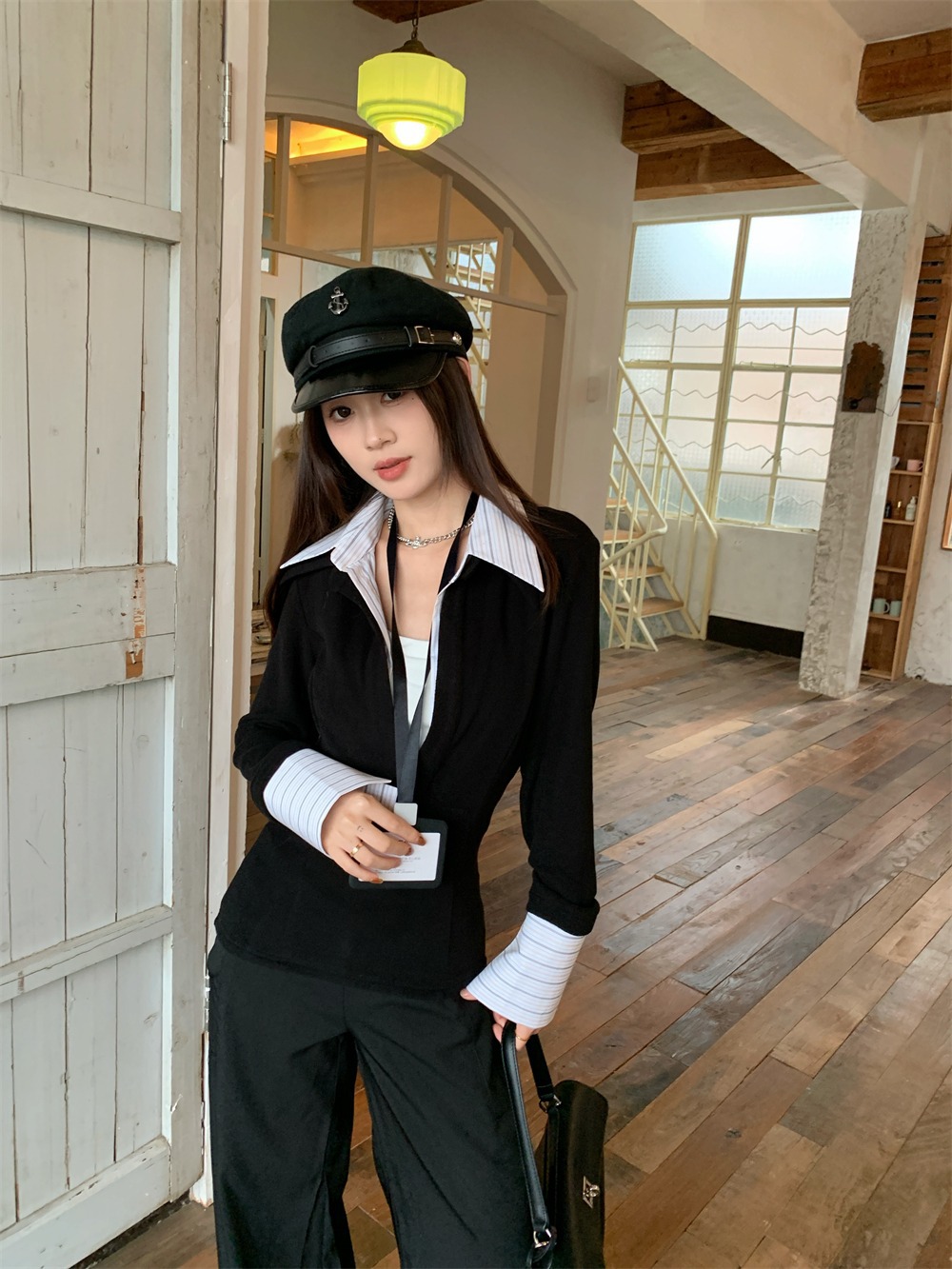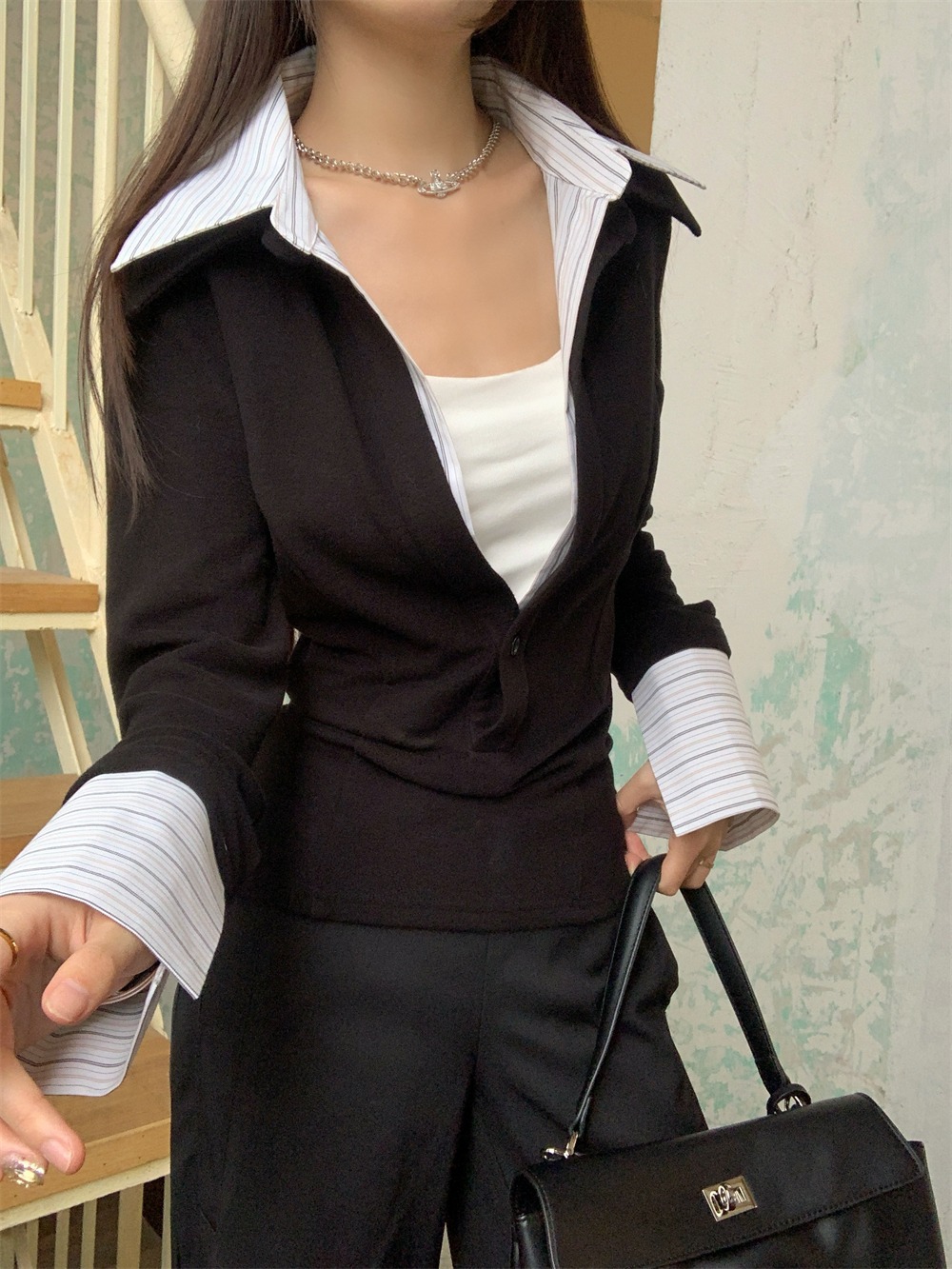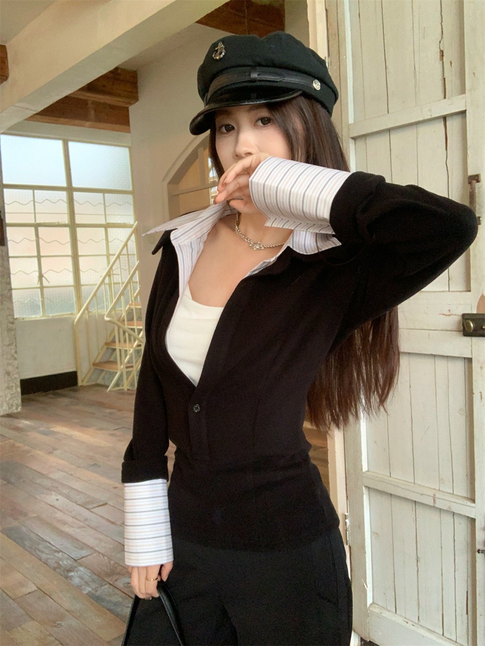 가을 2024 새로운 POLO 칼라 가짜 투피스 스티치 티셔츠 슬림 핏 슬리밍 스파이스 소녀 순수한 욕망 짧은 최고 여성