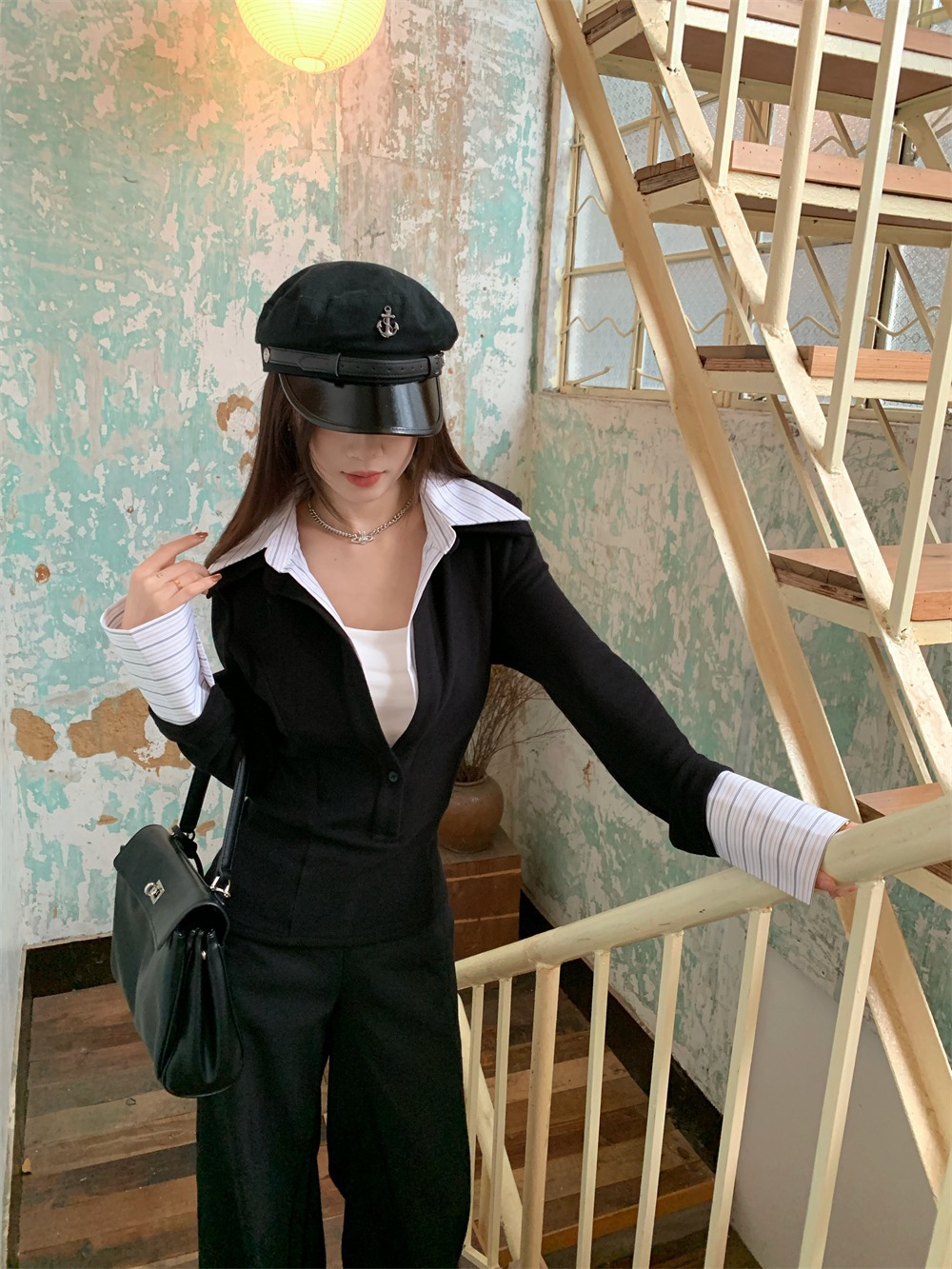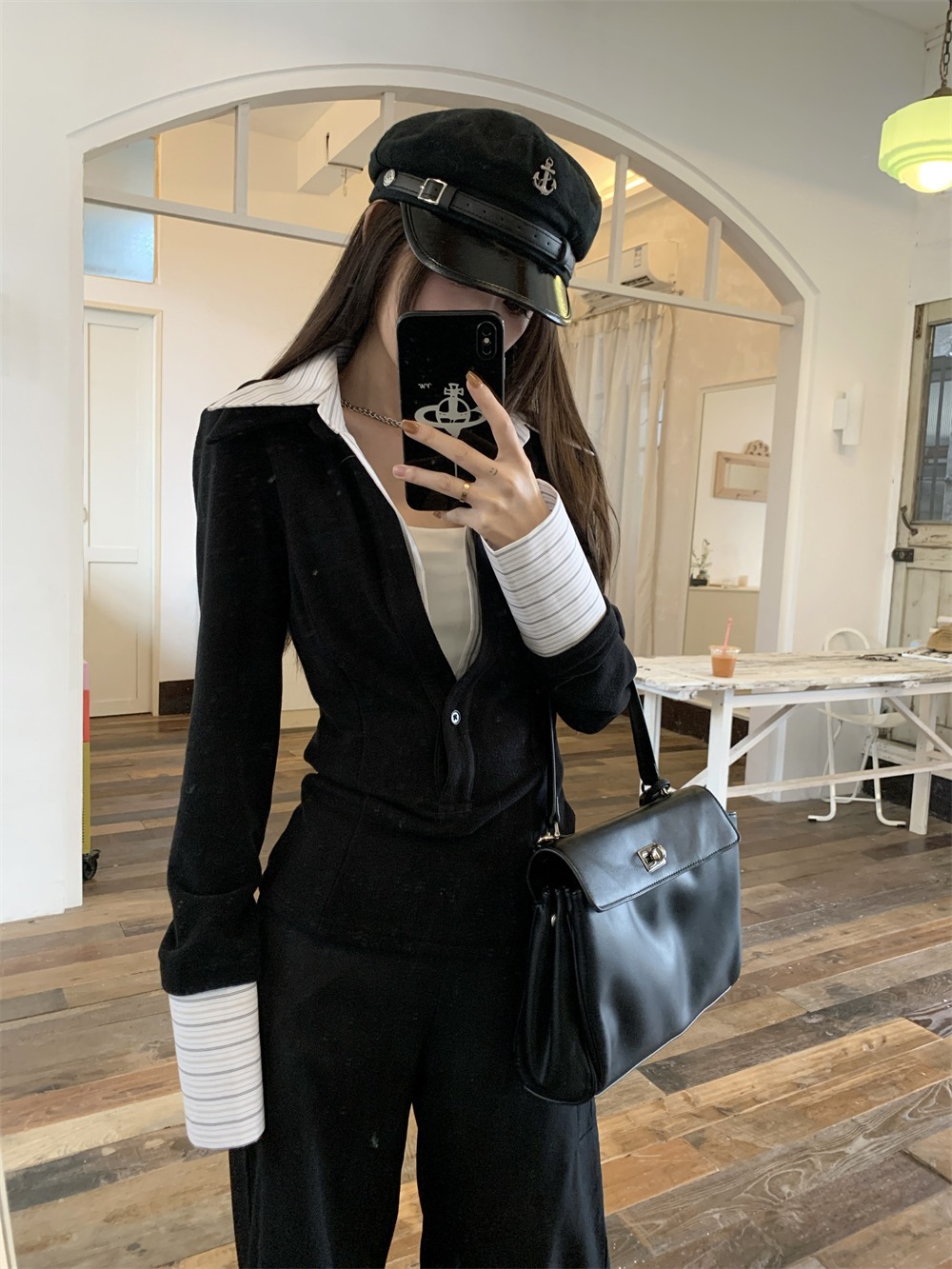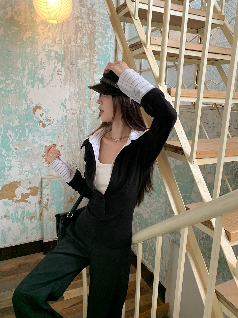 가을 2024 새로운 POLO 칼라 가짜 투피스 스티치 티셔츠 슬림 핏 슬리밍 스파이스 소녀 순수한 욕망 짧은 최고 여성