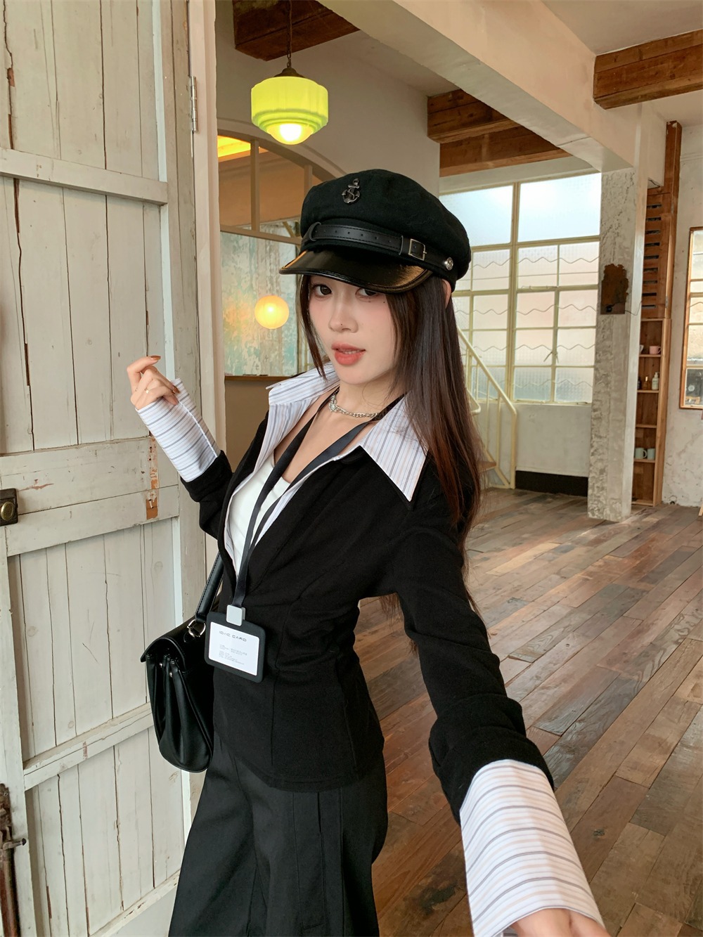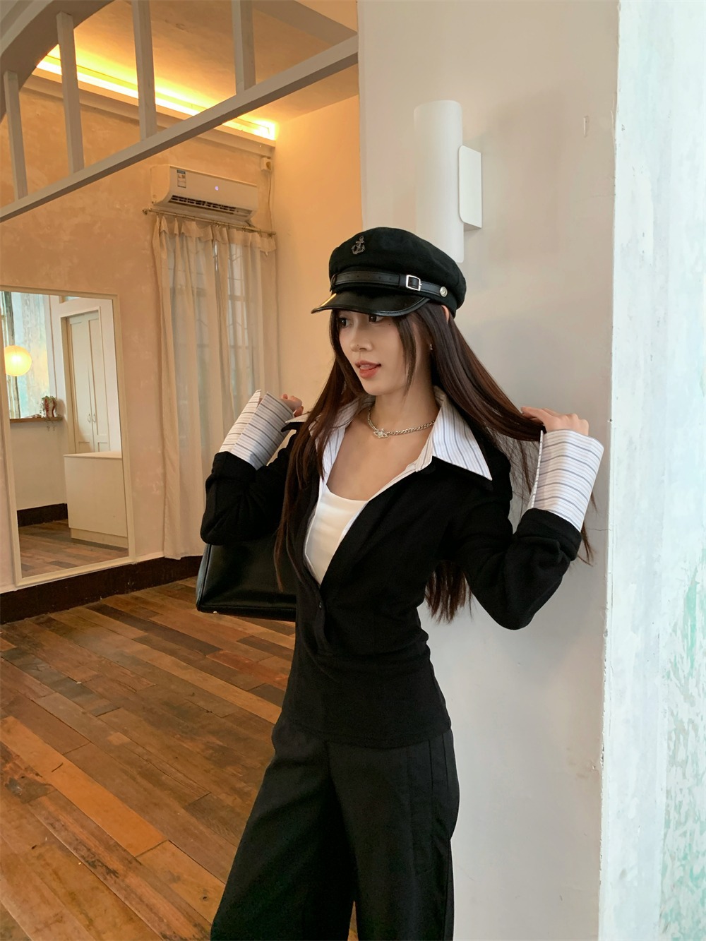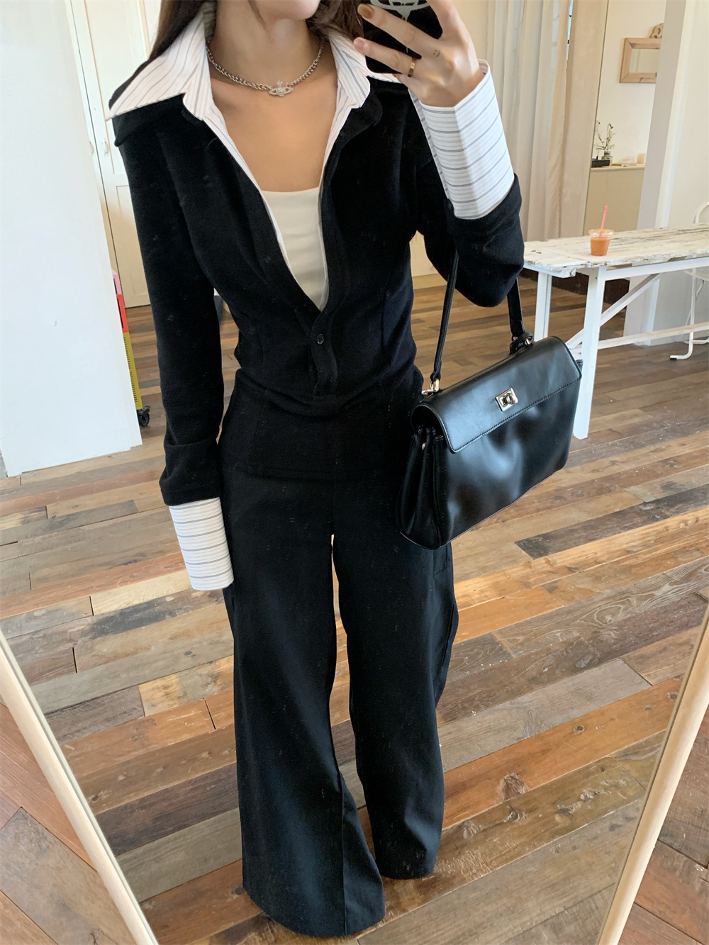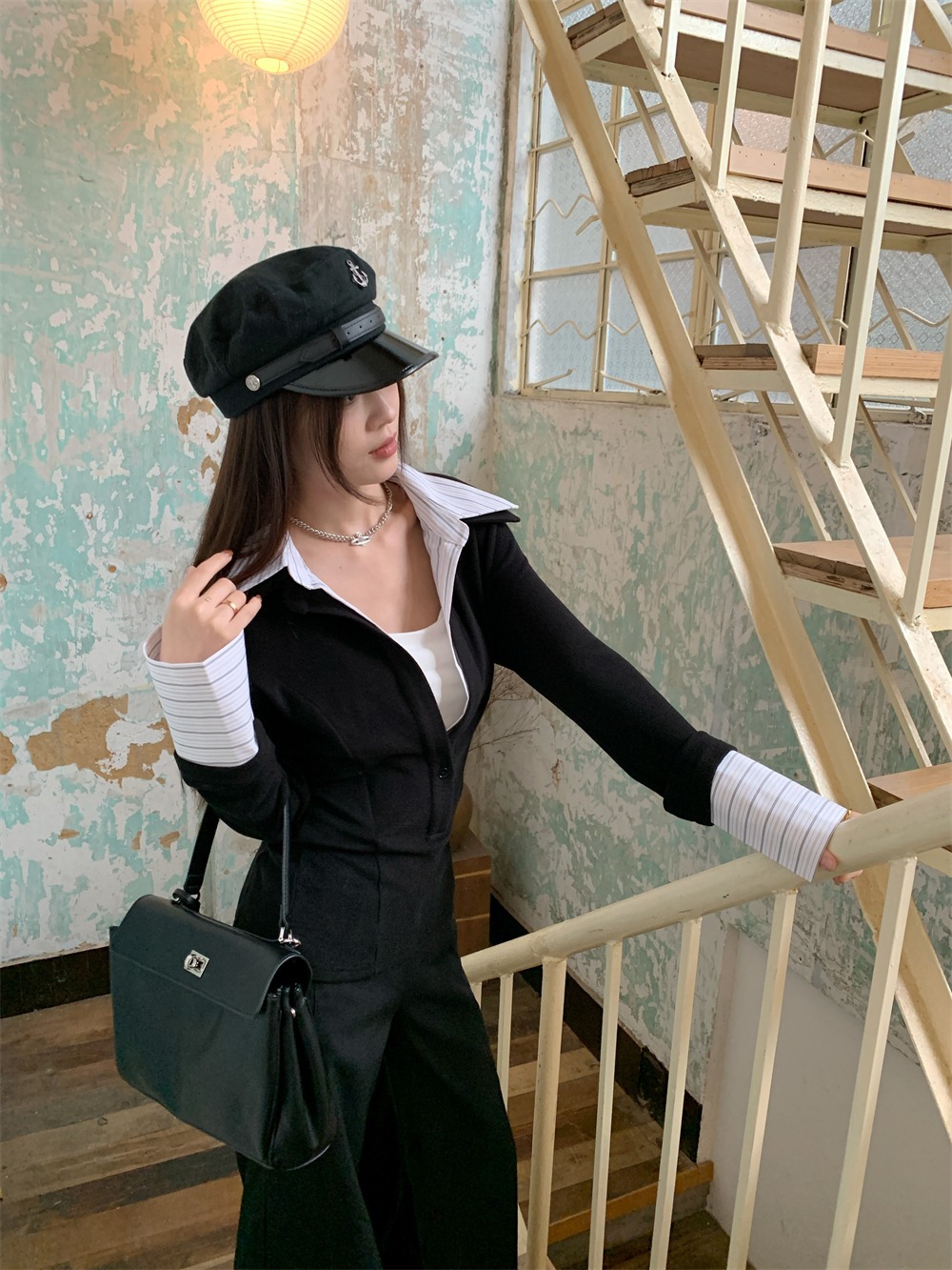 가을 2024 새로운 POLO 칼라 가짜 투피스 스티치 티셔츠 슬림 핏 슬리밍 스파이스 소녀 순수한 욕망 짧은 최고 여성