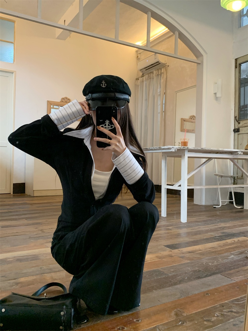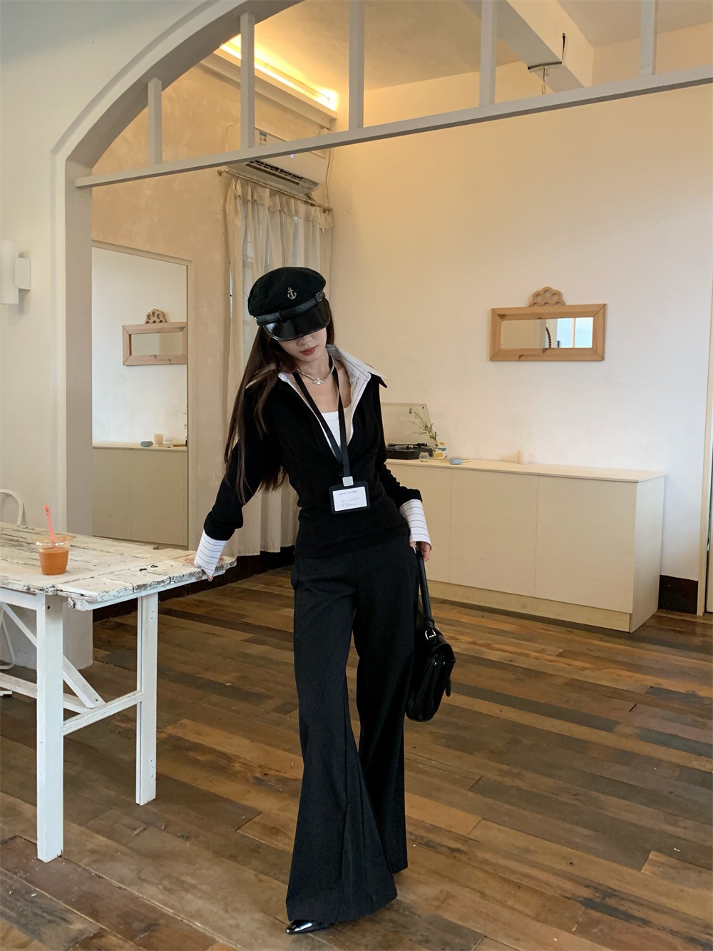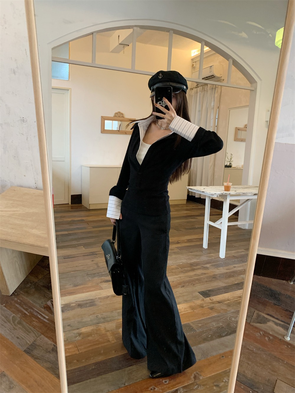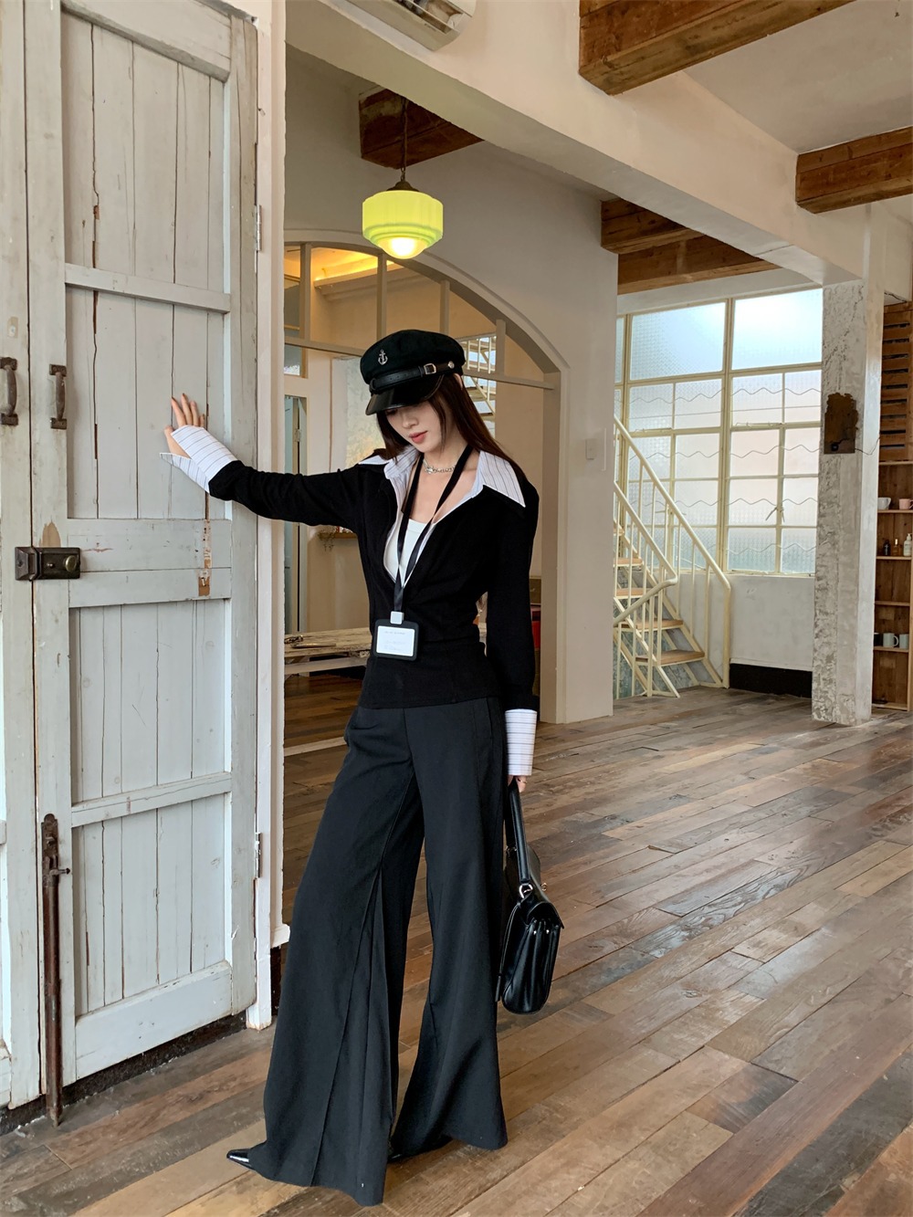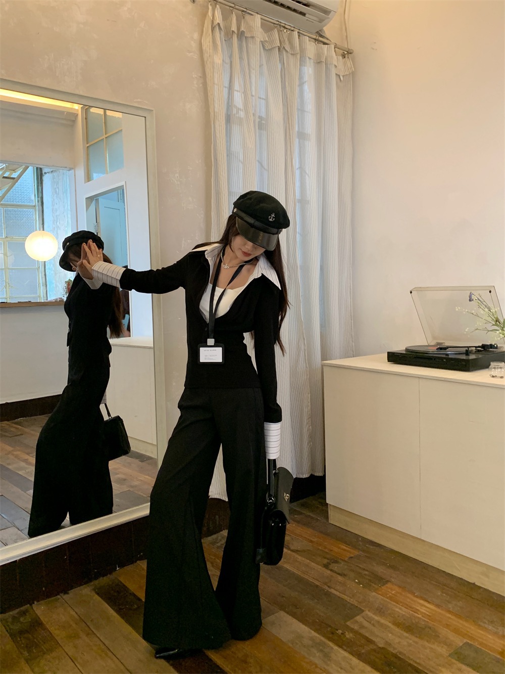 가을 2024 새로운 POLO 칼라 가짜 투피스 스티치 티셔츠 슬림 핏 슬리밍 스파이스 소녀 순수한 욕망 짧은 최고 여성스토어 가기