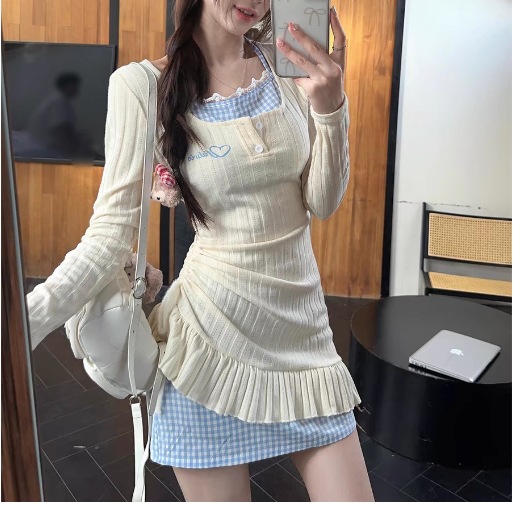 순수한 욕망 스타일 교수형 목 원피스 여성의 가을 가짜 투피스 치마 달콤한 스파이스 소녀 타이트 허리 불규칙한 스티칭 스택 스커트스토어 가기