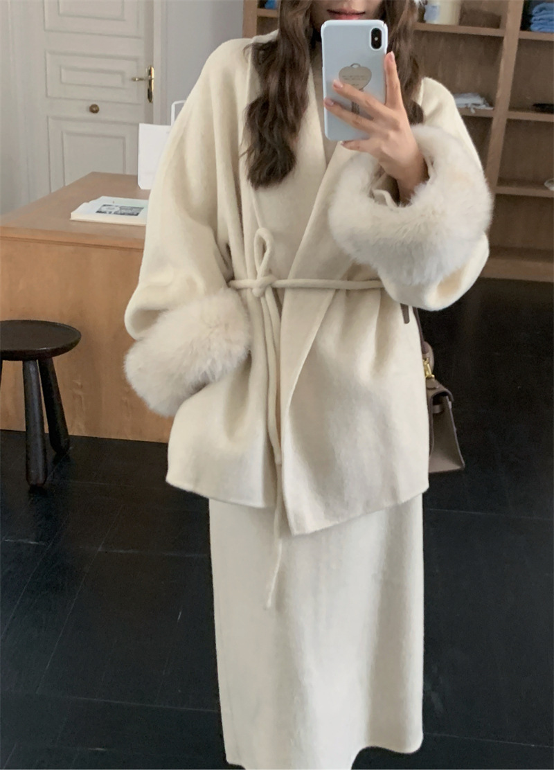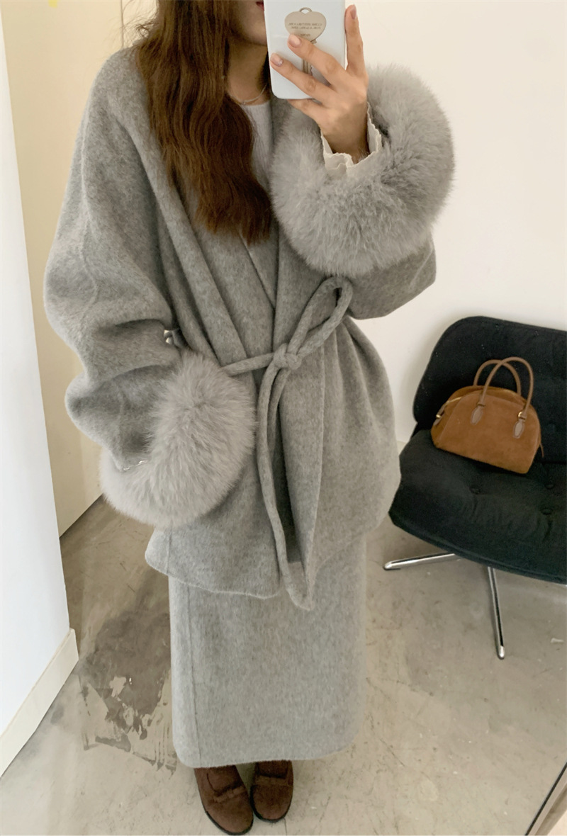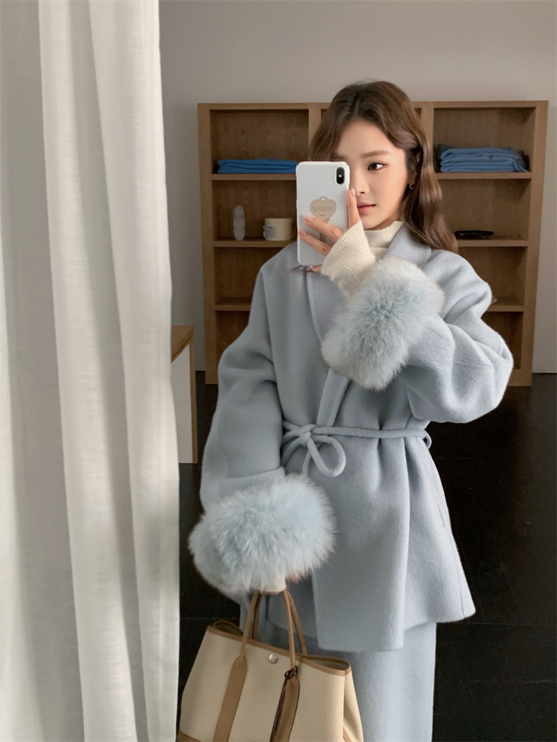 韩国东大门手缝羊绒羊毛大衣套装