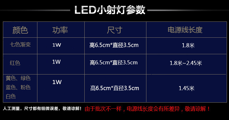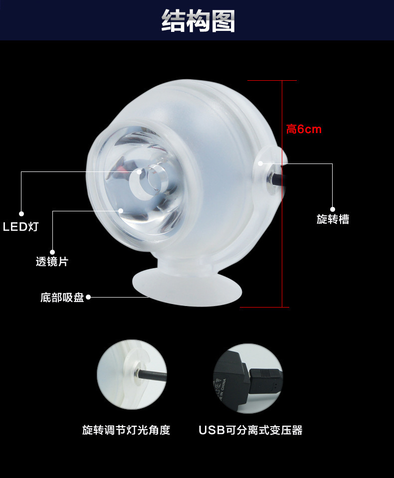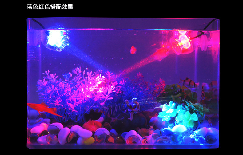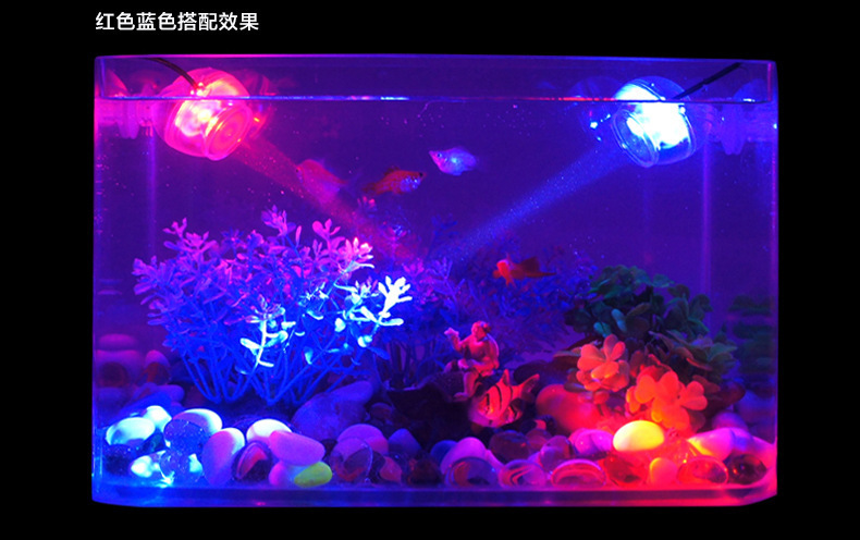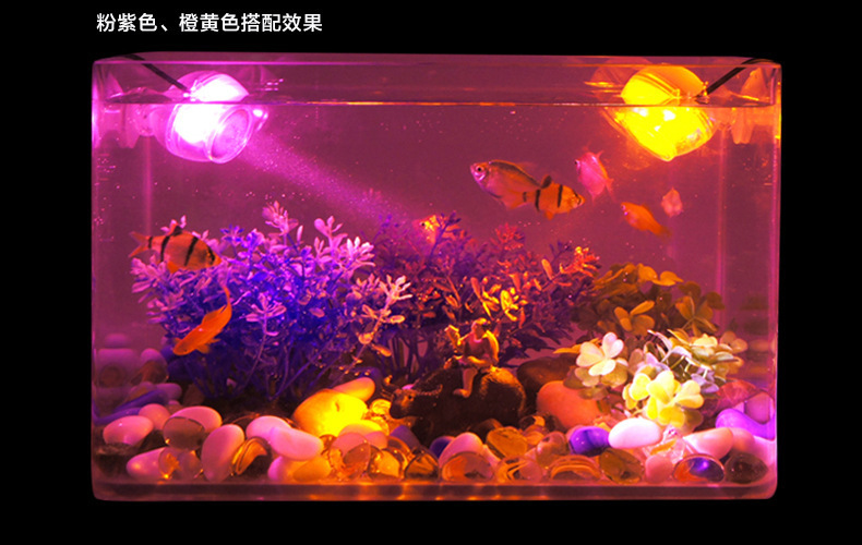 1、本品功率仅为1W,有多种颜色可选择,可随意安装在水族箱中作为照明及点缀装饰之用。只要将光线调整不同角度,照射水中的养殖物,将会造就光彩异样的景色。