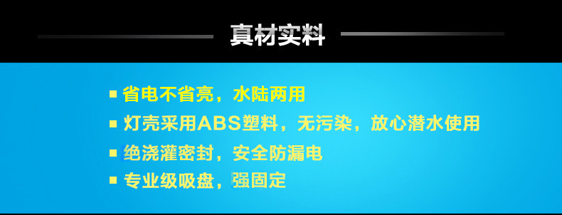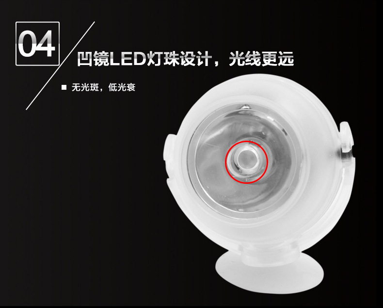 2、本品说明是要求全潜水使用,有吸盘配送。但是实际是可以水陆两用的!只是不在水里使用时会影响约20%的使用寿命,如果正常使用寿命是1万小时,那么在水外使用的话可能就只有8000小时了。