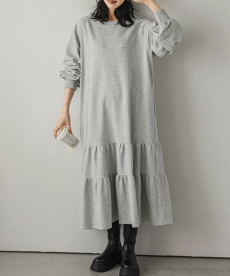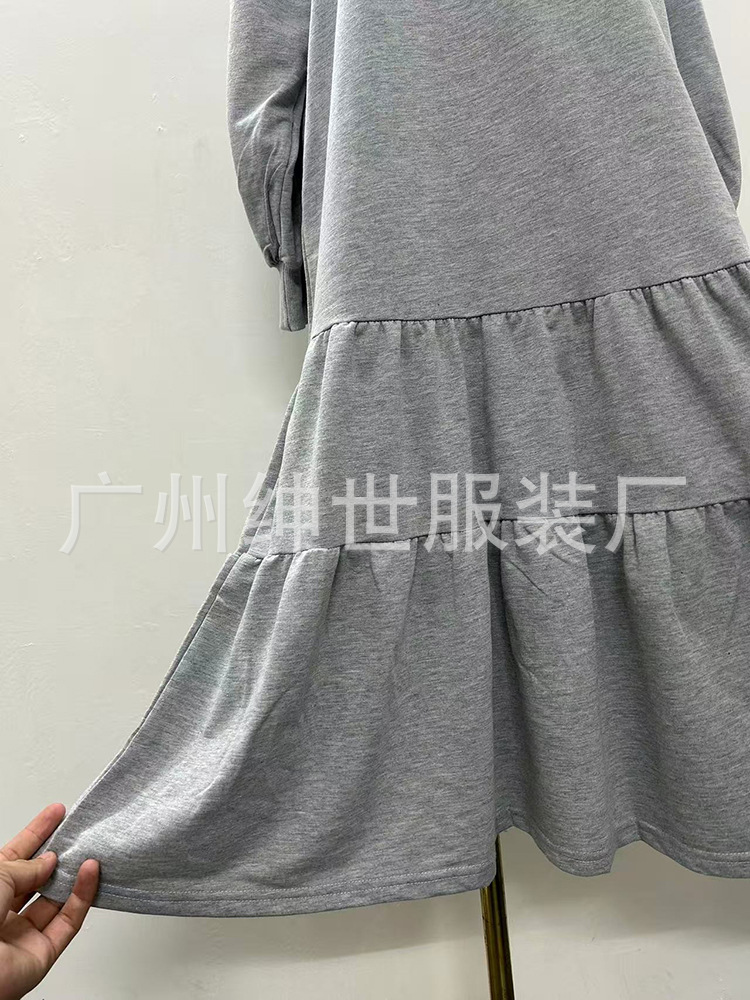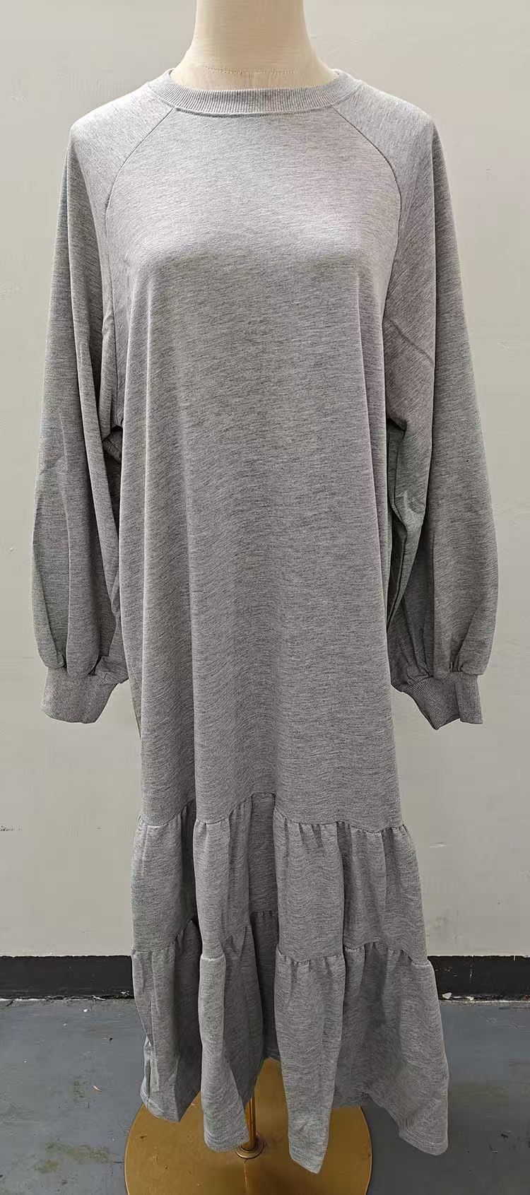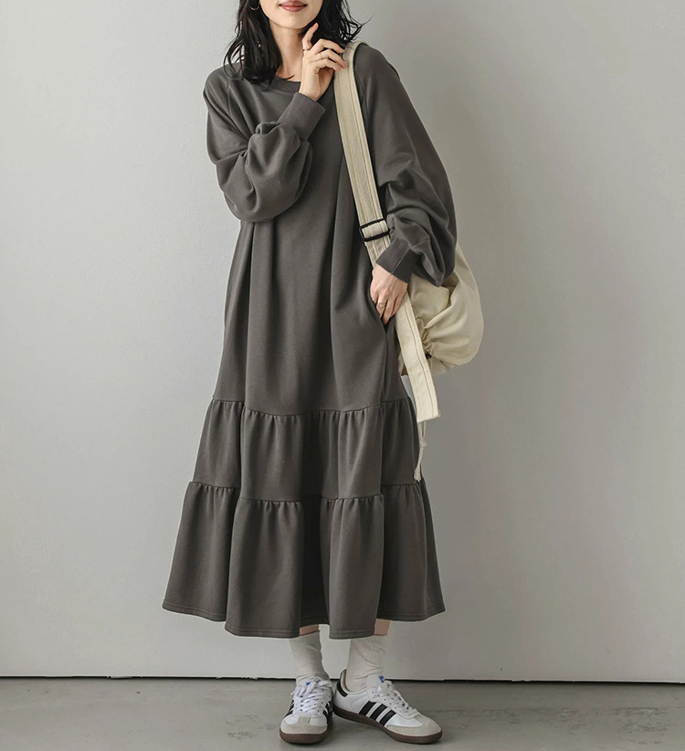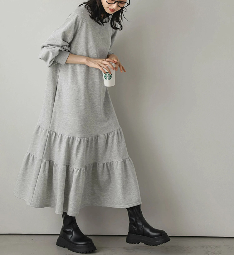 일본 가을 여성복 루즈핏 미디 기장 스플라이스 러플 스커트 스웨트셔츠 원피스 긴팔 무릎 아래 롱스커트
