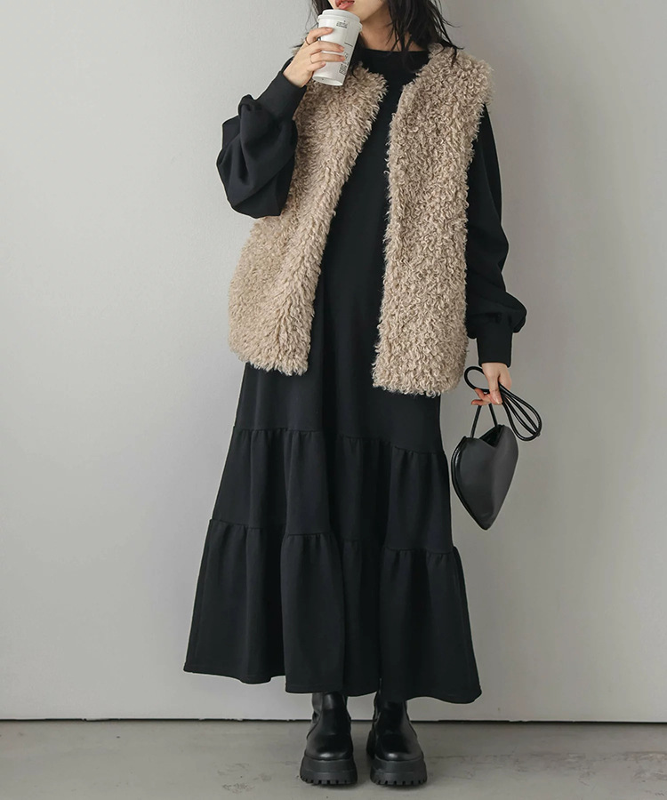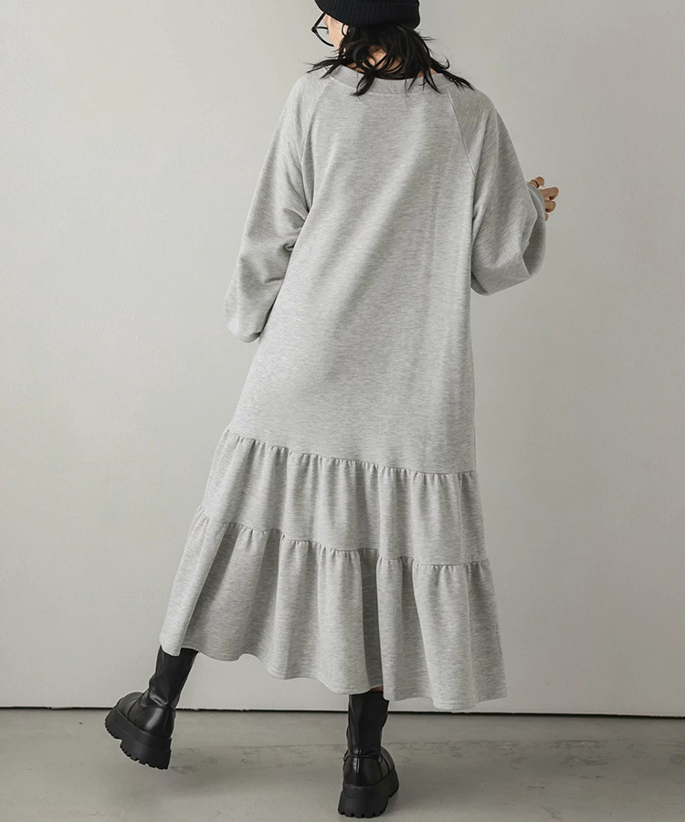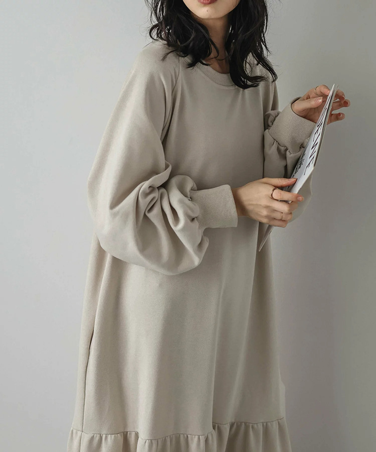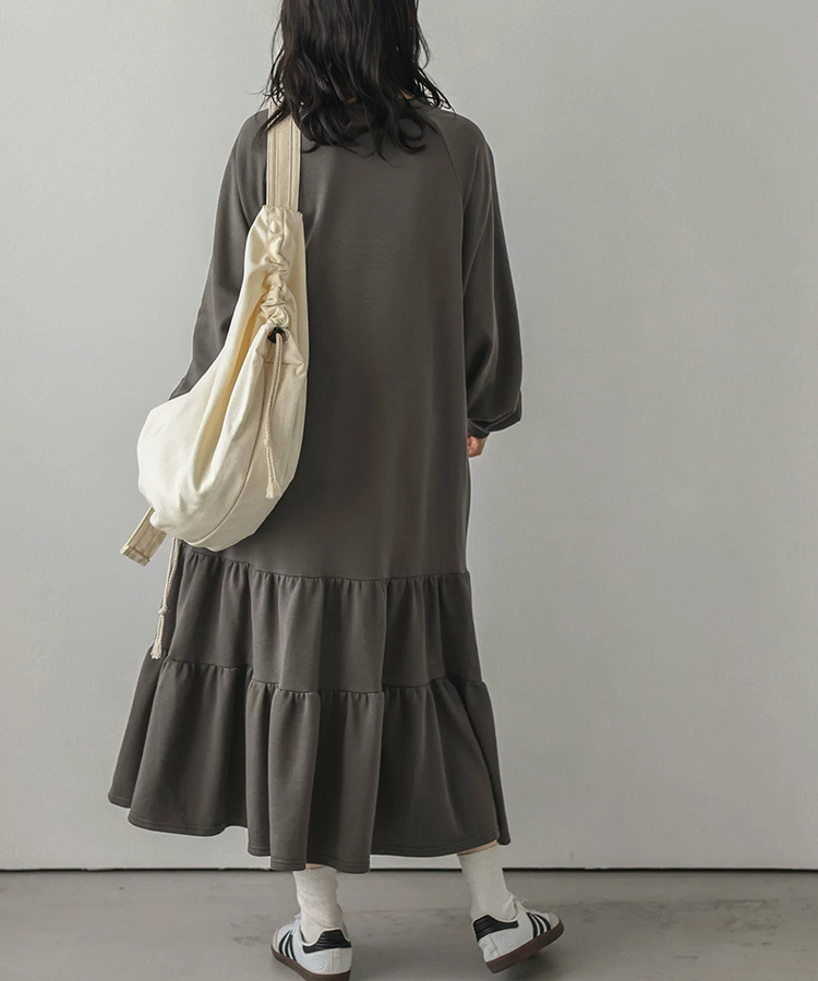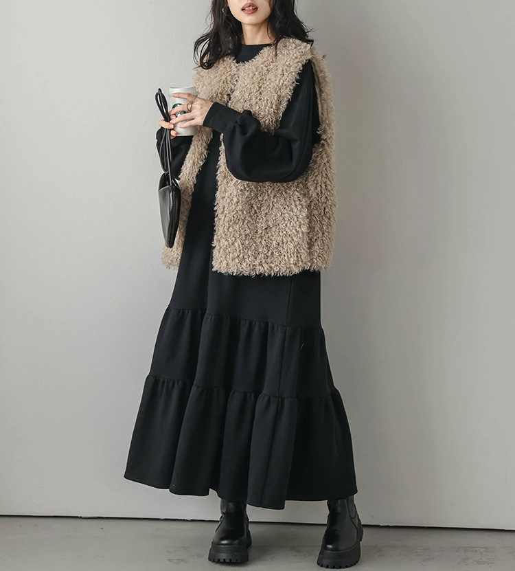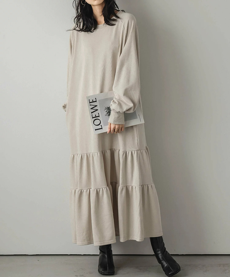 일본 가을 여성복 루즈핏 미디 기장 스플라이스 러플 스커트 스웨트셔츠 원피스 긴팔 무릎 아래 롱스커트