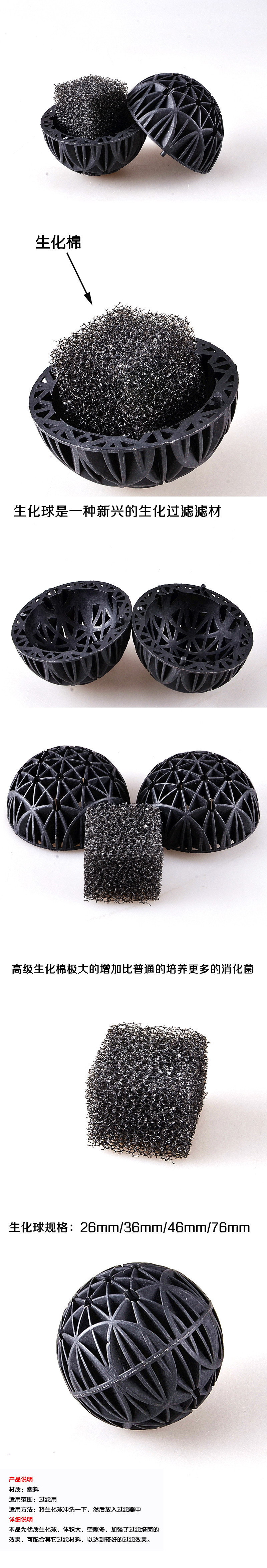 生化球是一种新兴的生化过滤滤材,其表面具有复杂的凹道纹理。当水滴从生化球表面流过的时候,水滴会沿着凹道改变方向,进入下一个生化球的凹道中,再次改变方向。因此,水滴穿过生化球堆的流程极大的加长,增加了硝化细菌的作用时间。内付高级生化棉极大的增加表面积比普通的生化球培养更多的消化菌。更加洁净水质。