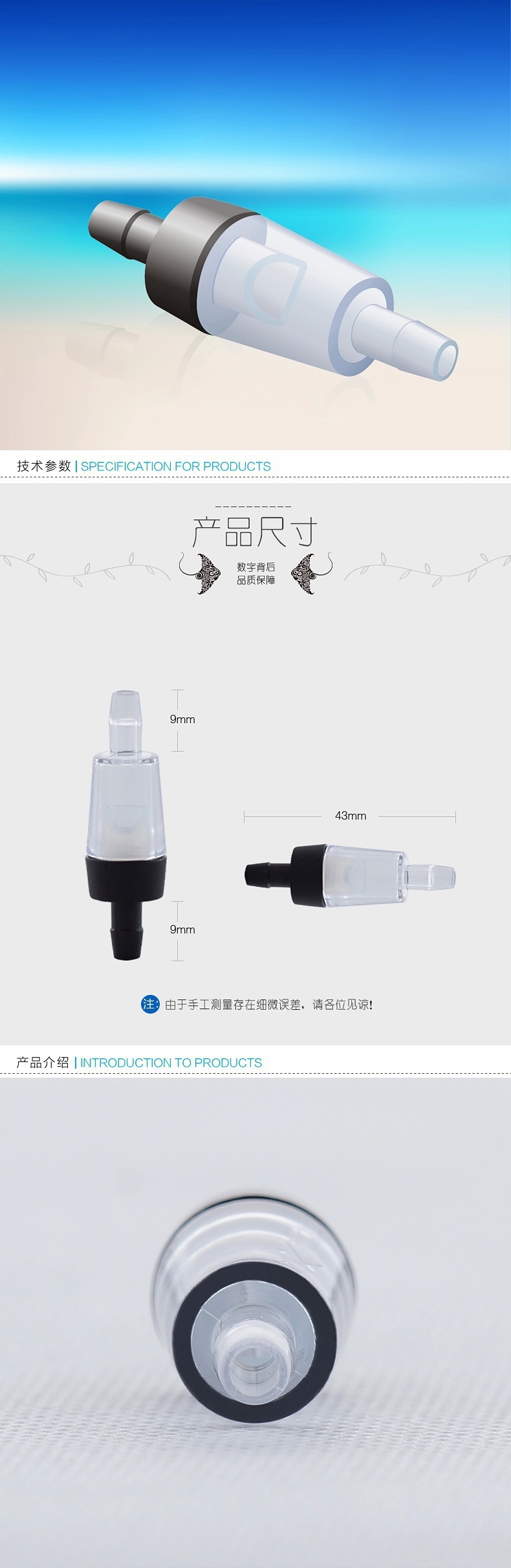 作用说明:用作充氧气泵因突然停止工作时内外压力差造成水流逆行,损坏充氧泵并使缸内水外溢形成财产损失。防止鱼缸内的水倒流入气泵,将气泵烧毁,避免危险,是气泵不可少的配件。