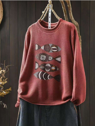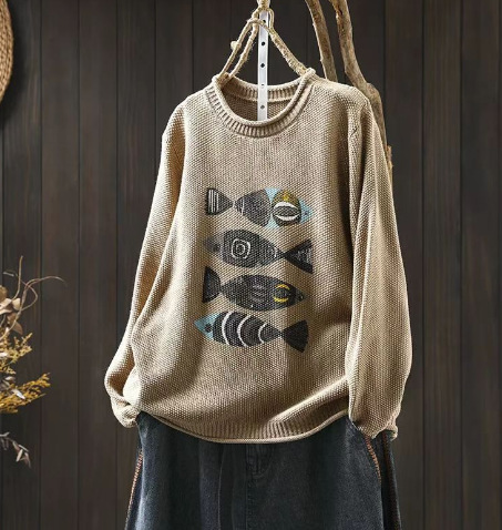 봄 새로운 빈티지 인쇄 코튼 니트 스웨터 여성용 라운드 넥 헤지 느슨한 니트 스웨터스토어 가기