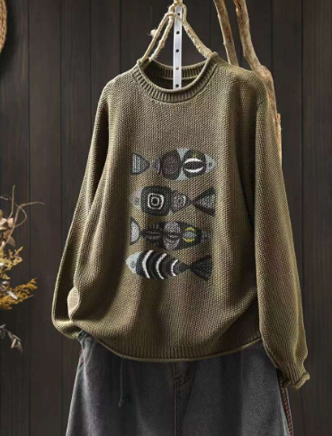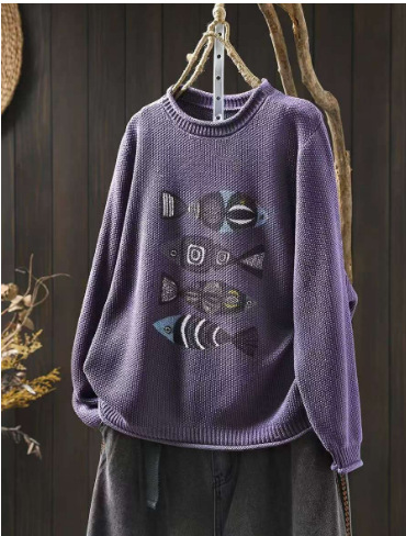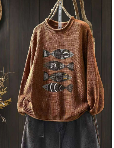 봄 새로운 빈티지 인쇄 코튼 니트 스웨터 여성용 라운드 넥 헤지 느슨한 니트 스웨터