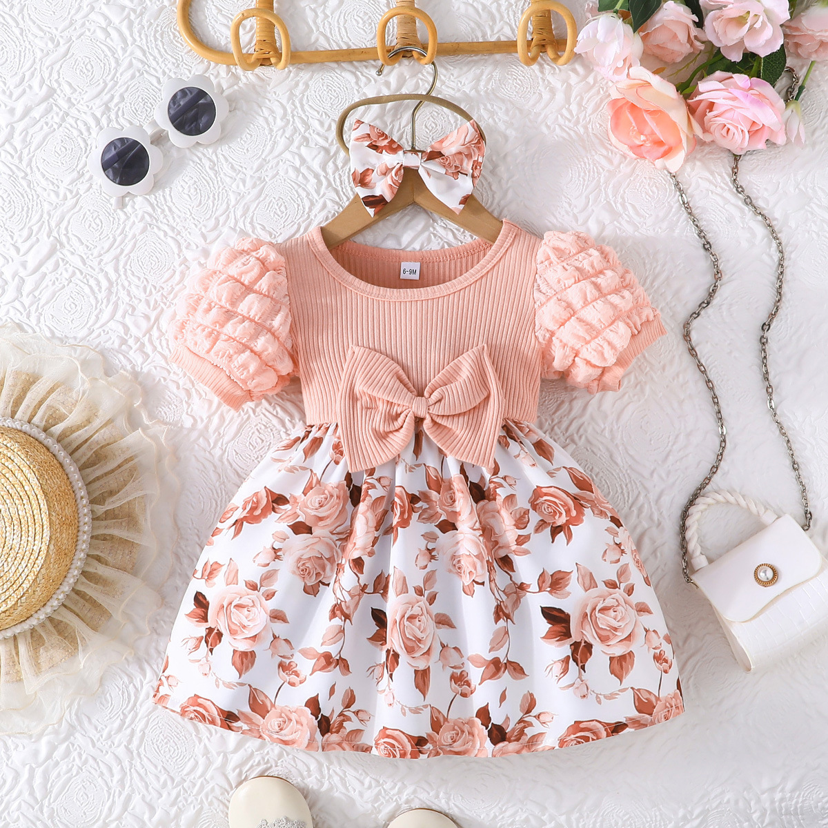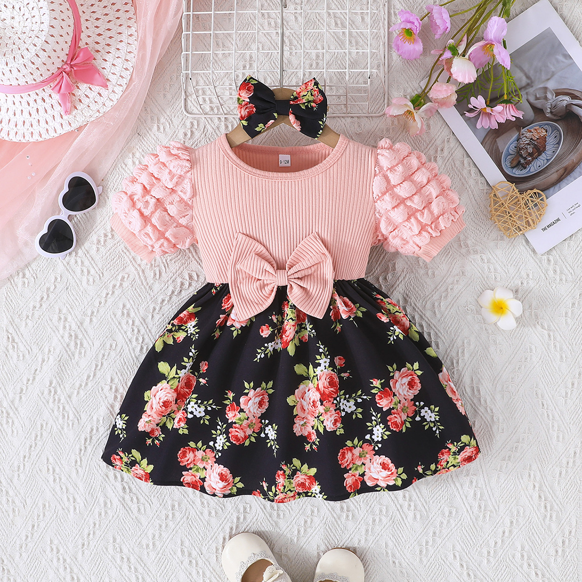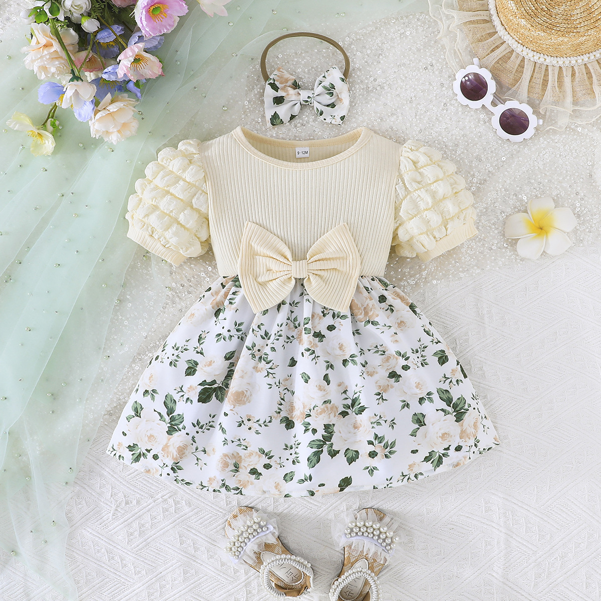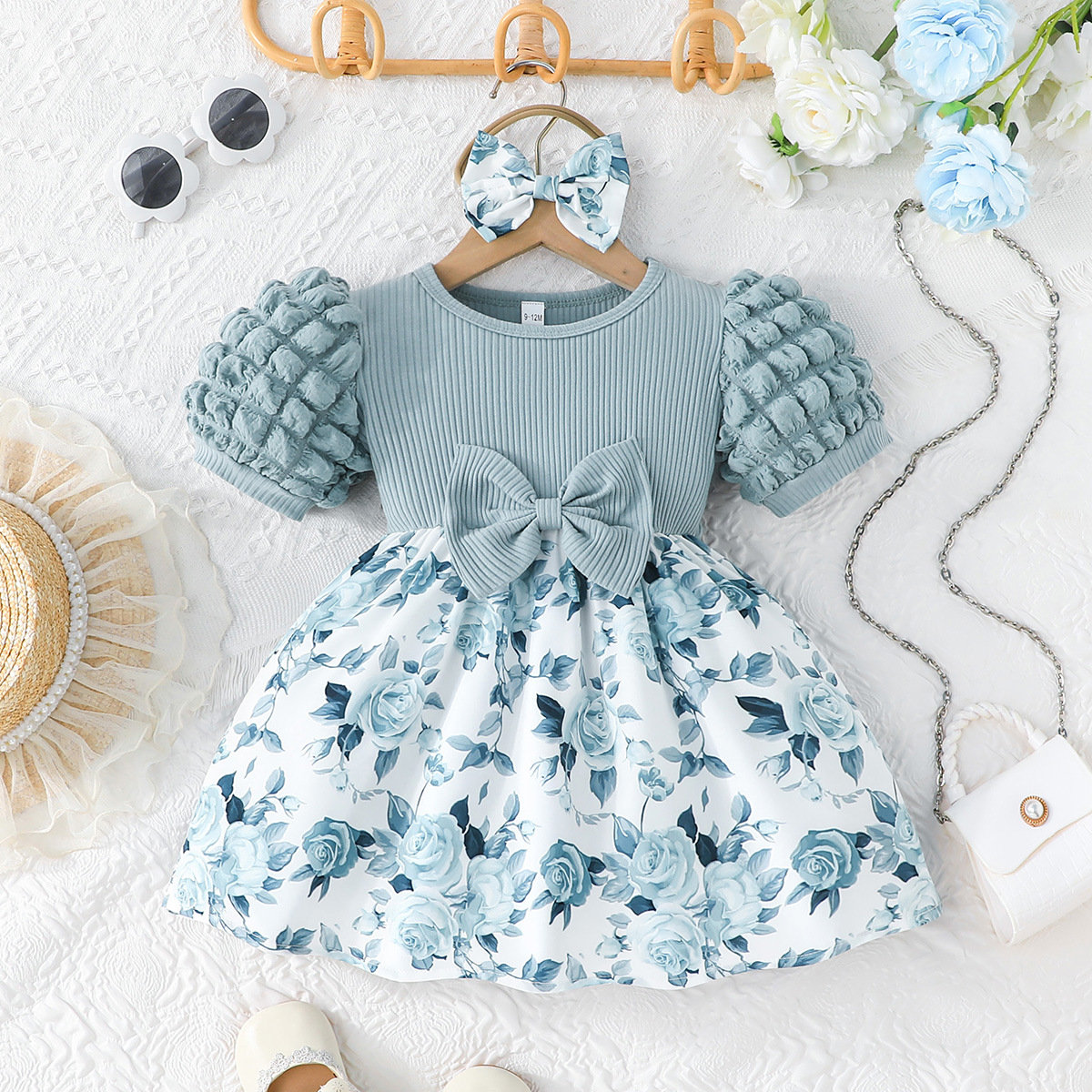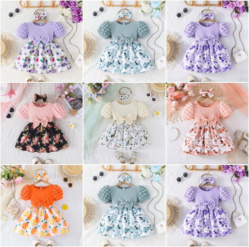 2025 달콤한 아기 소녀 레이디 활 장식 꽃 원피스 터번 유럽과 미국의 국경 여름 새로운 스타일스토어 가기
