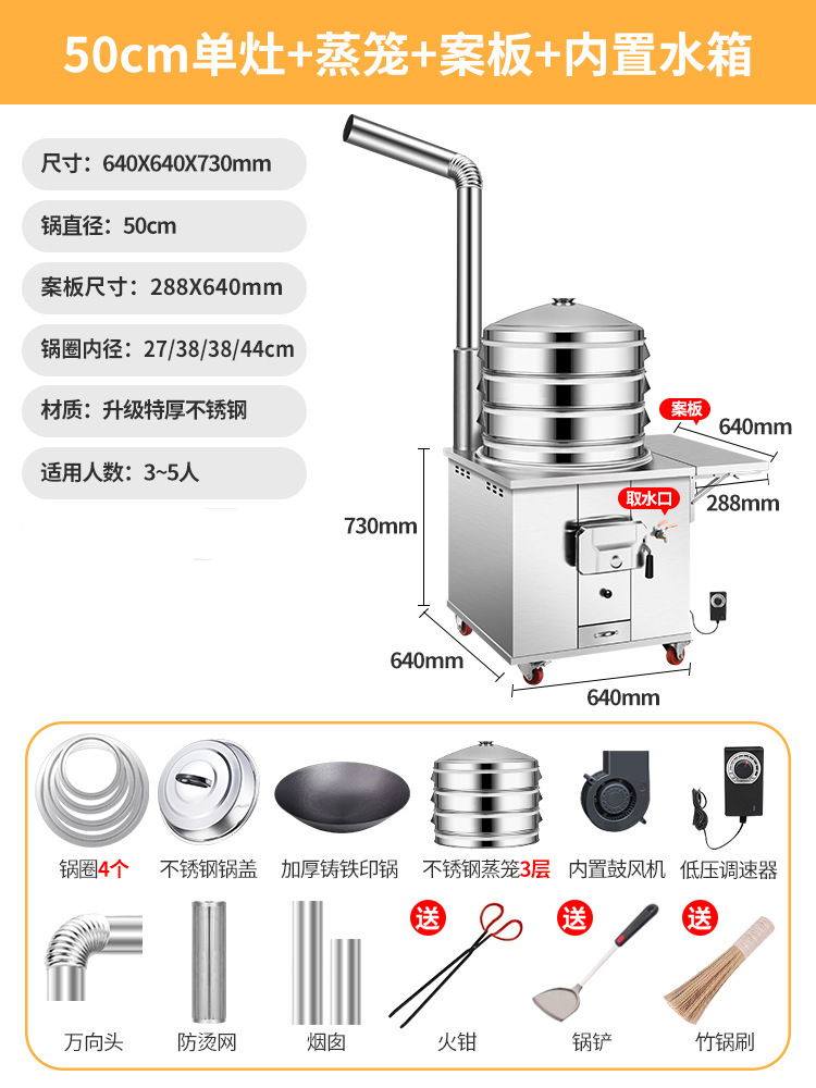 • 64CM 싱글 스토브 + 더블 도마 + 내장형 물 탱크 + 3단 찜기 + 크고 작은 냄비 링