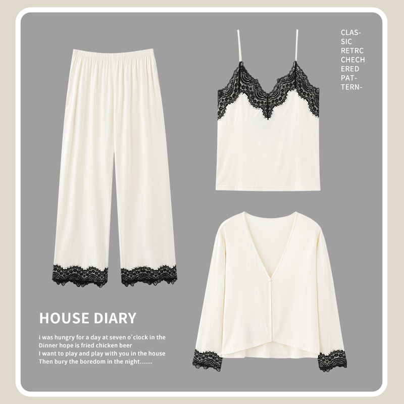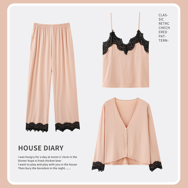2025 새로운 모달 여성 잠옷 긴 소매 바지 봄 바느질 섹시한 슬링 홈 옷 3 피스 세트스토어 가기