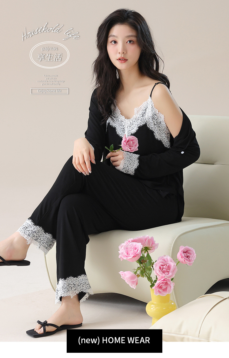 2025 새로운 모달 여성 잠옷 긴 소매 바지 봄 바느질 섹시한 슬링 홈 옷 3 피스 세트
