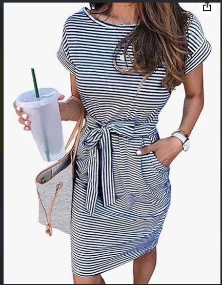 2024 유럽과 미국의 국경 간 AliExpress 아마존 뜨거운 폭발 둥근 목 짧은 소매 허리 줄무늬 원피스 여성 의류스토어 가기