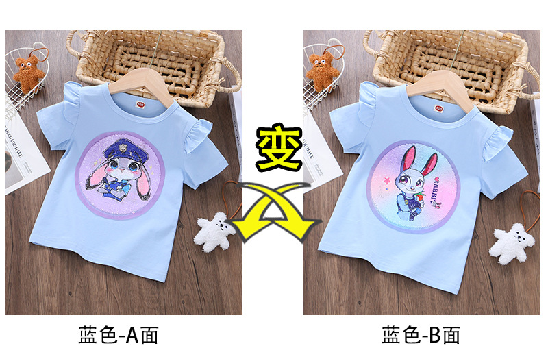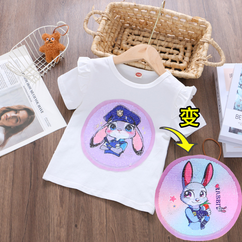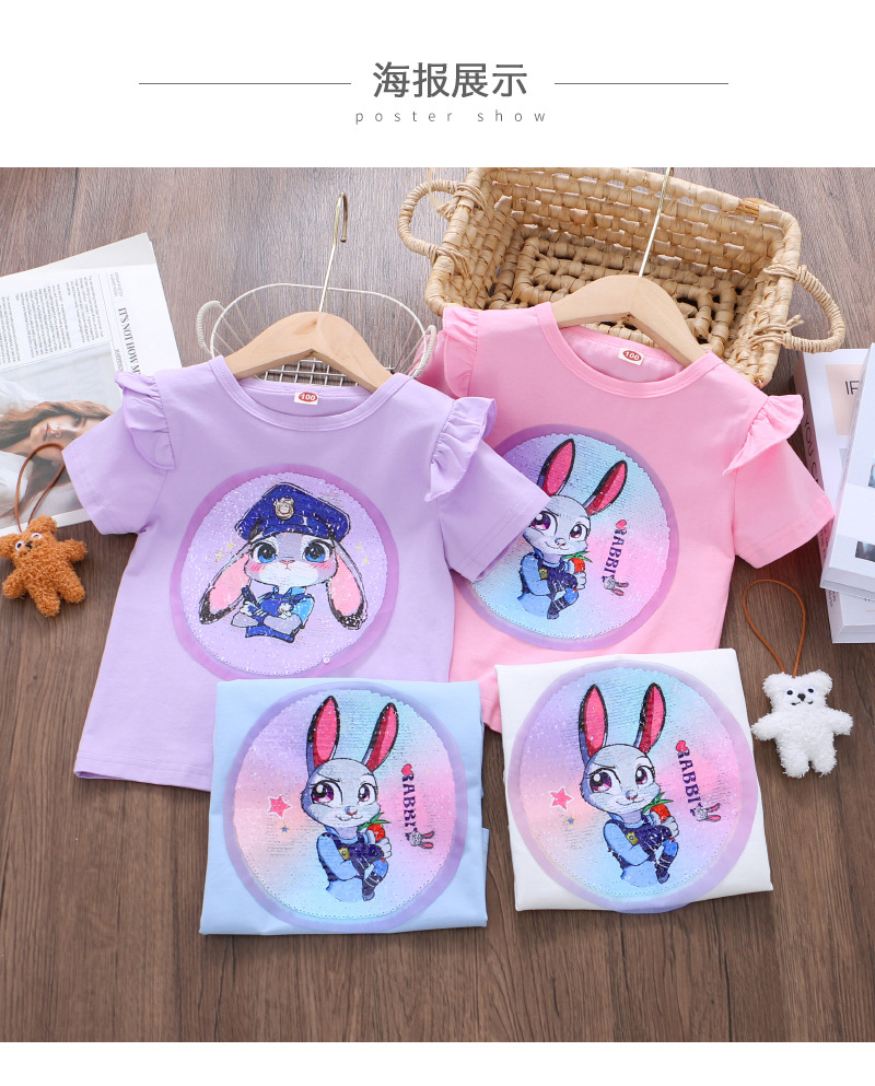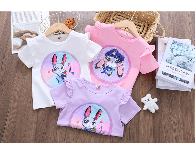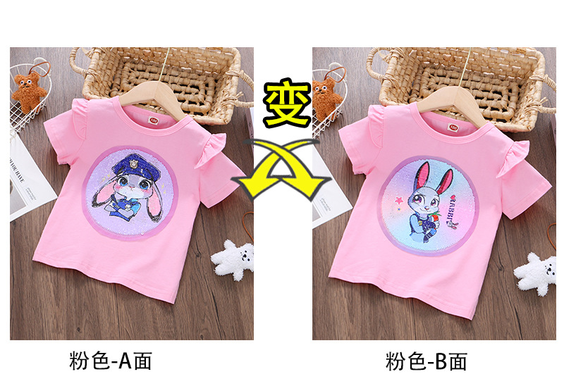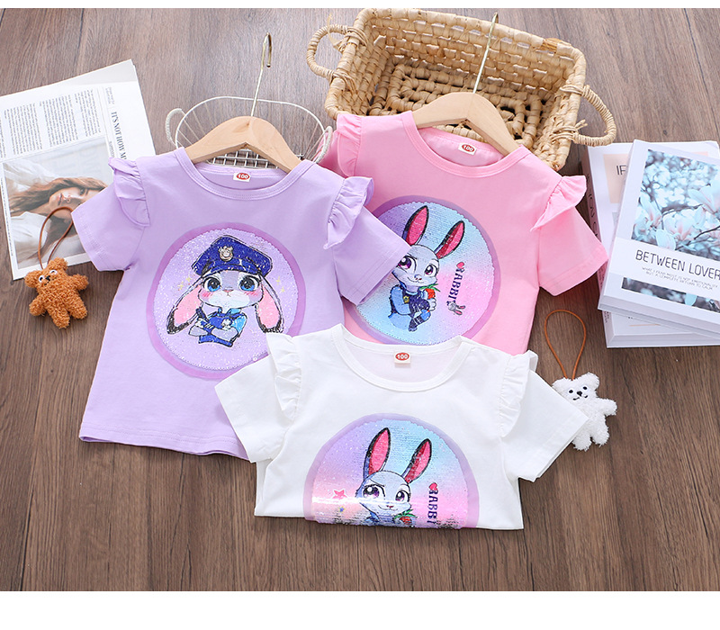 어린이 여름 반팔 2025 새로운 스타일 소녀 토끼 프린트 플라잉 슬리브 티셔츠 아기 귀여운 양면 색상 변경 탑스토어 가기